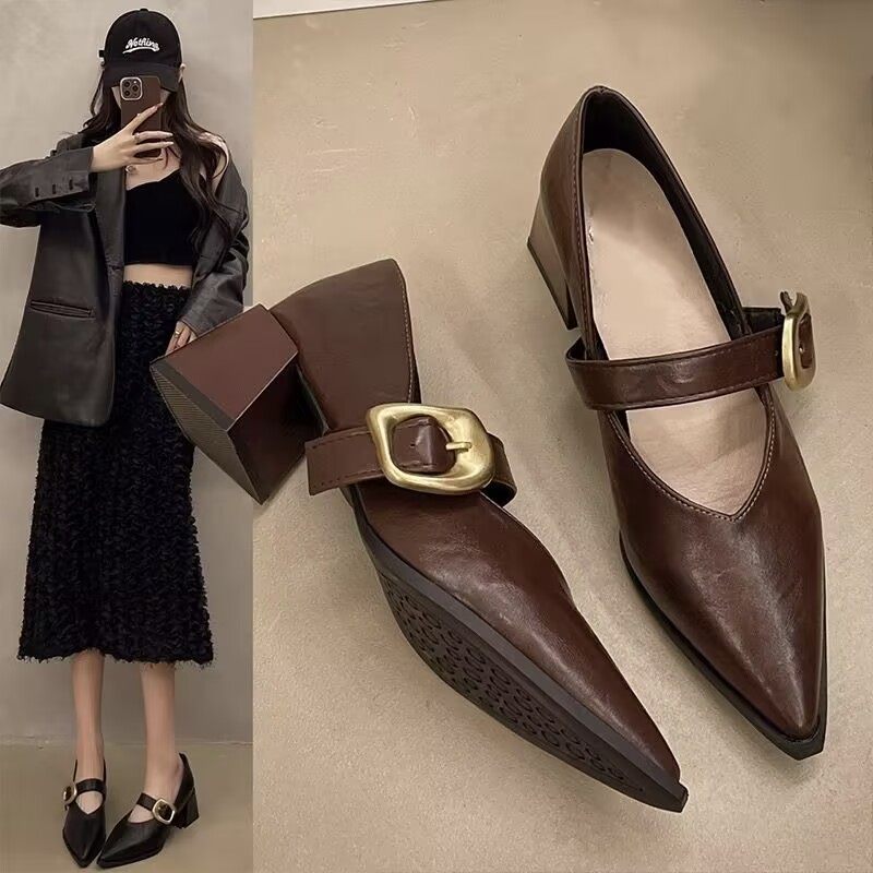 品牌真皮复古法式一字带扣粗跟小单鞋女浅口尖头气质百搭玛丽珍鞋