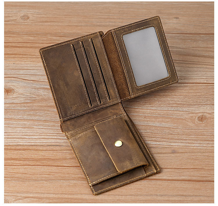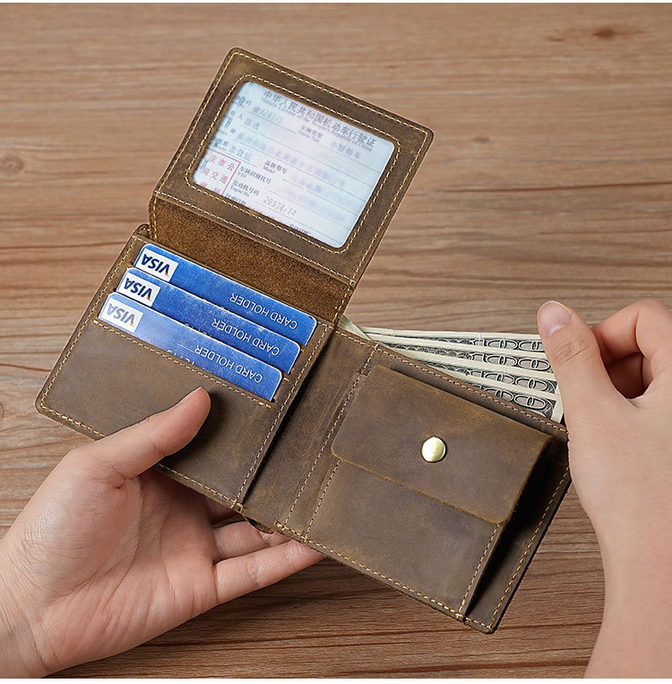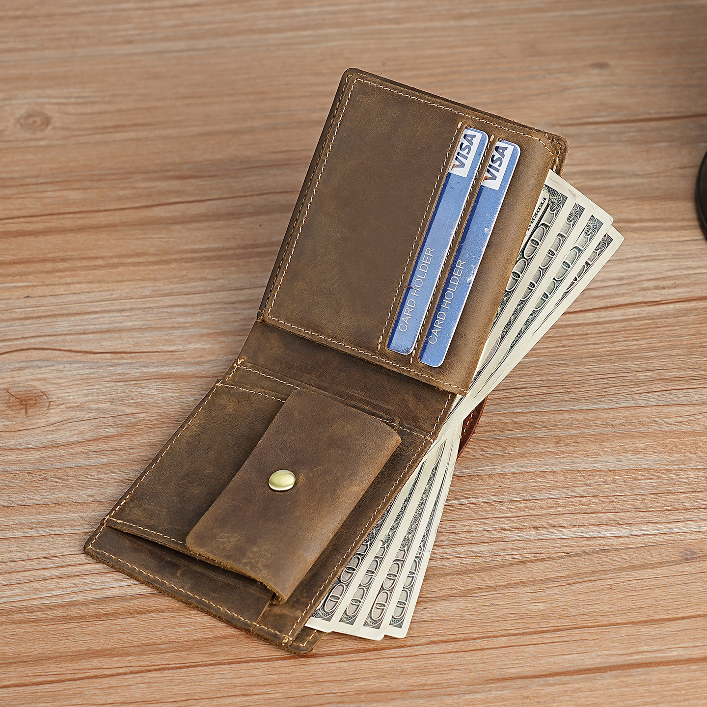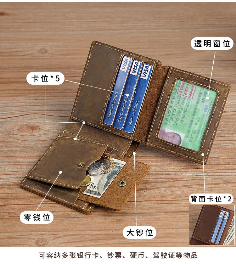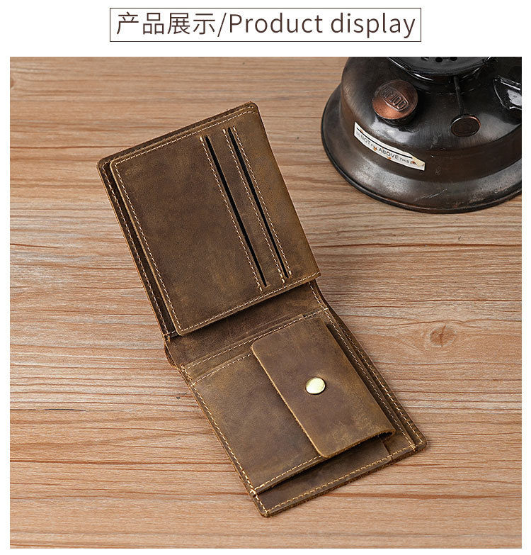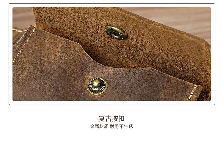 热卖复古疯马皮男士钱包多功能带按扣硬币零钱袋跨境全头层牛皮钱包男