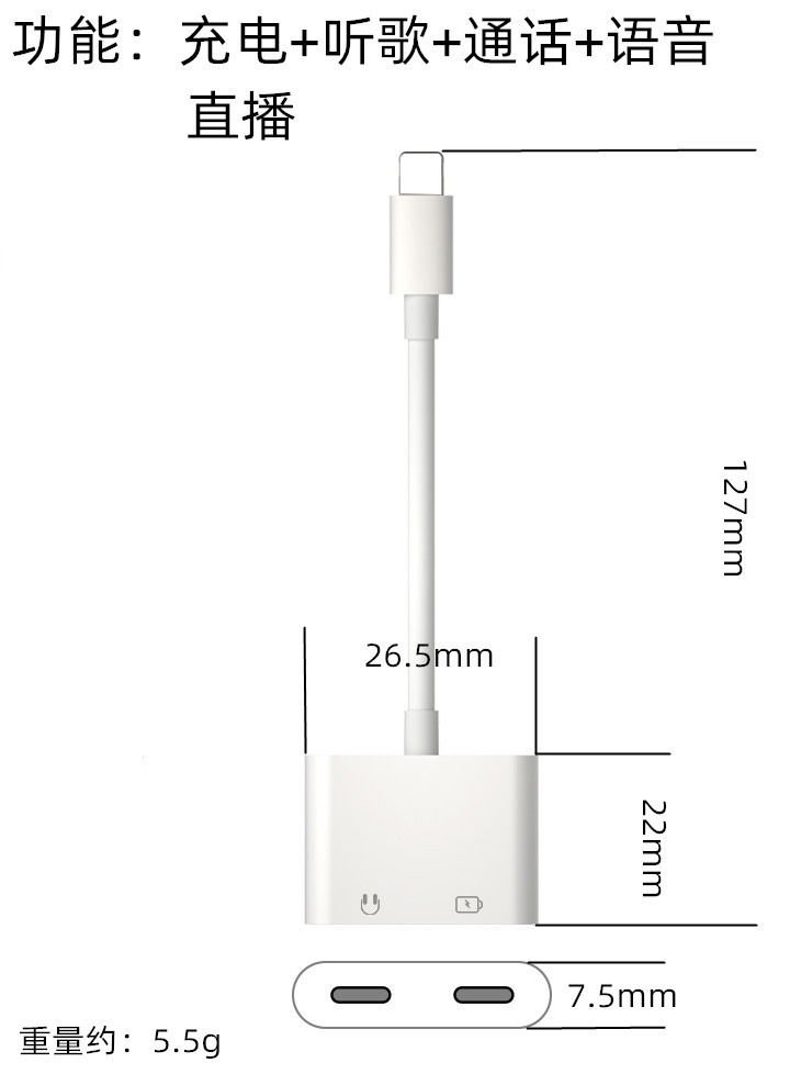 热卖苹果二合一转接头耳机充电双lightning转换头适用于苹果 iphone
