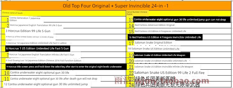 热卖绿色兵团金身不死版老四强24合1双人FC游戏8位黄卡带无限命魂斗罗