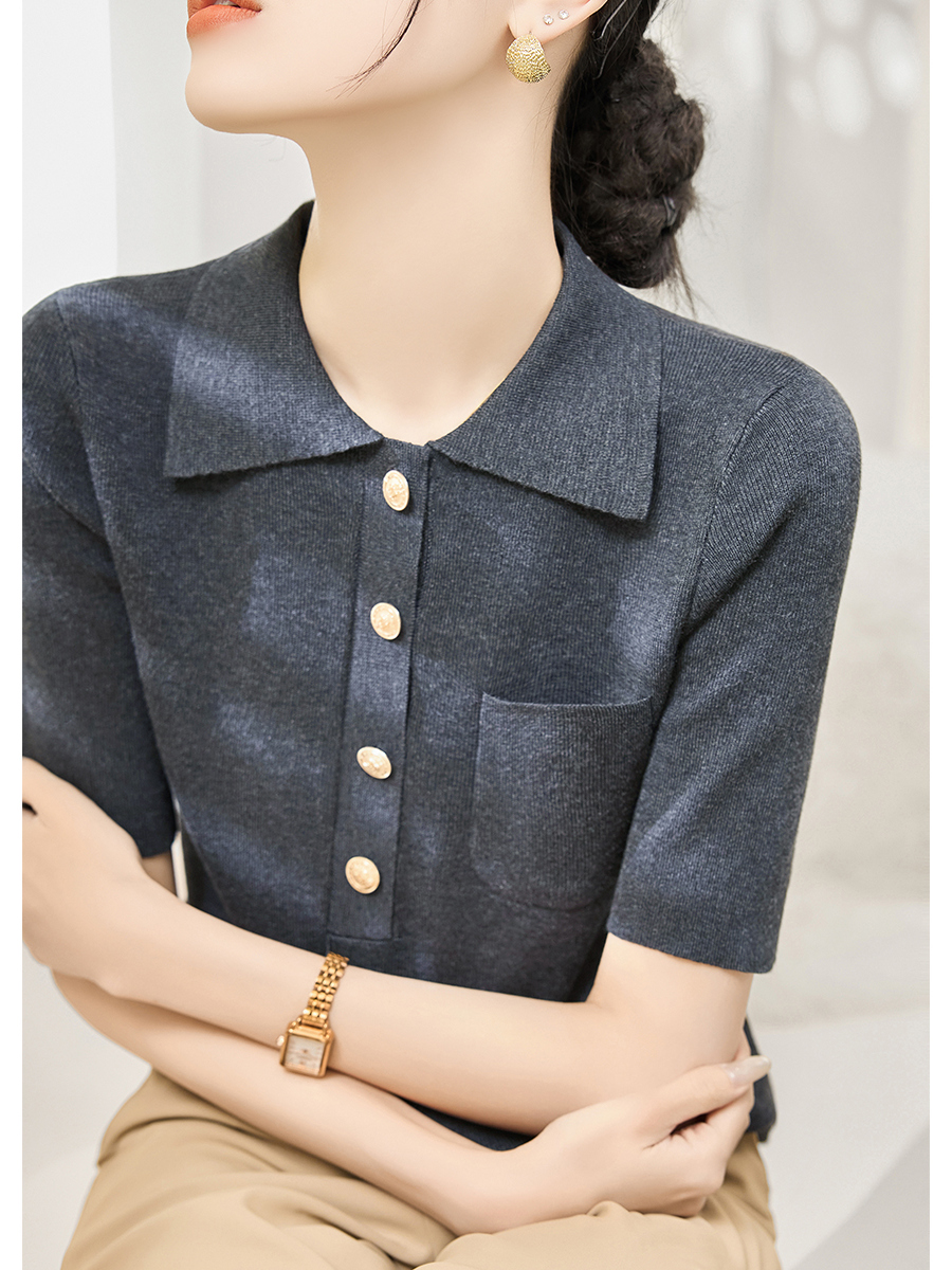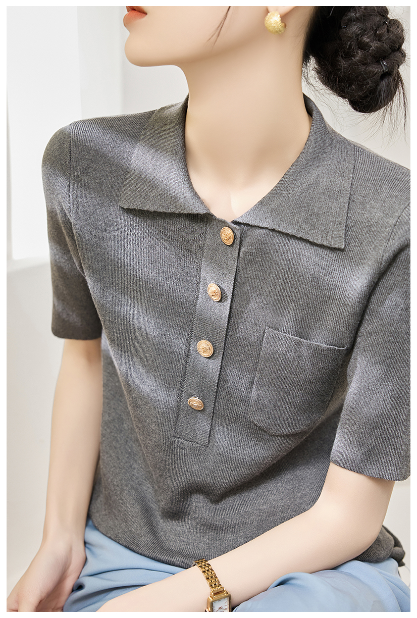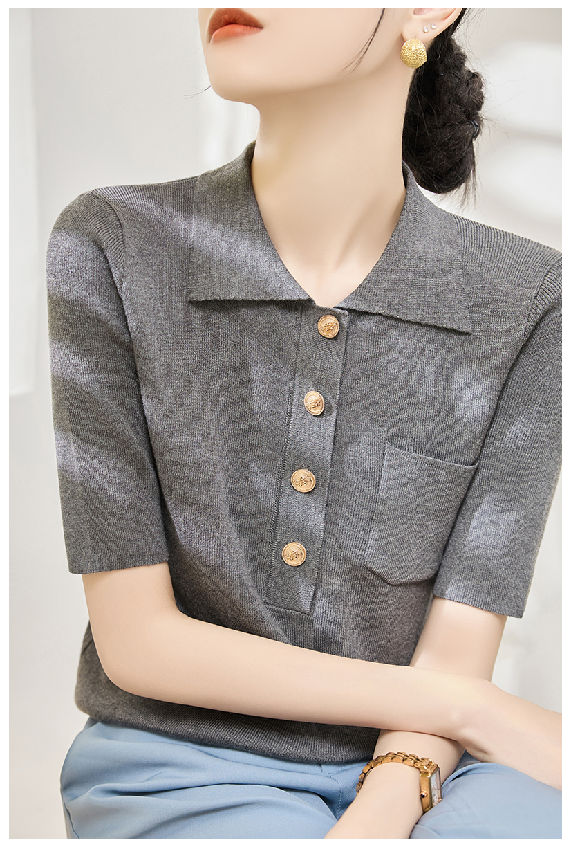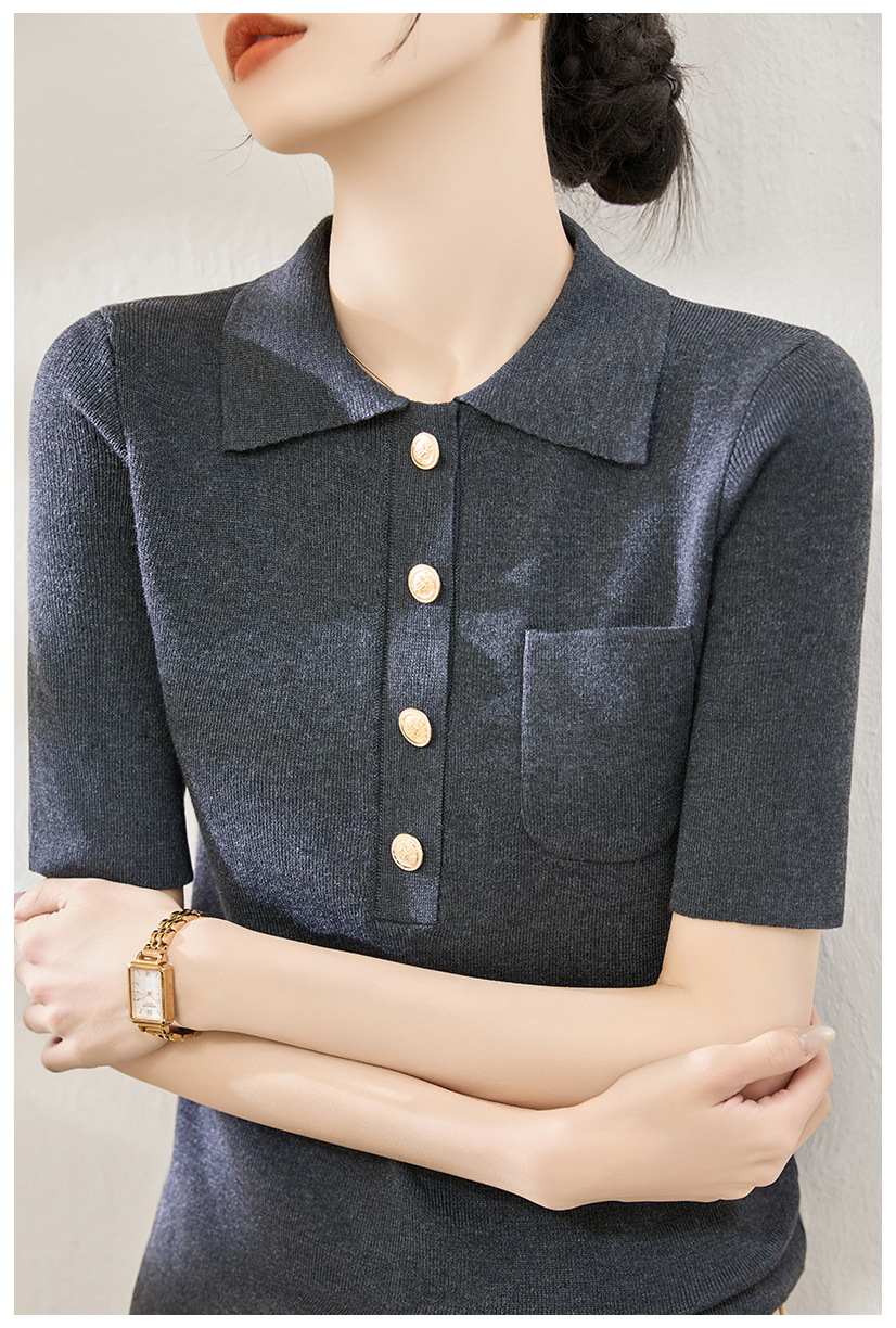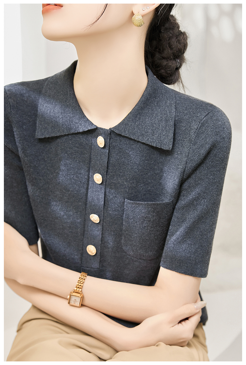 热卖2025年夏季新款女装深色宽松显瘦短袖针织衫气质翻领纽扣T恤上衣