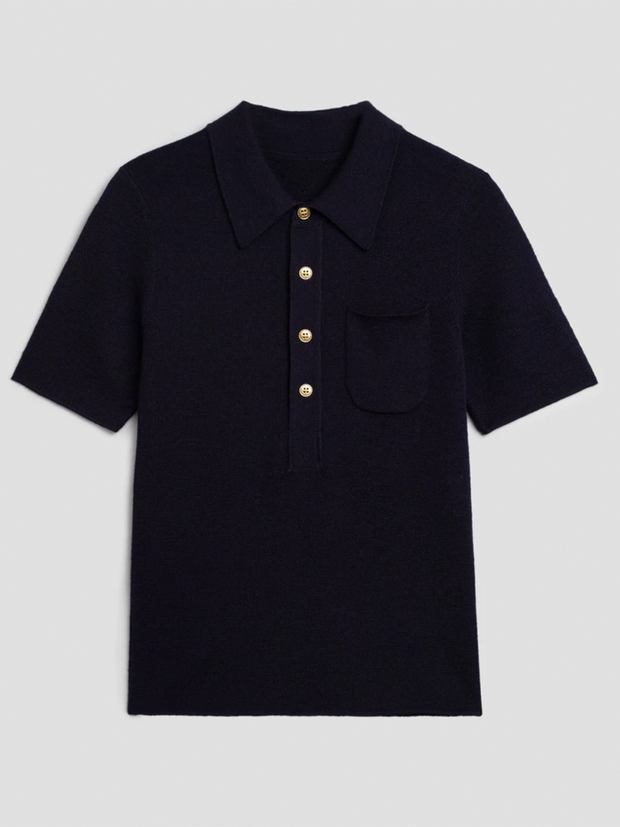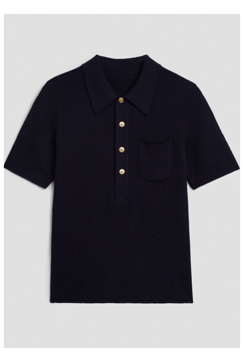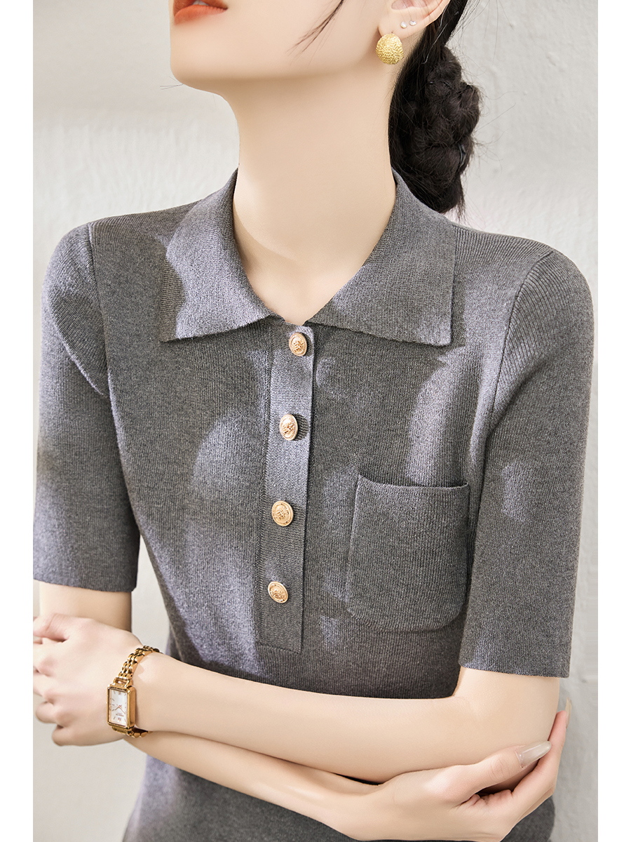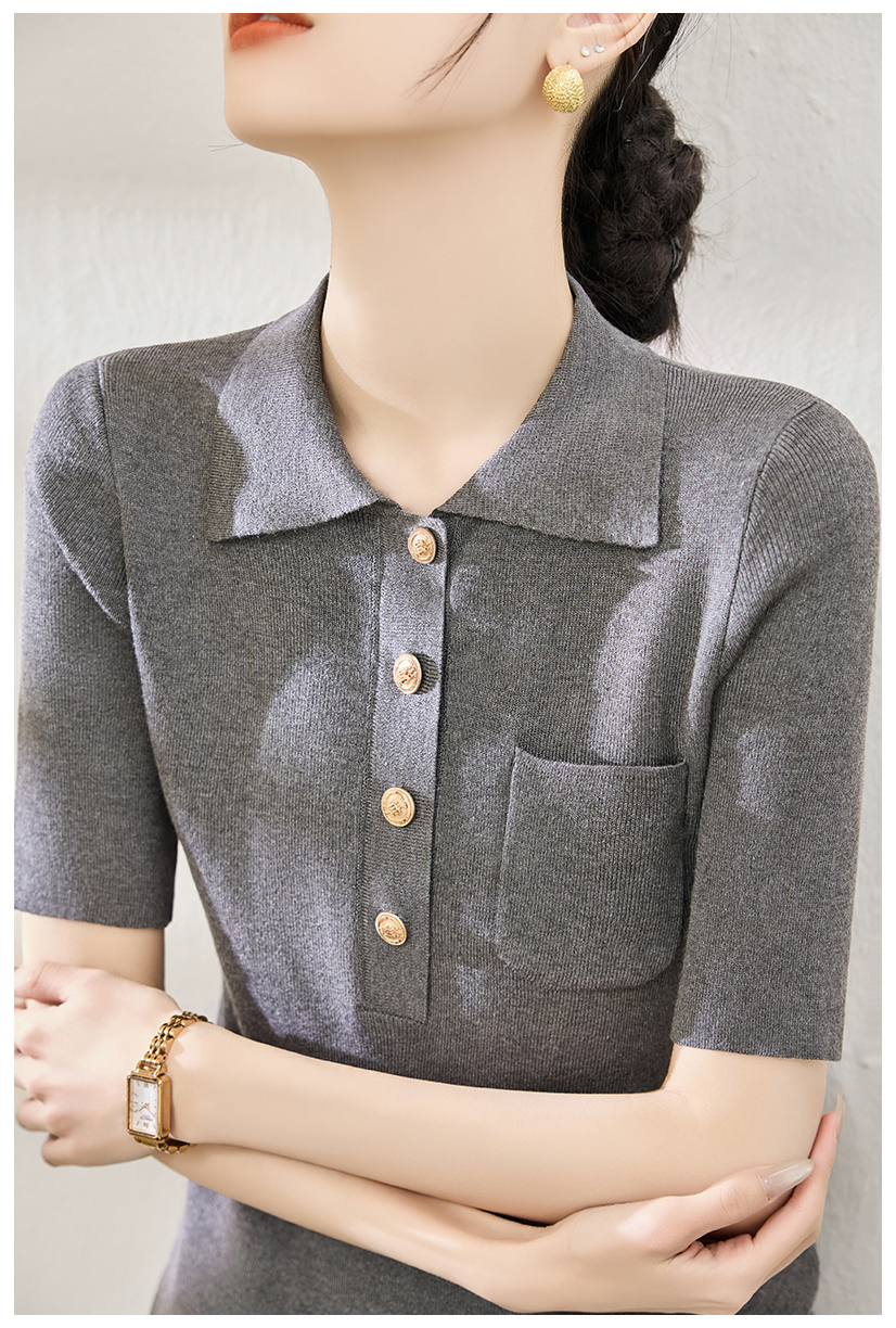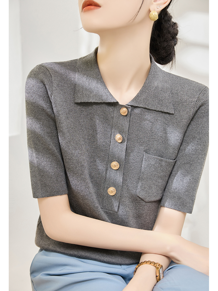 热卖2025年夏季新款女装深色宽松显瘦短袖针织衫气质翻领纽扣T恤上衣