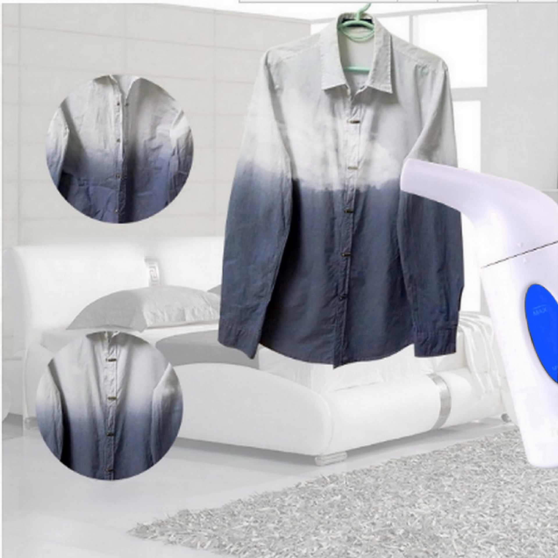 本产品水箱与喷汽一体,小巧便携,一按开关就可使用,菜鸟瞬间变成烫衣大师。