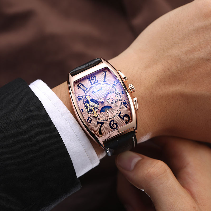 古驼热销男士手表酒桶型表盘全自动机械手表皮带星晨陀飞轮手男表