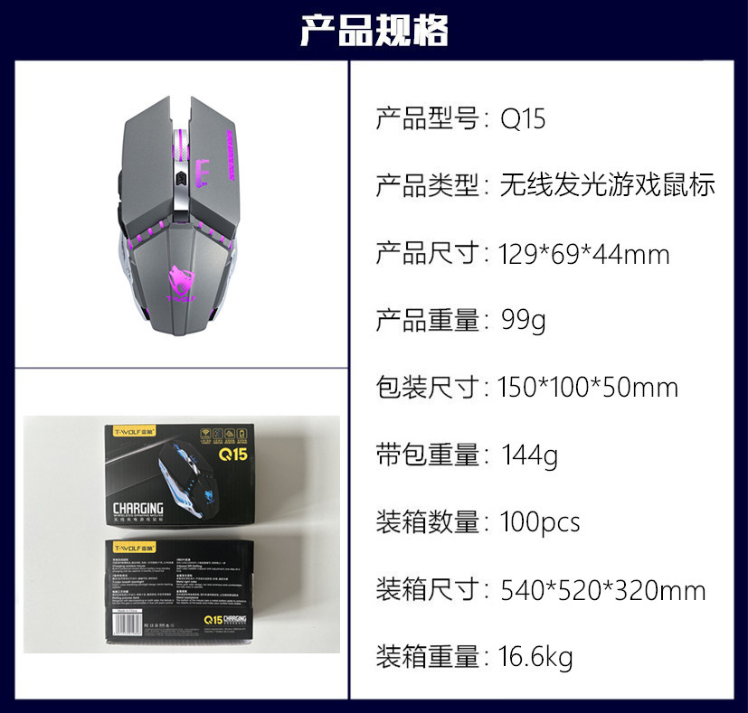 热卖T-WOLF雷狼Q15无线鼠标充电商务办公发光机械鼠标亚马逊ebay跨境