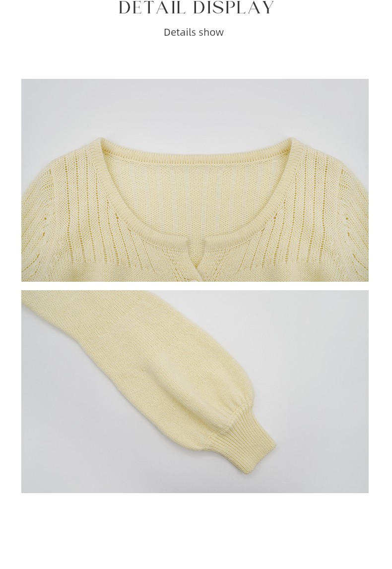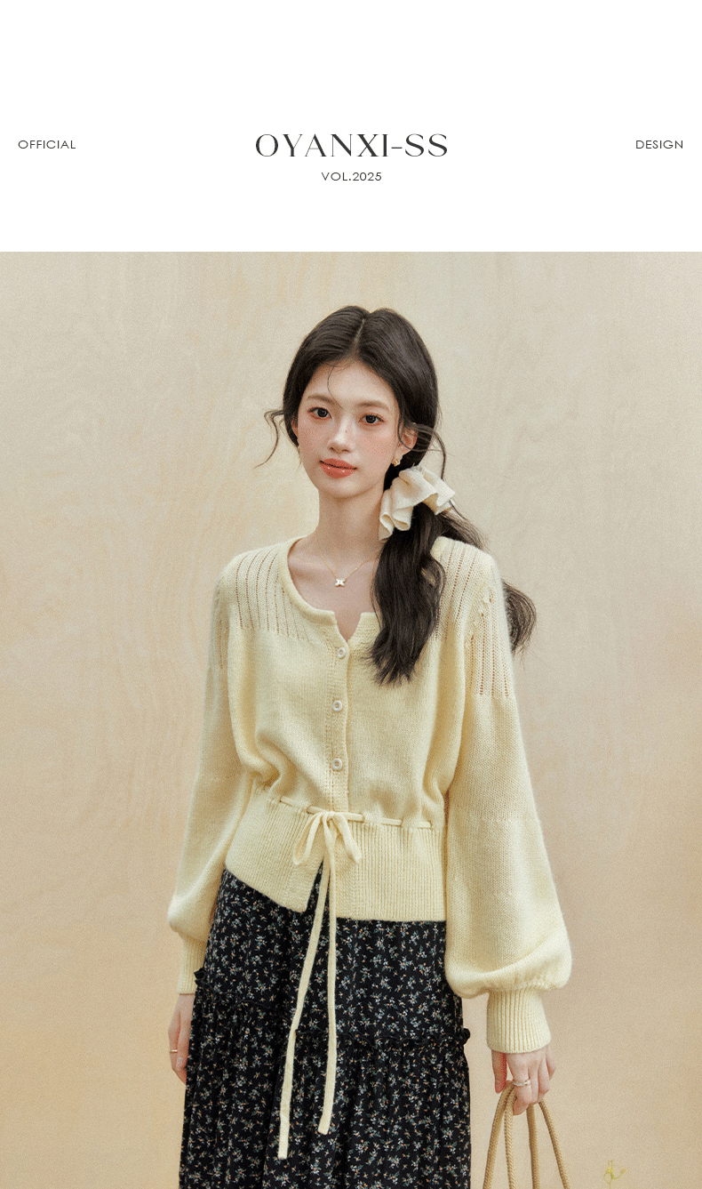 热卖欧阳喜《玉米姜饼》法式黄色U领长袖开衫春装上衣女收腰毛针织衫