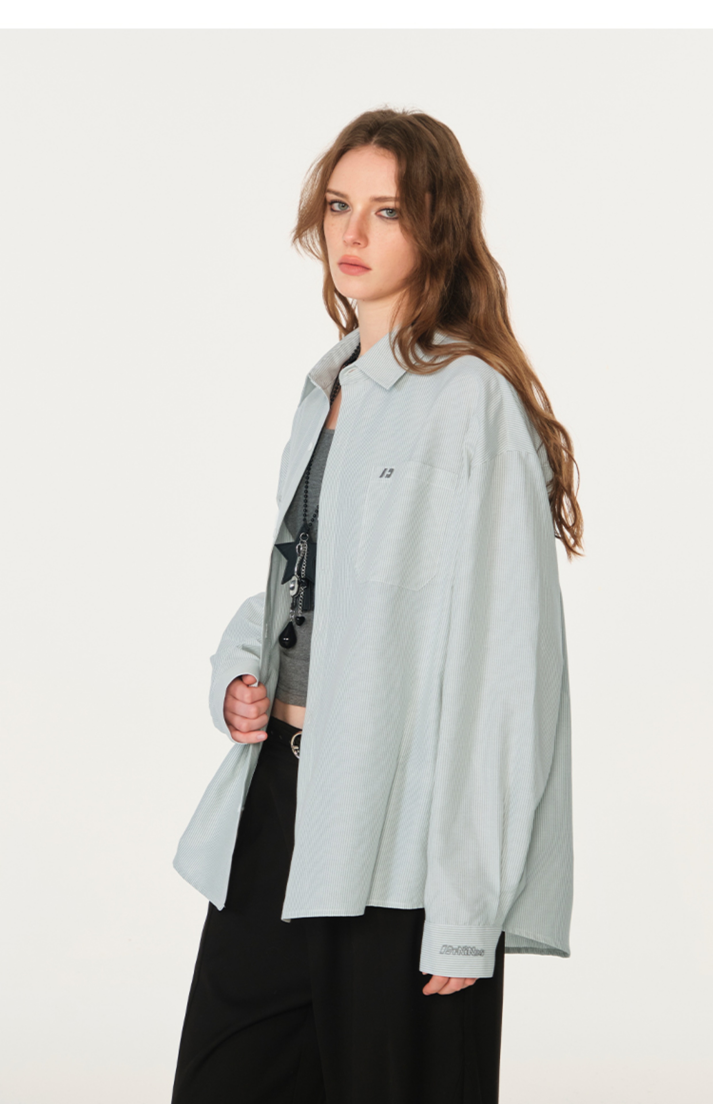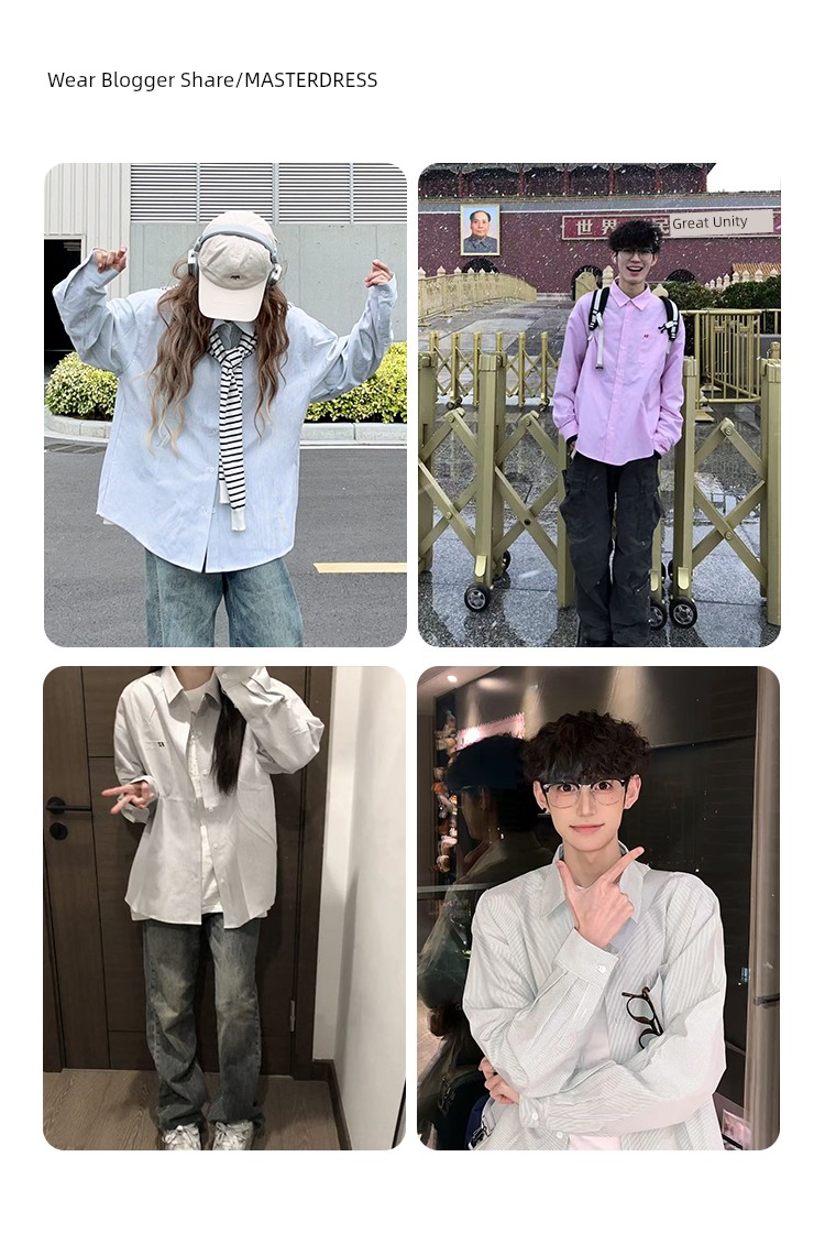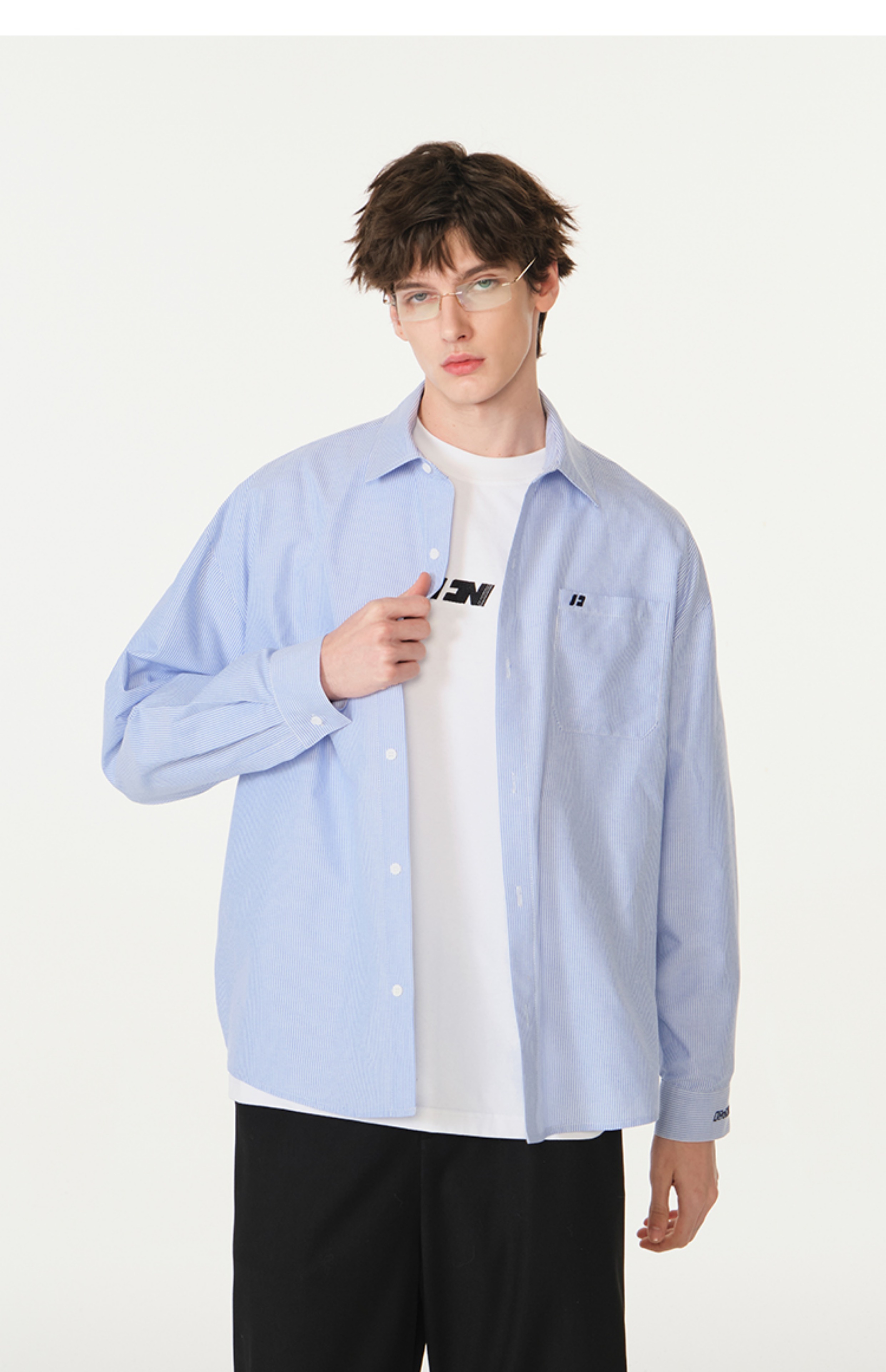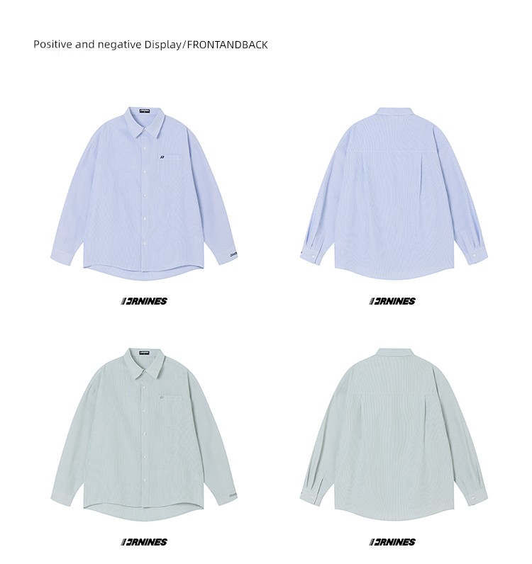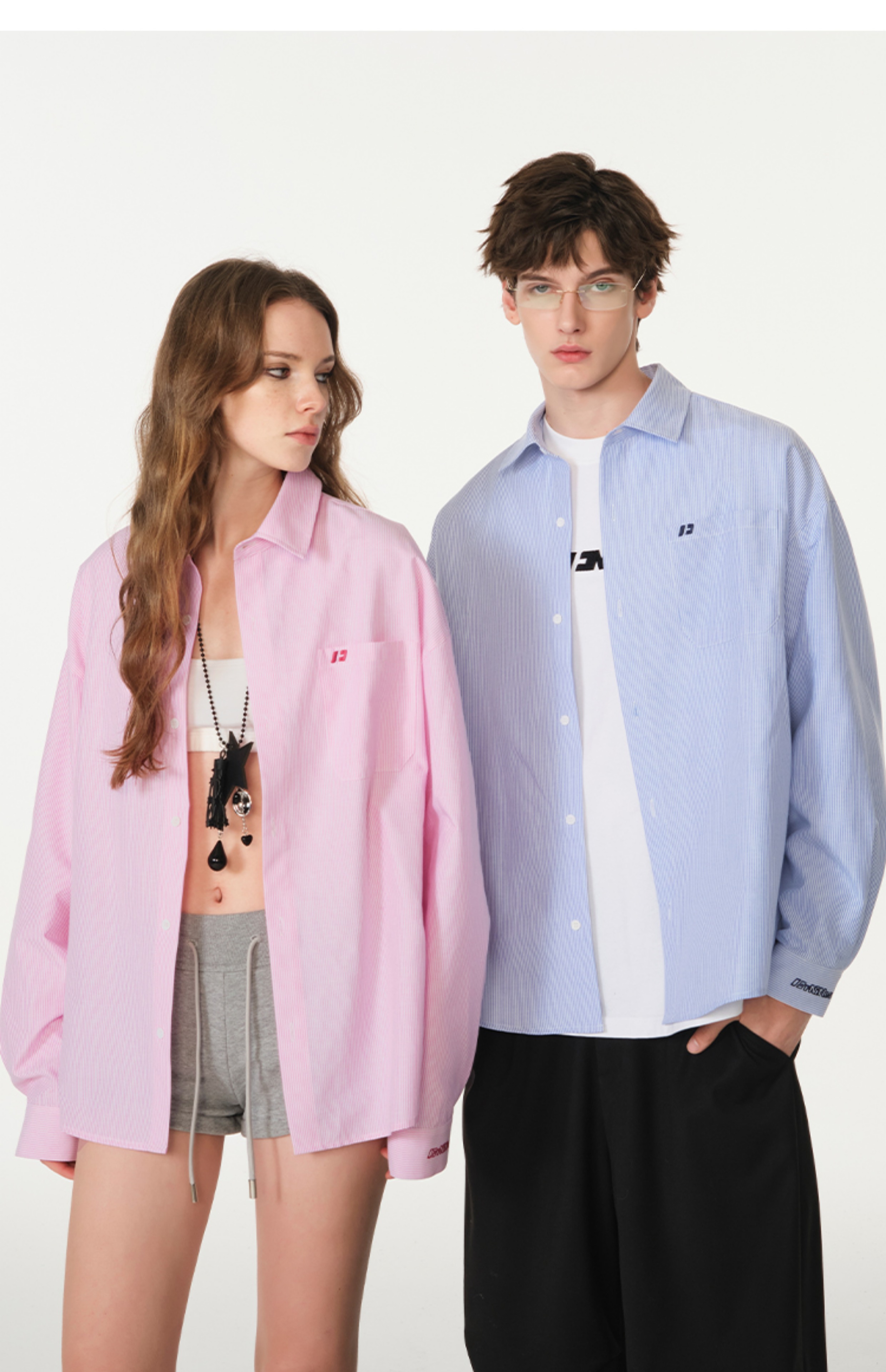 热卖FORNINES刺绣竖条纹蓝色长袖衬衫男女情侣装上衣潮牌春秋休闲外套