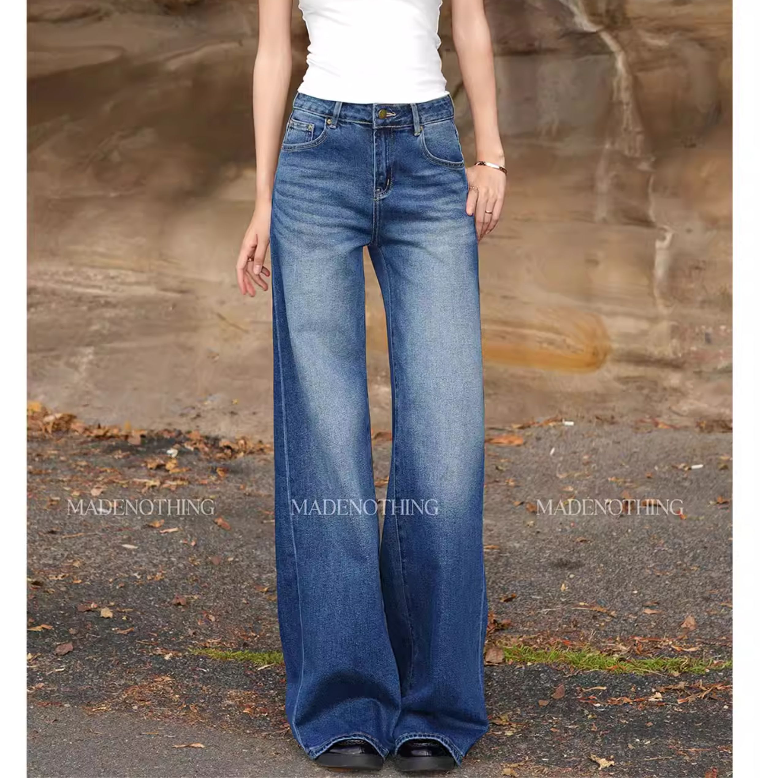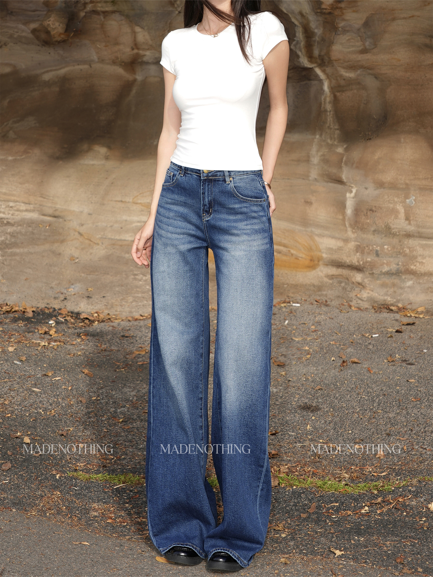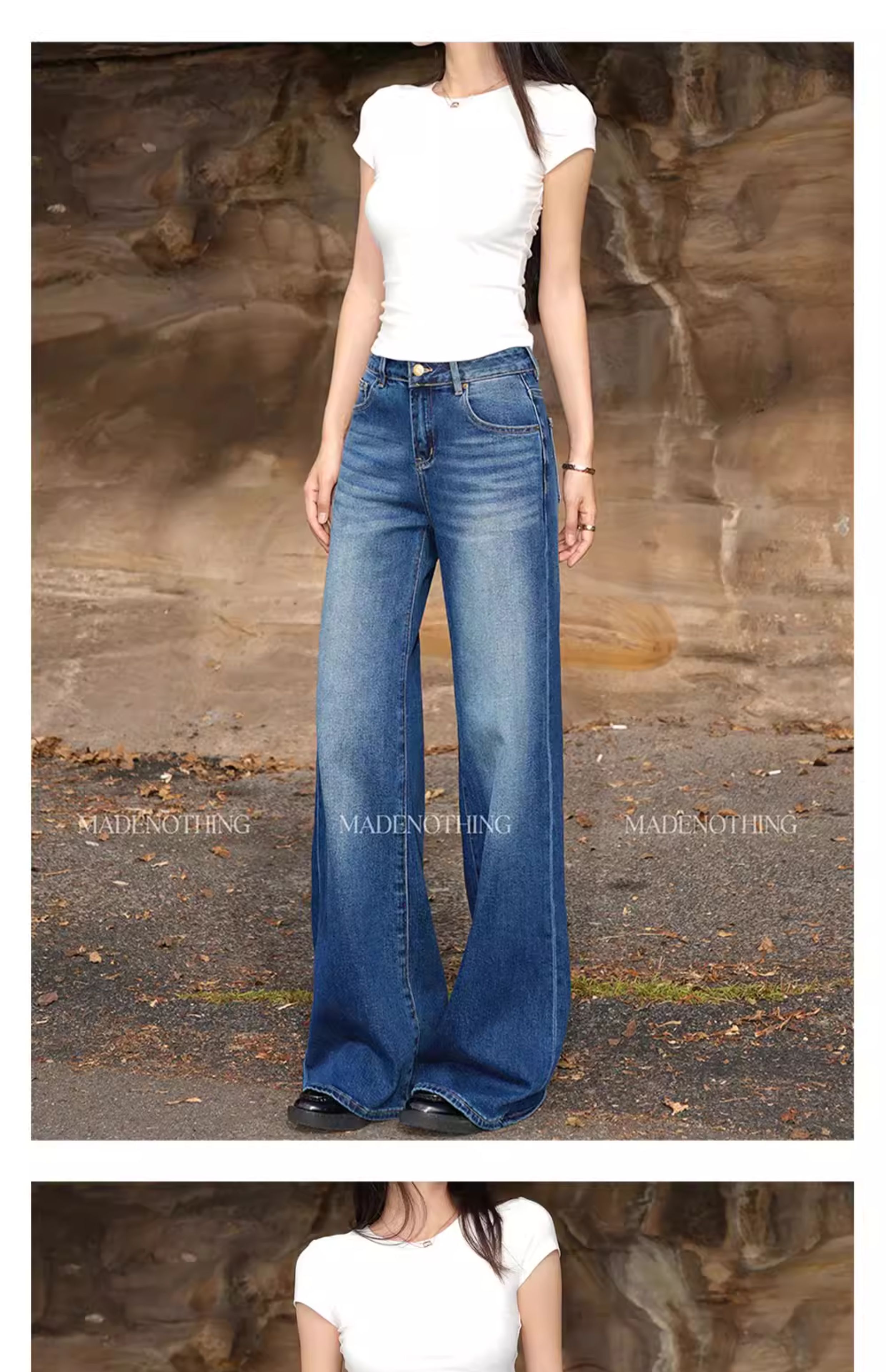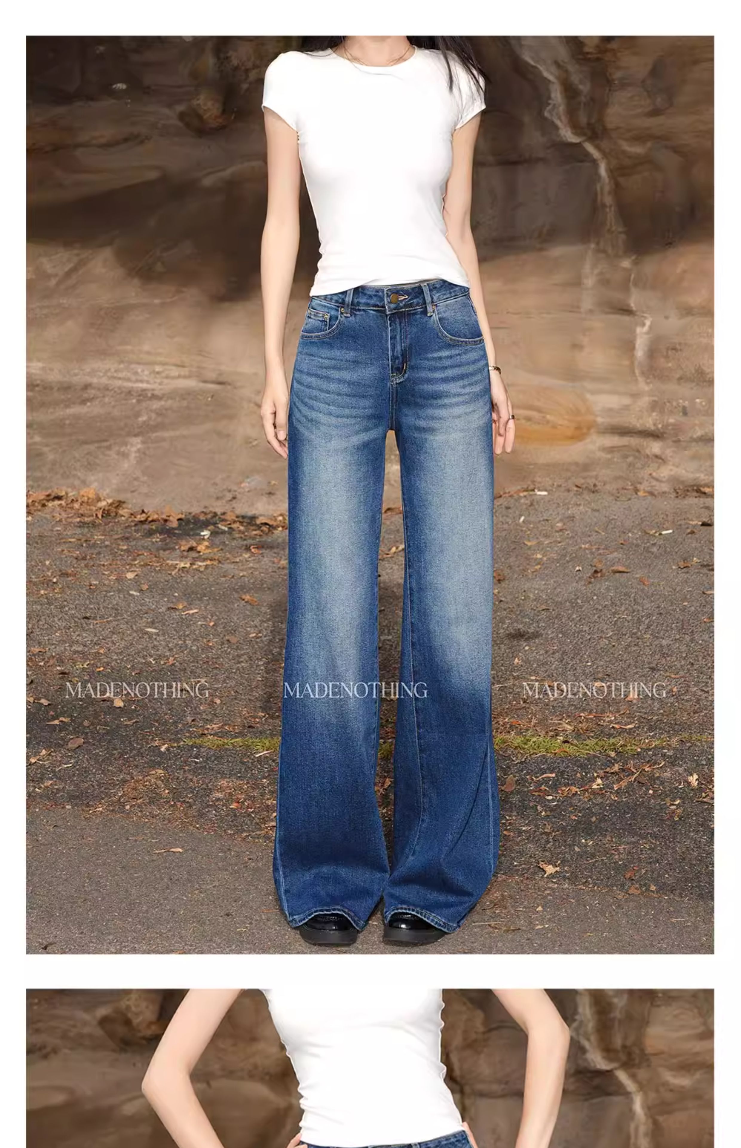 热卖MADE NOTHING 中腰MR021弹力Flare磨白高级水洗复古直筒牛仔裤女