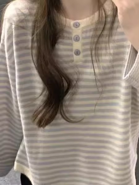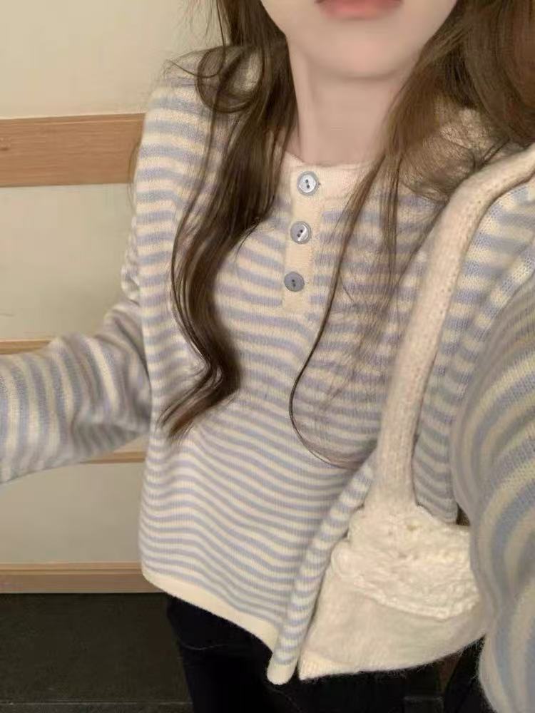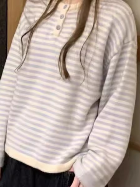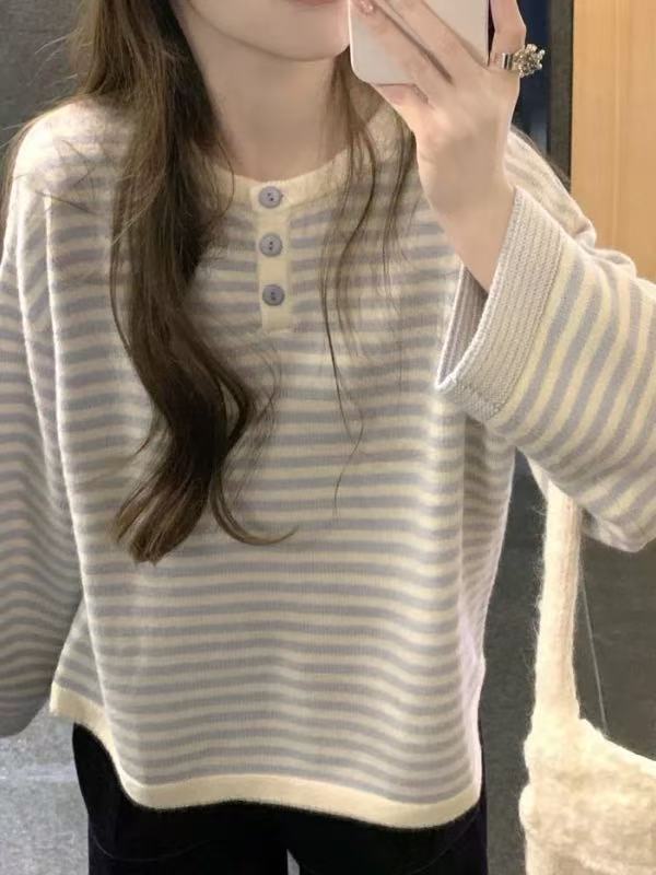热卖韩系慵懒松弛感灰色polo领条纹毛衣女2025早秋新款学院风针织上衣