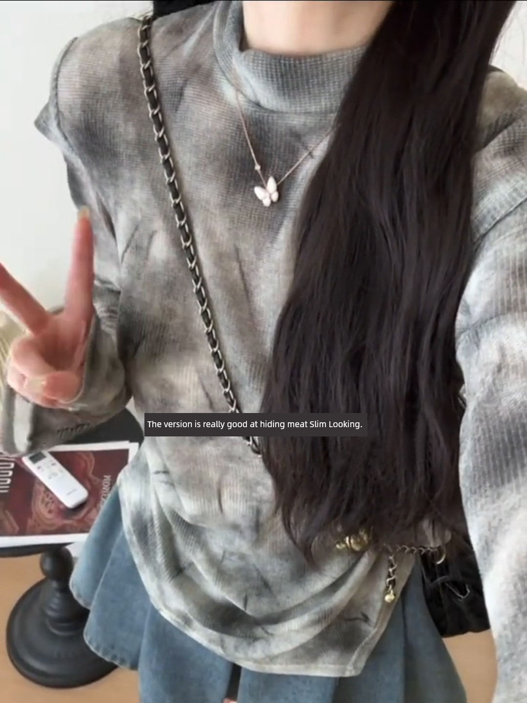 热卖大码胖mm小众设计感不规则长袖t恤秋装女款时尚法式别致扎染上衣