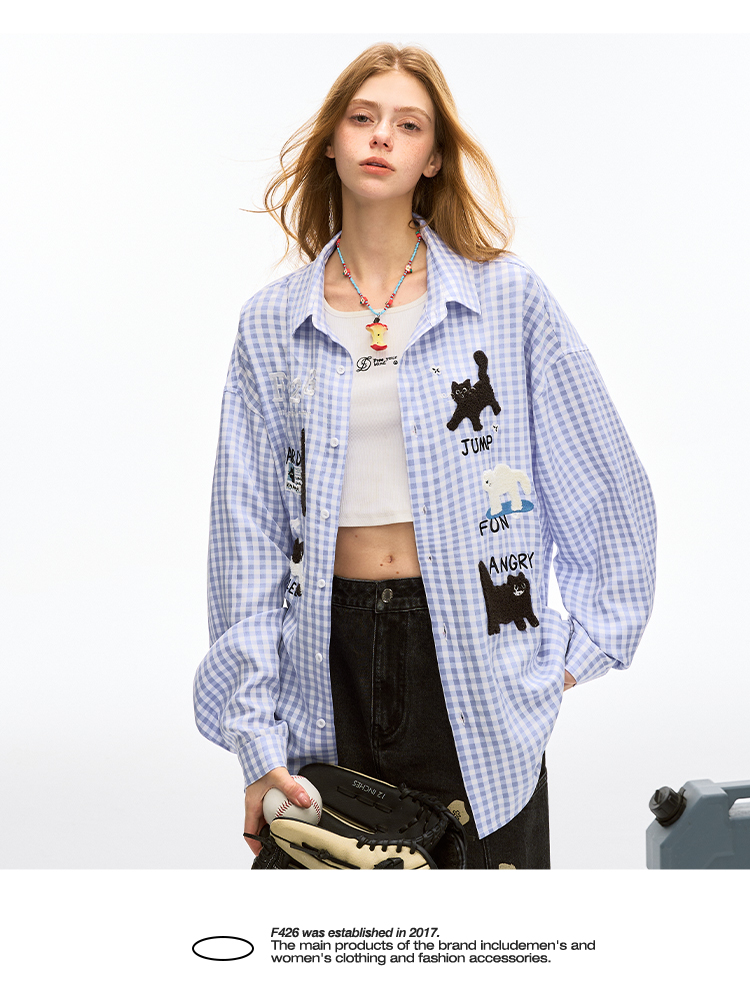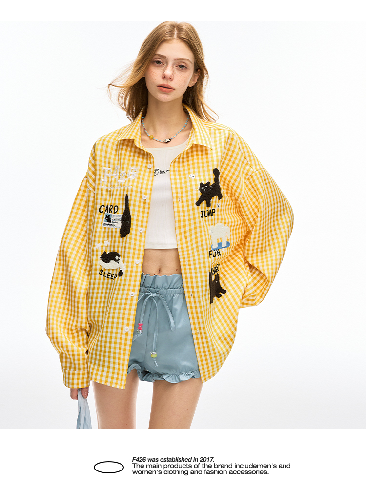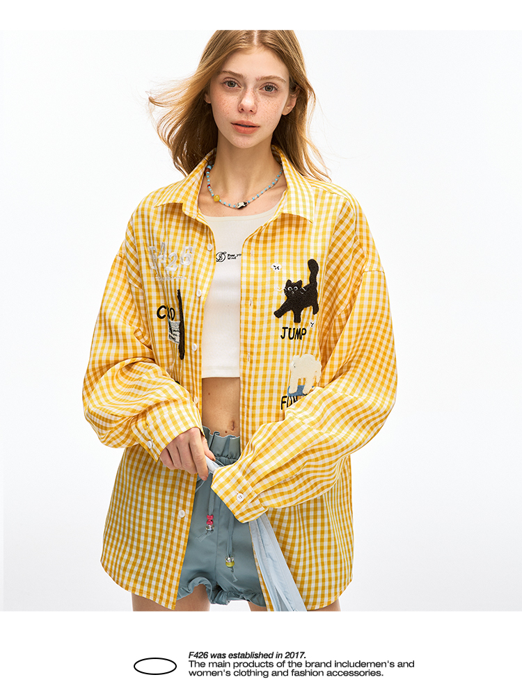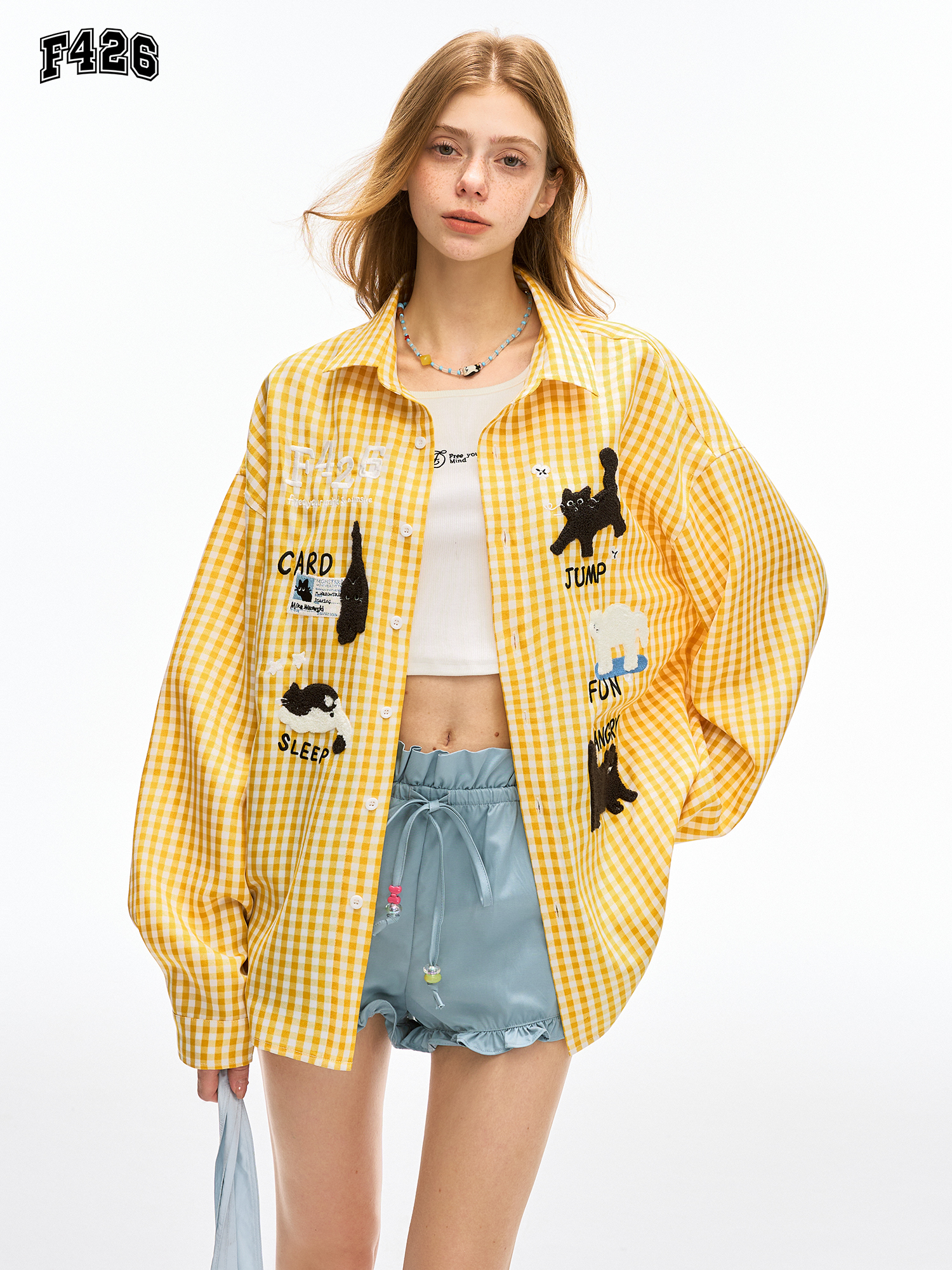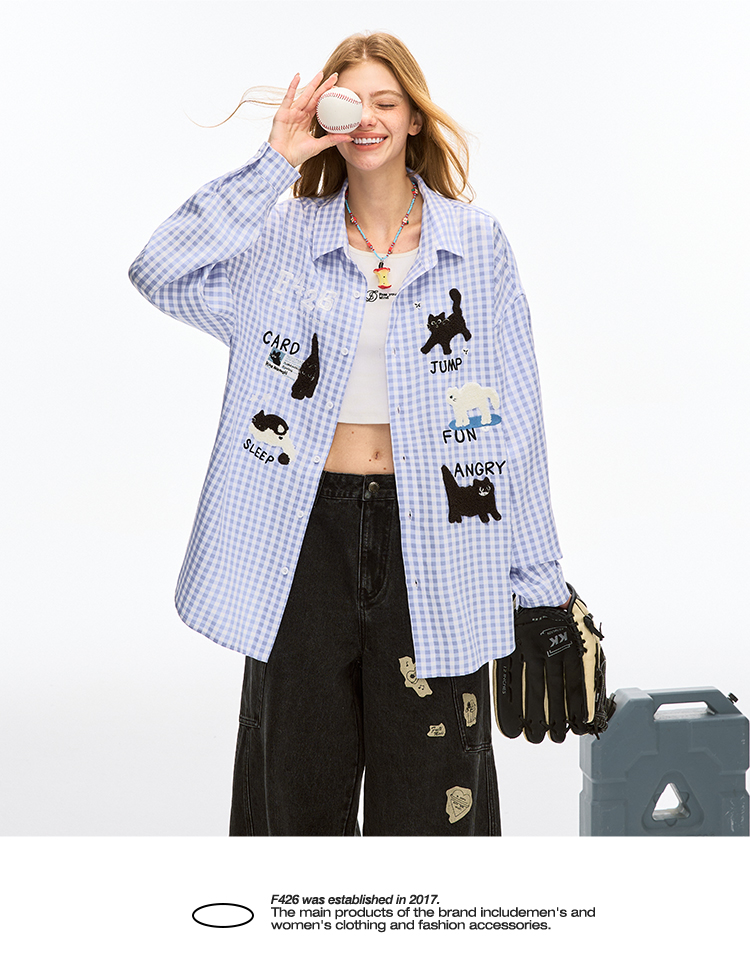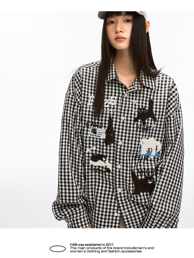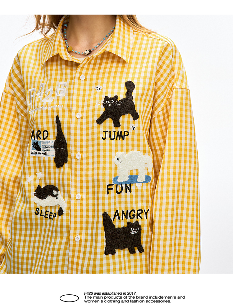 热卖【F426官方店】国潮牌夏季新款宽松休闲百搭毛巾绣小猫格子衬衫