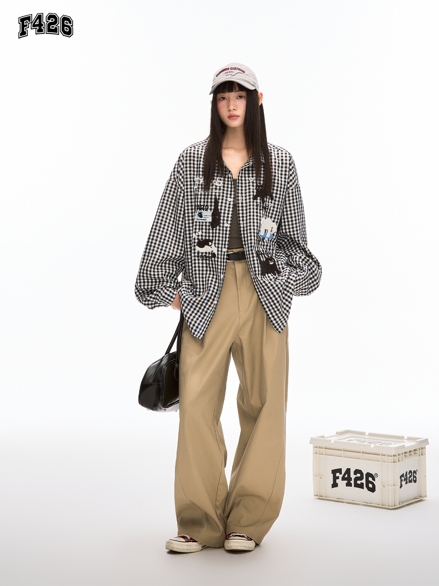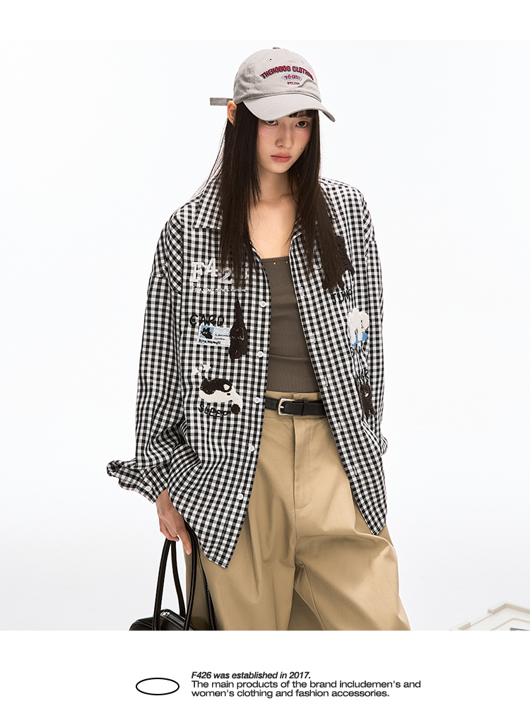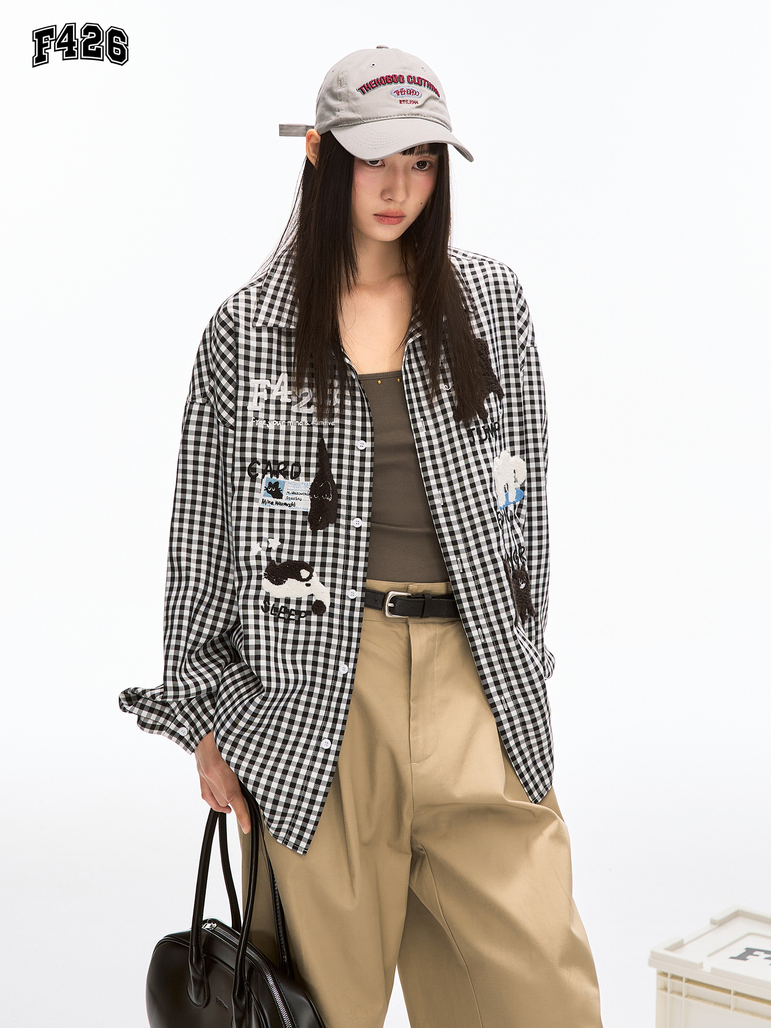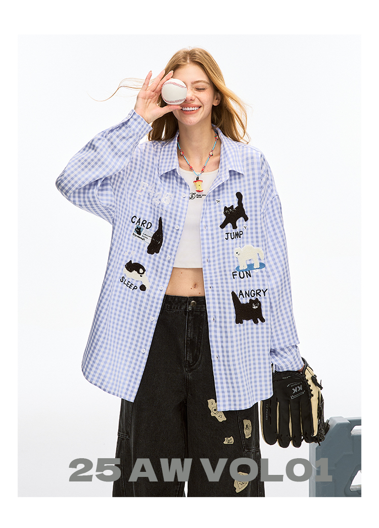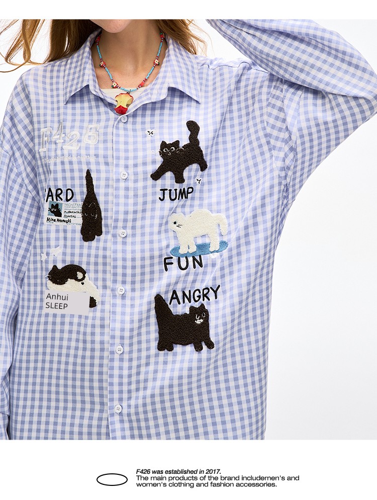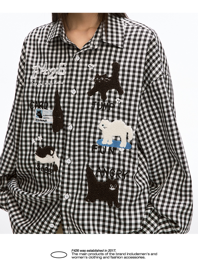 热卖【F426官方店】国潮牌夏季新款宽松休闲百搭毛巾绣小猫格子衬衫