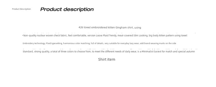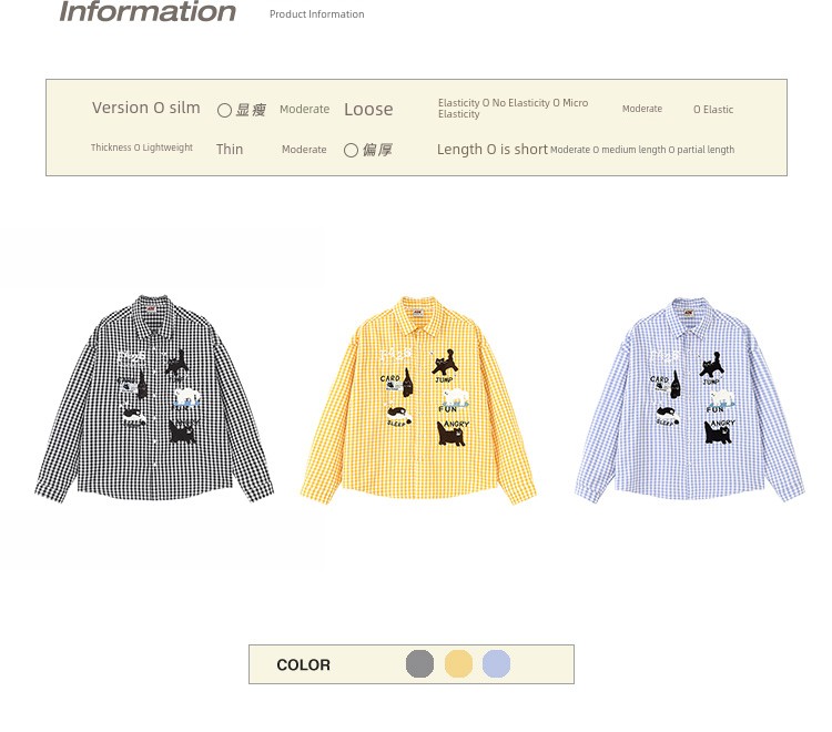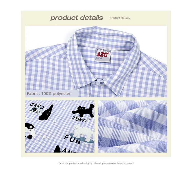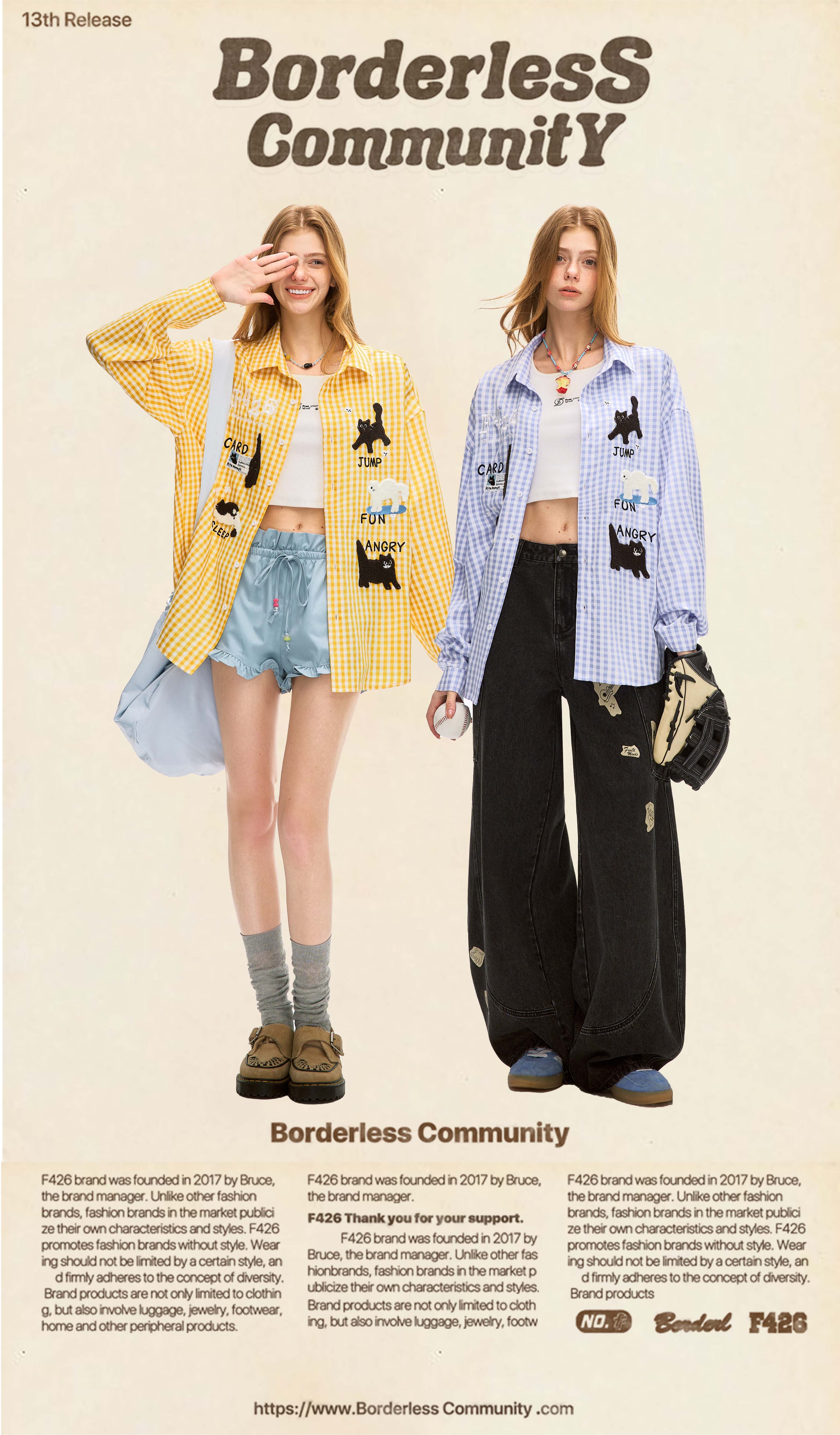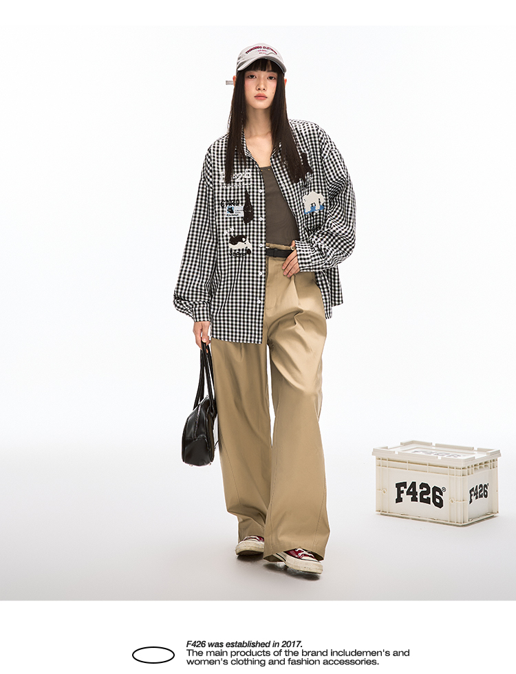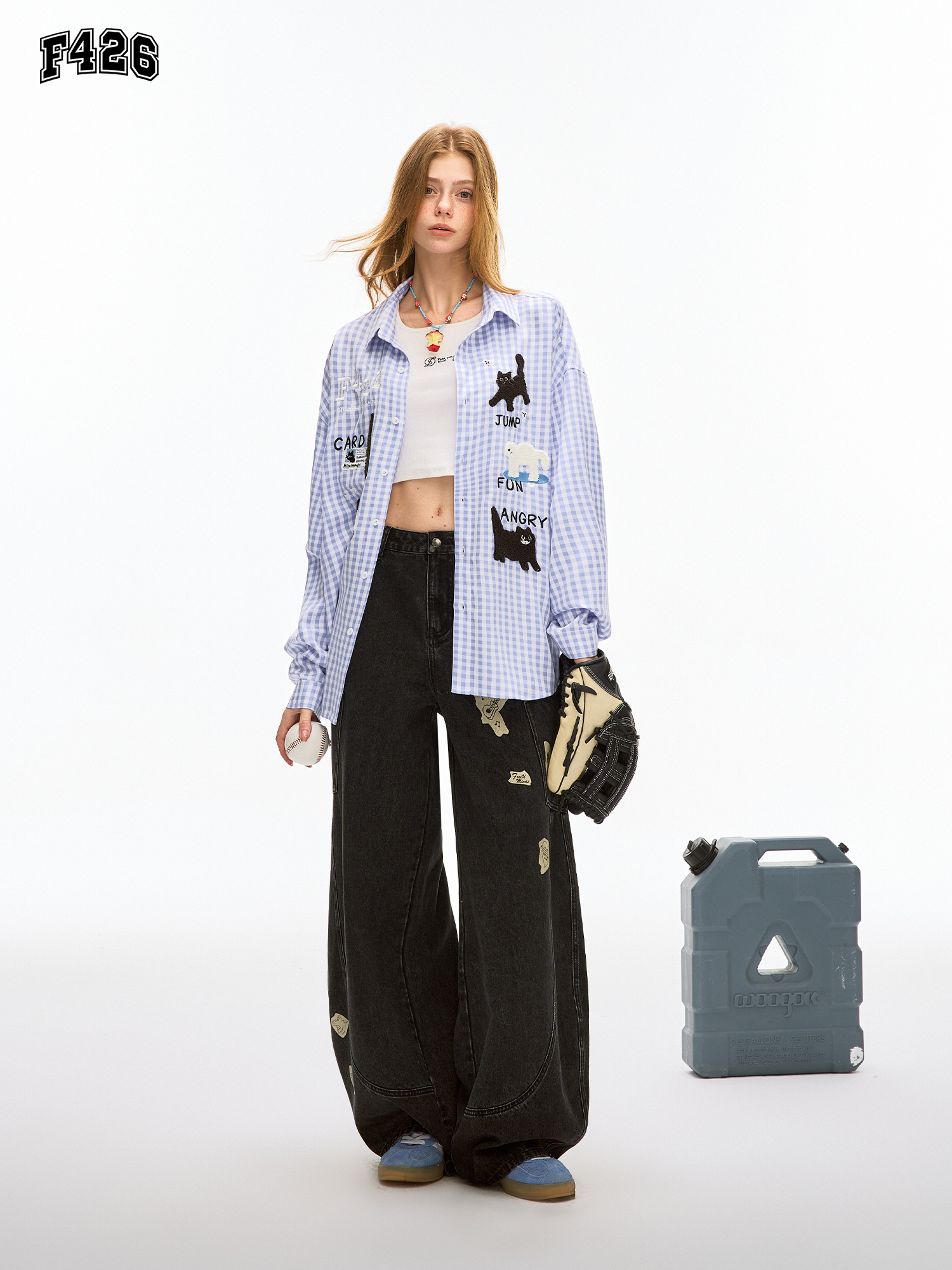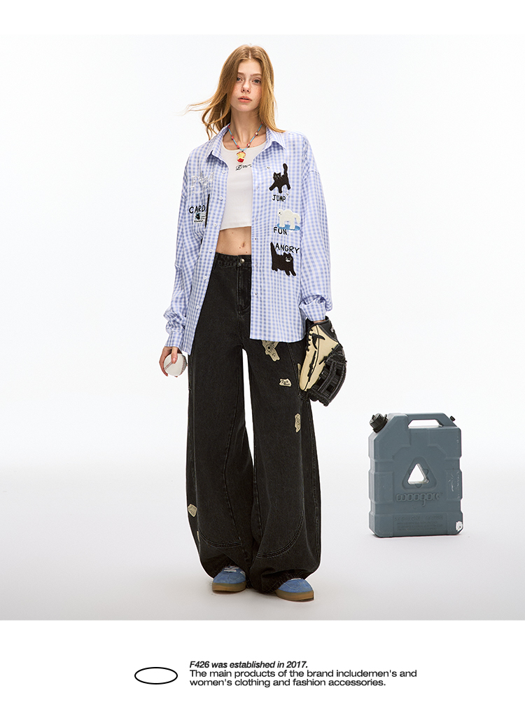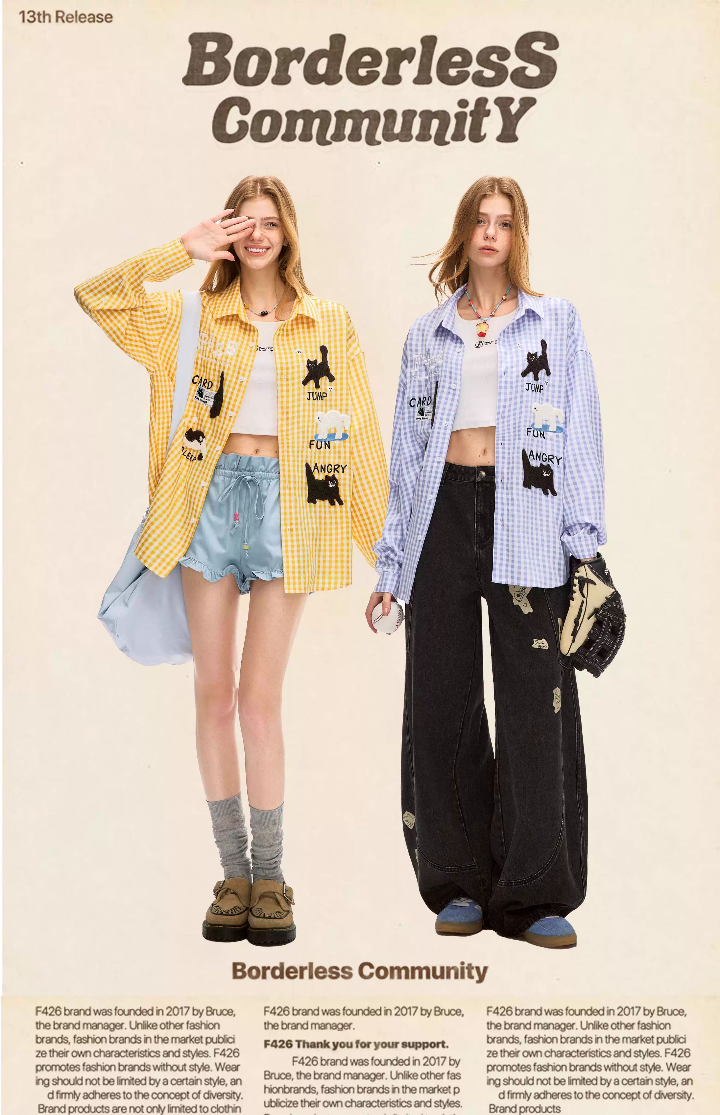 热卖【F426官方店】国潮牌夏季新款宽松休闲百搭毛巾绣小猫格子衬衫