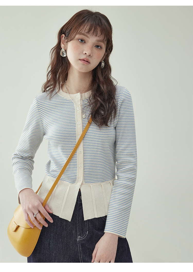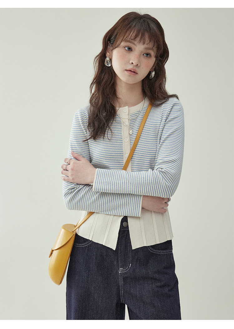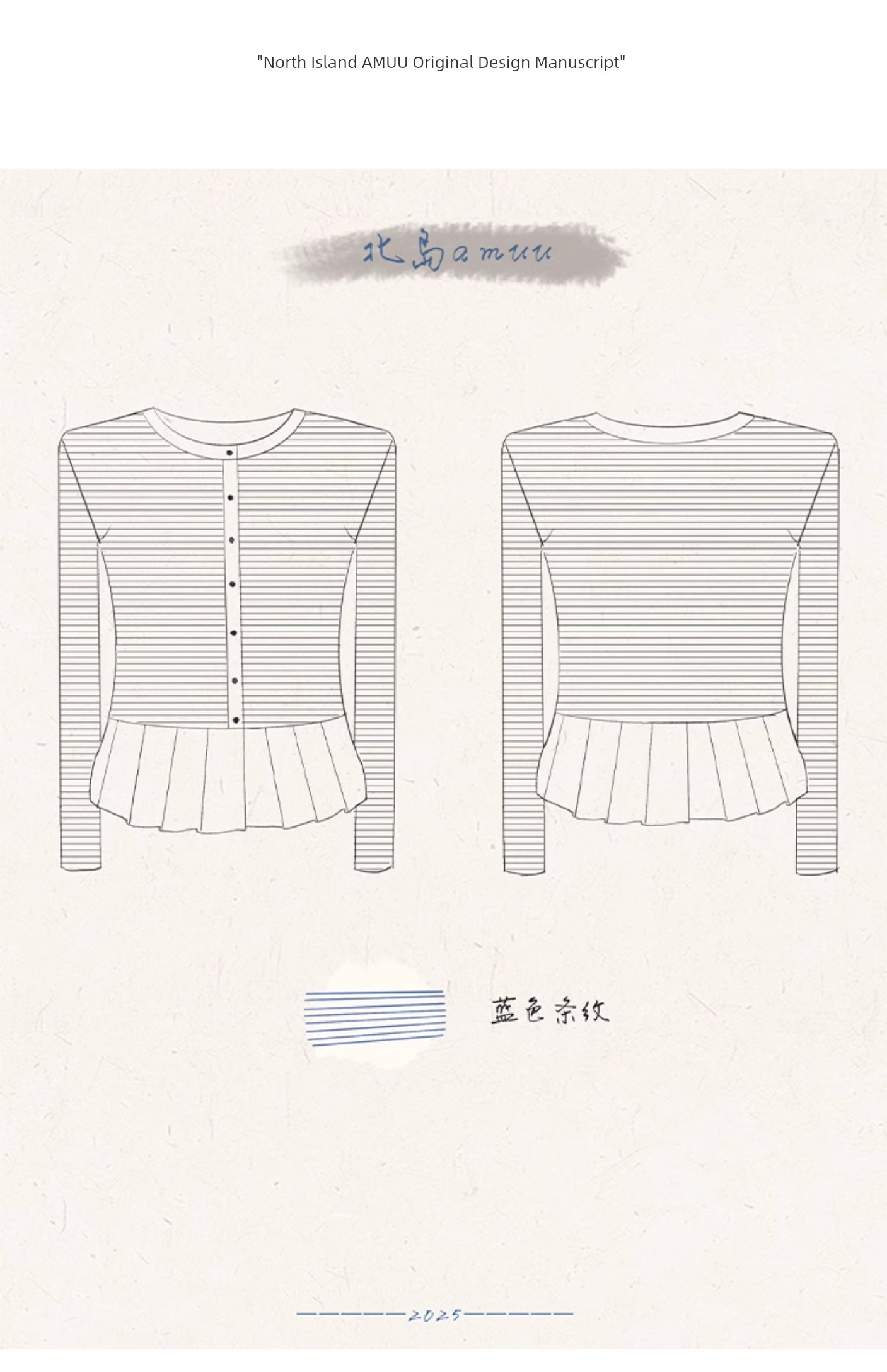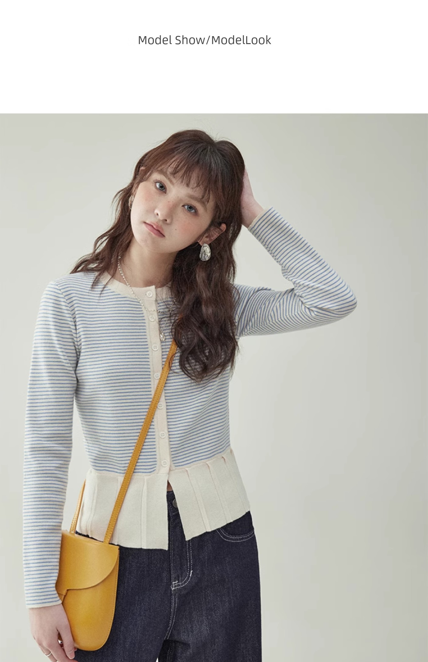 热卖「北岛AMUU原创」拼色条纹百褶下摆针织衫女秋季新款小众长袖上衣