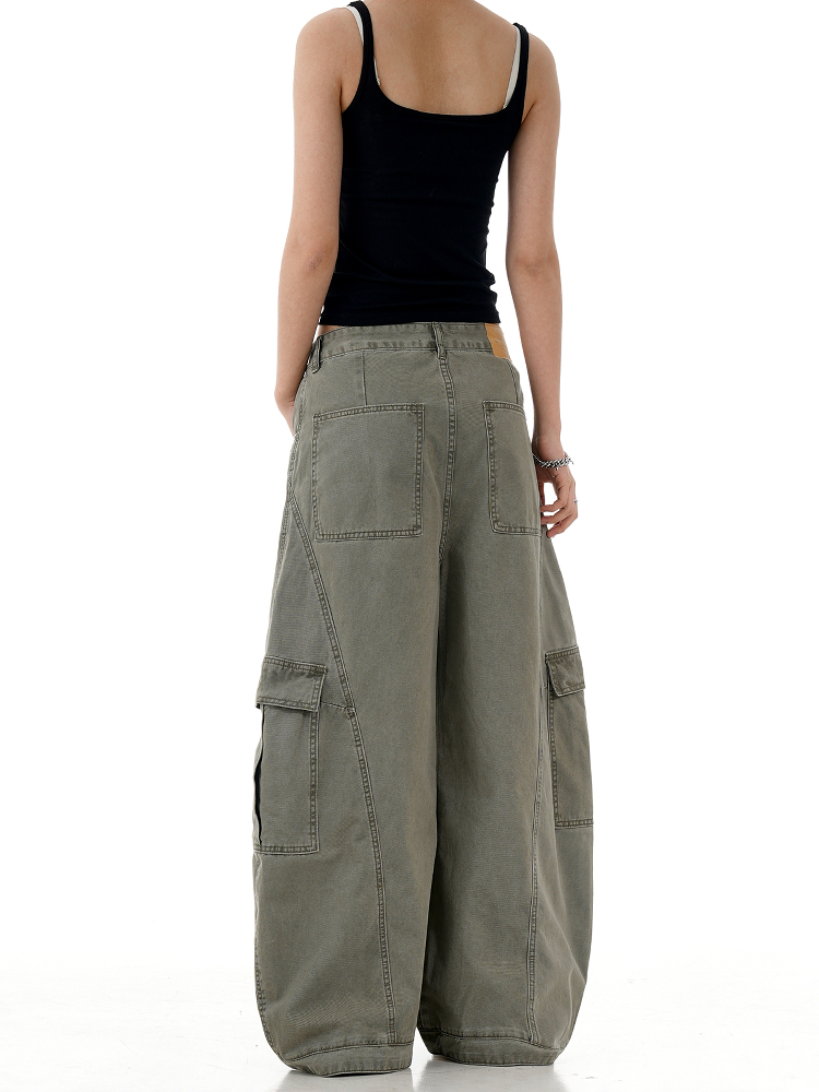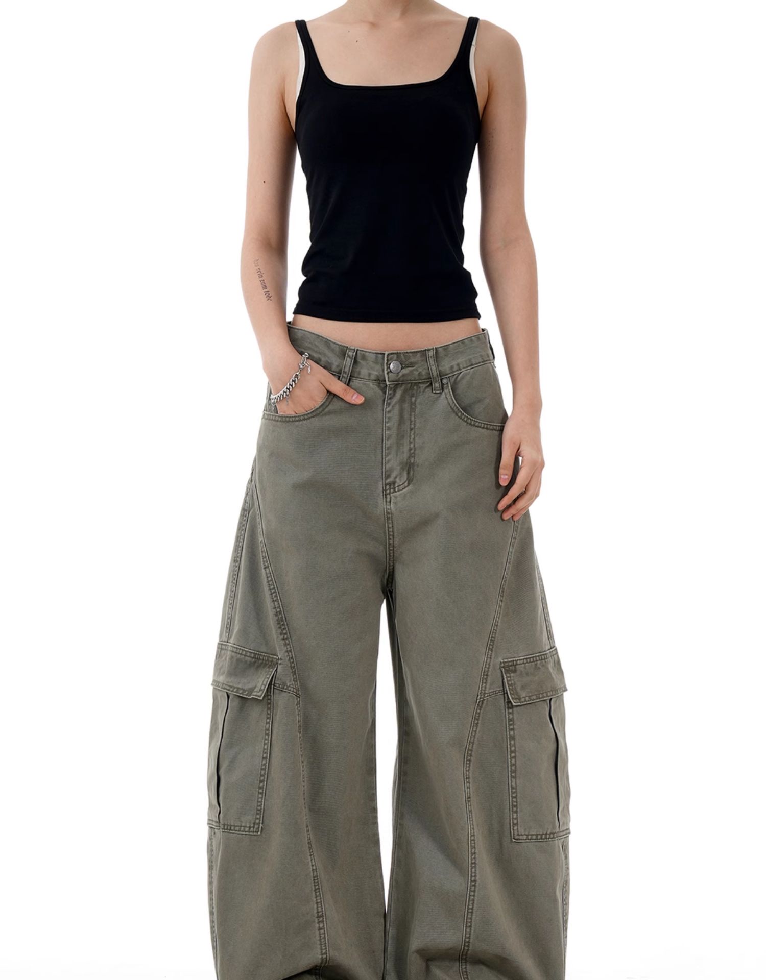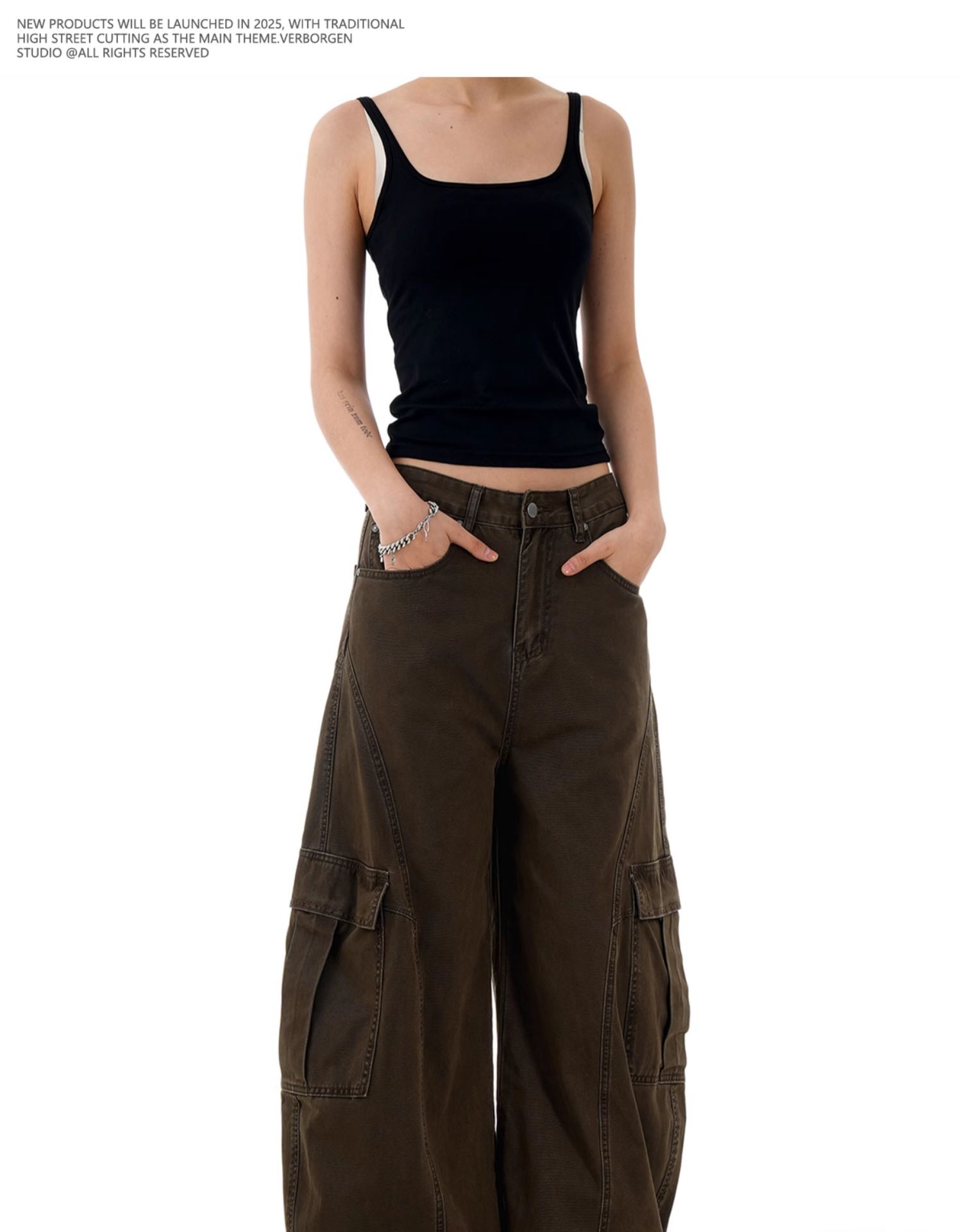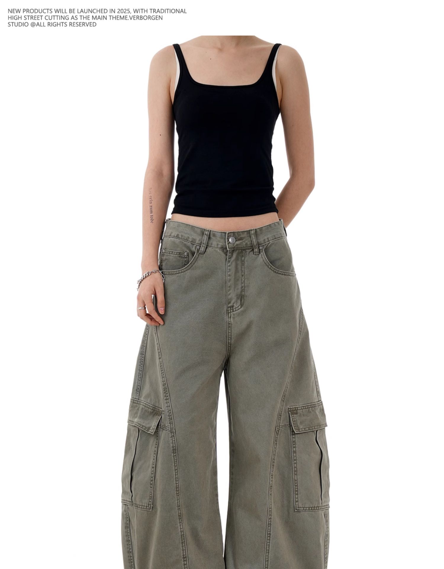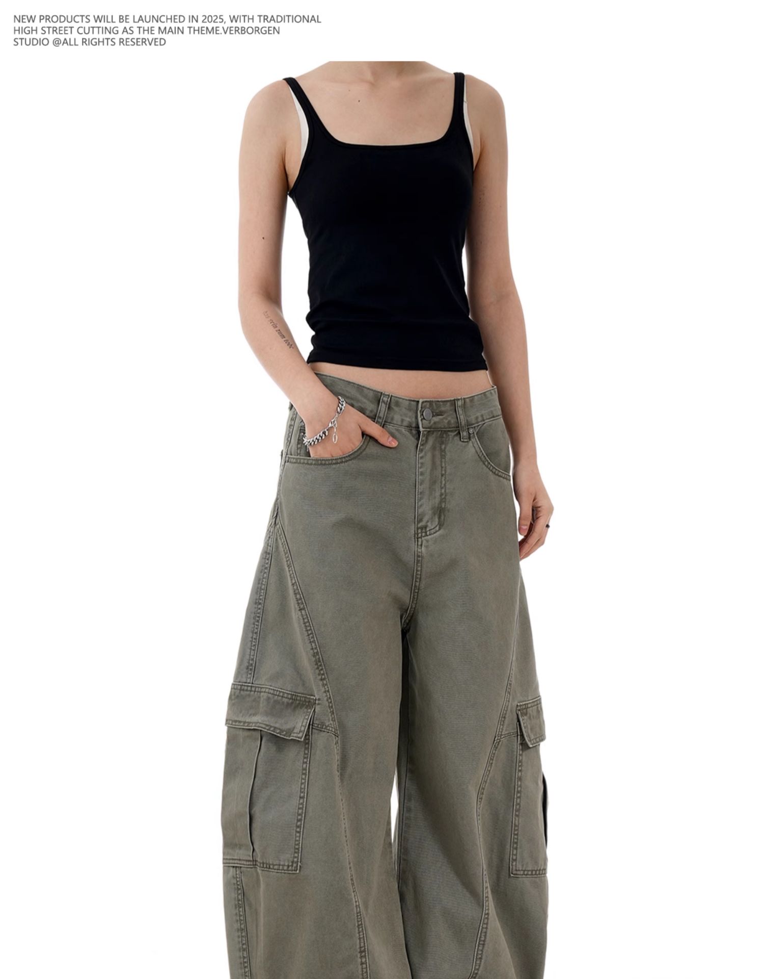 热卖Verborgen美式复古解构绿色弯刀工装裤潮牌男女宽松阔腿baggy裤