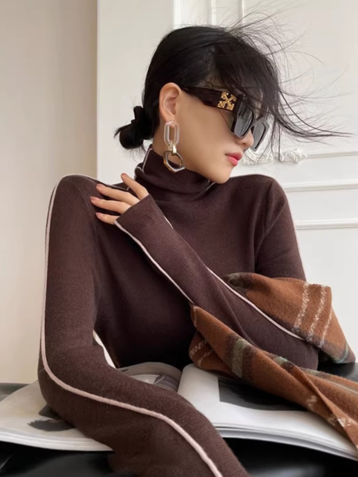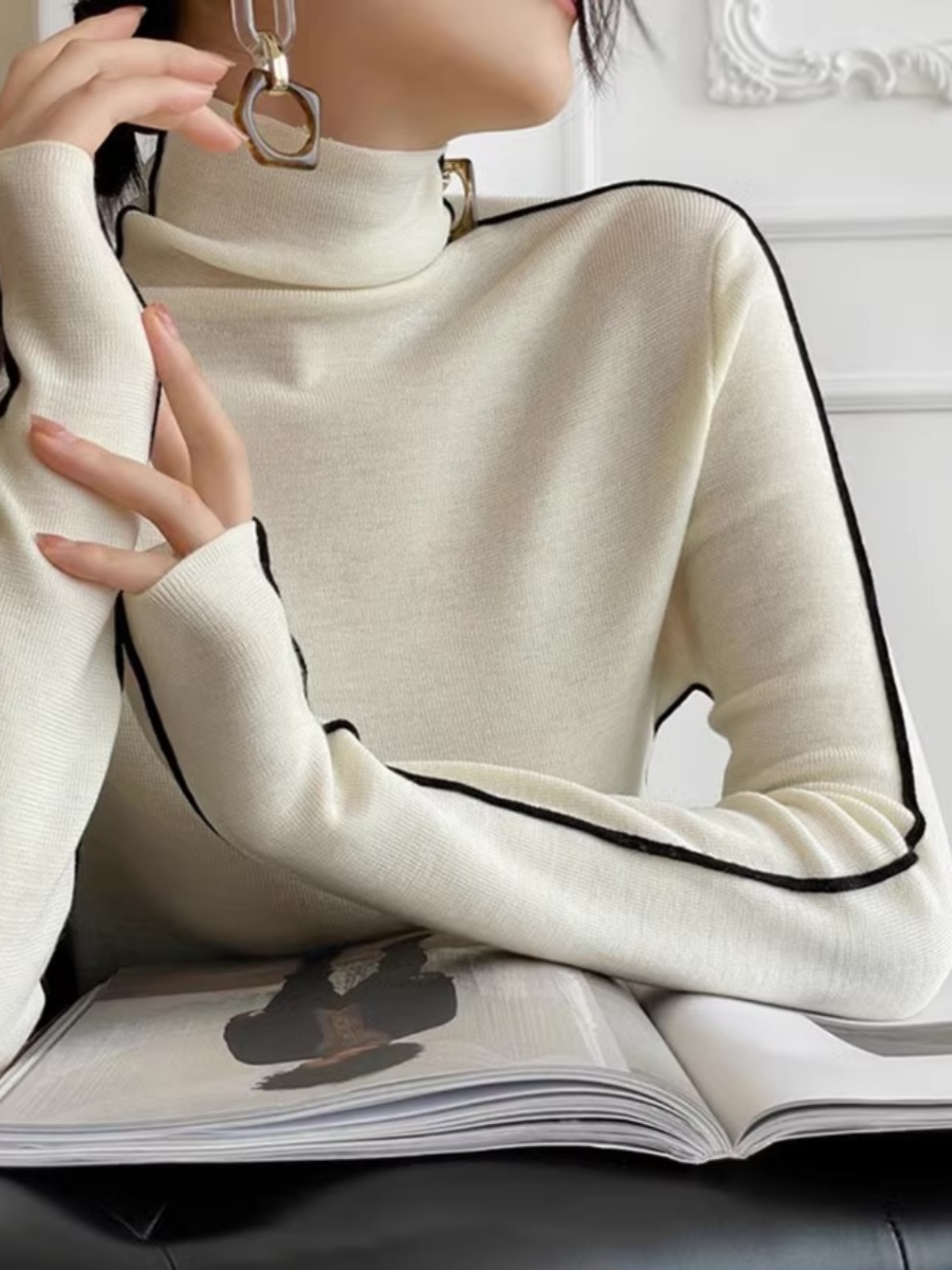 热卖法式黑色撞色高领针织打底衫女设计感小众堆堆领内搭毛衣秋冬上衣