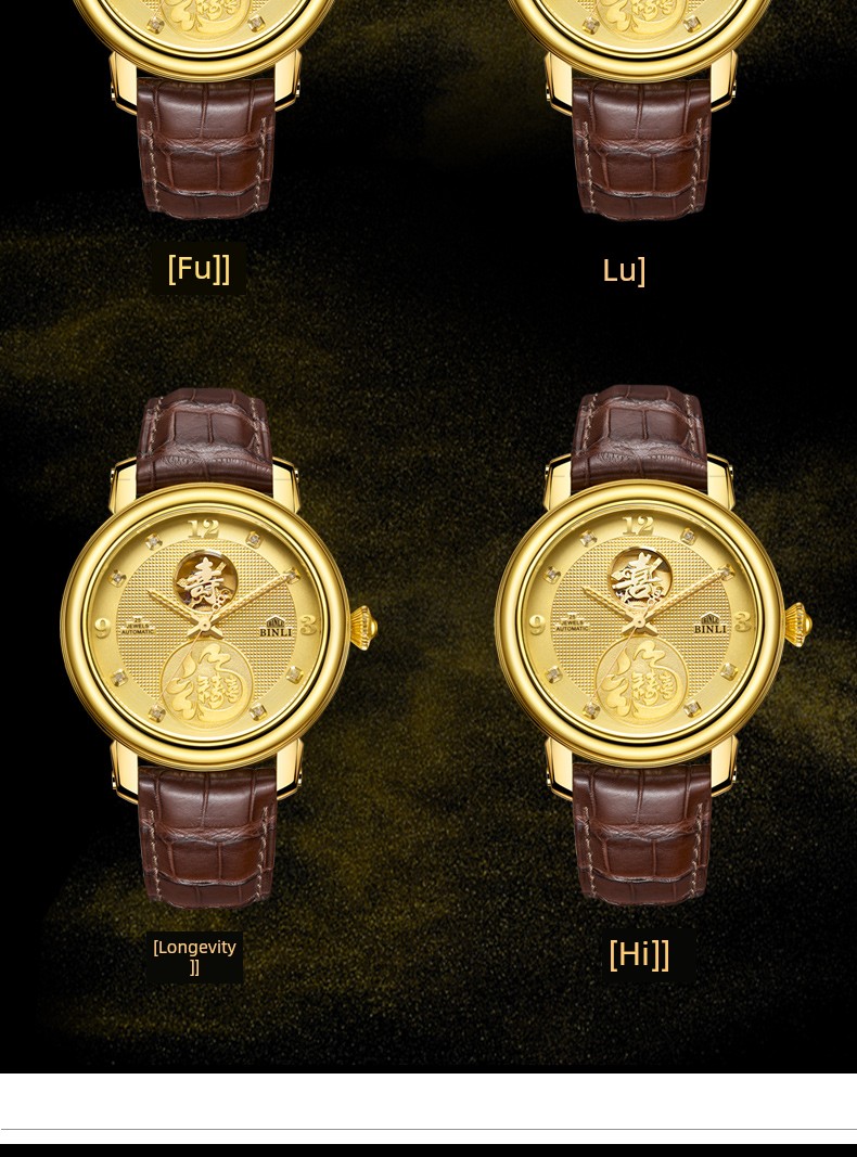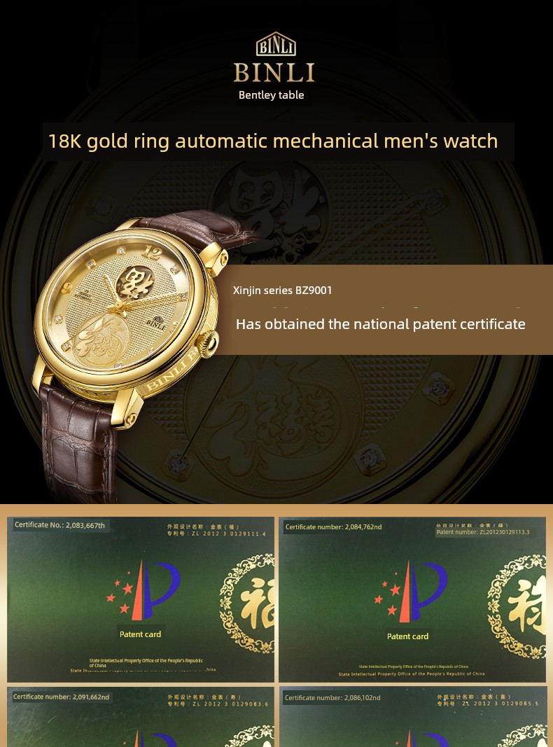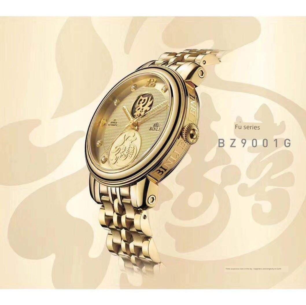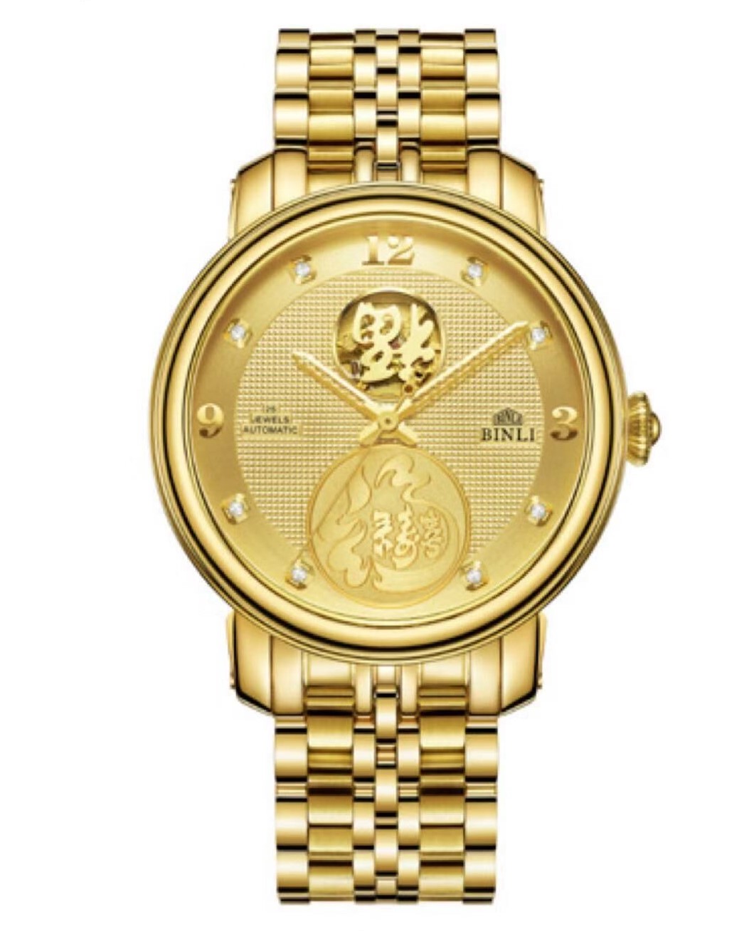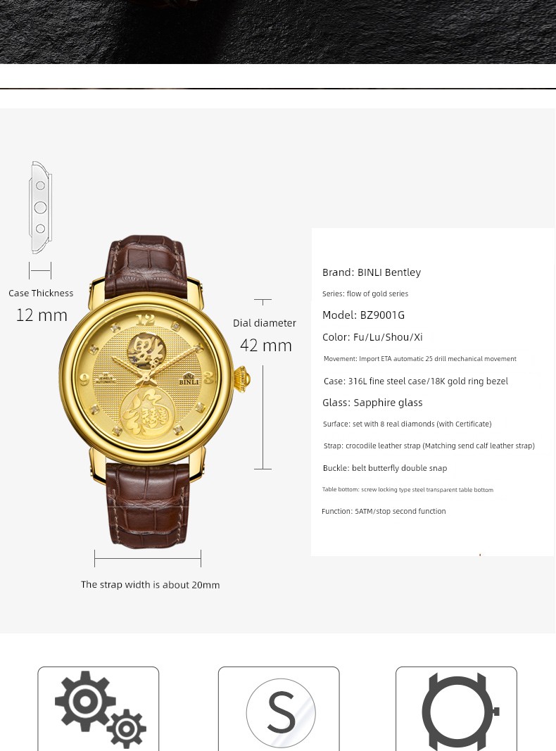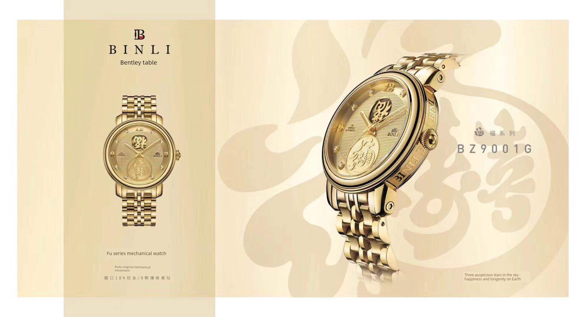 热卖高端宾利手表男士全自动机械手表福禄寿喜真皮18K包金钻石表9001