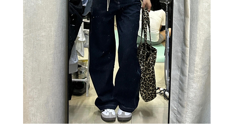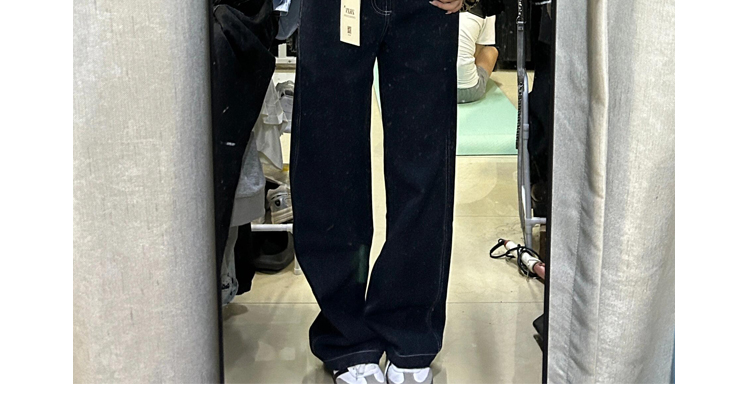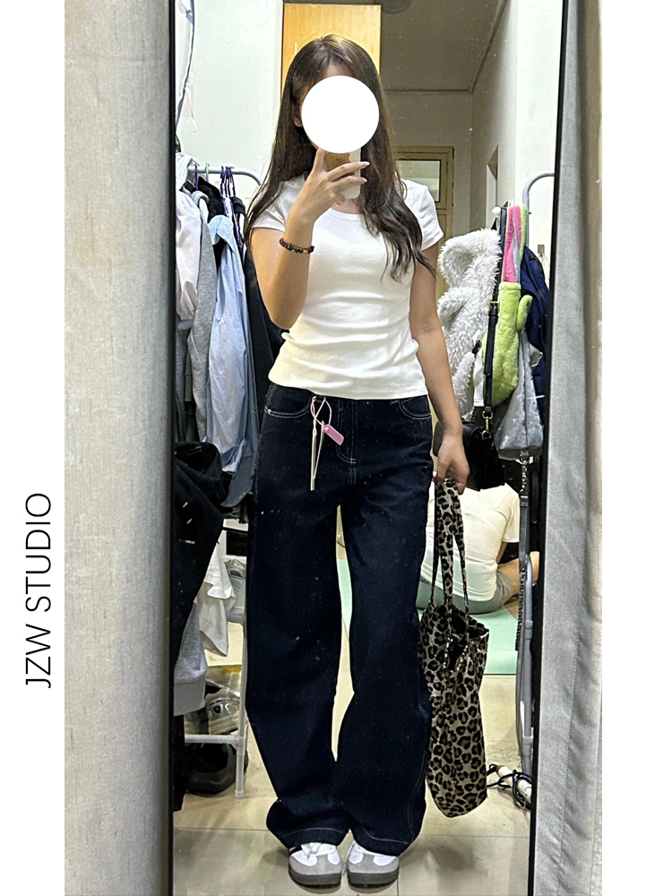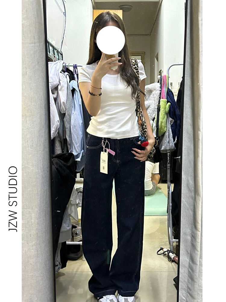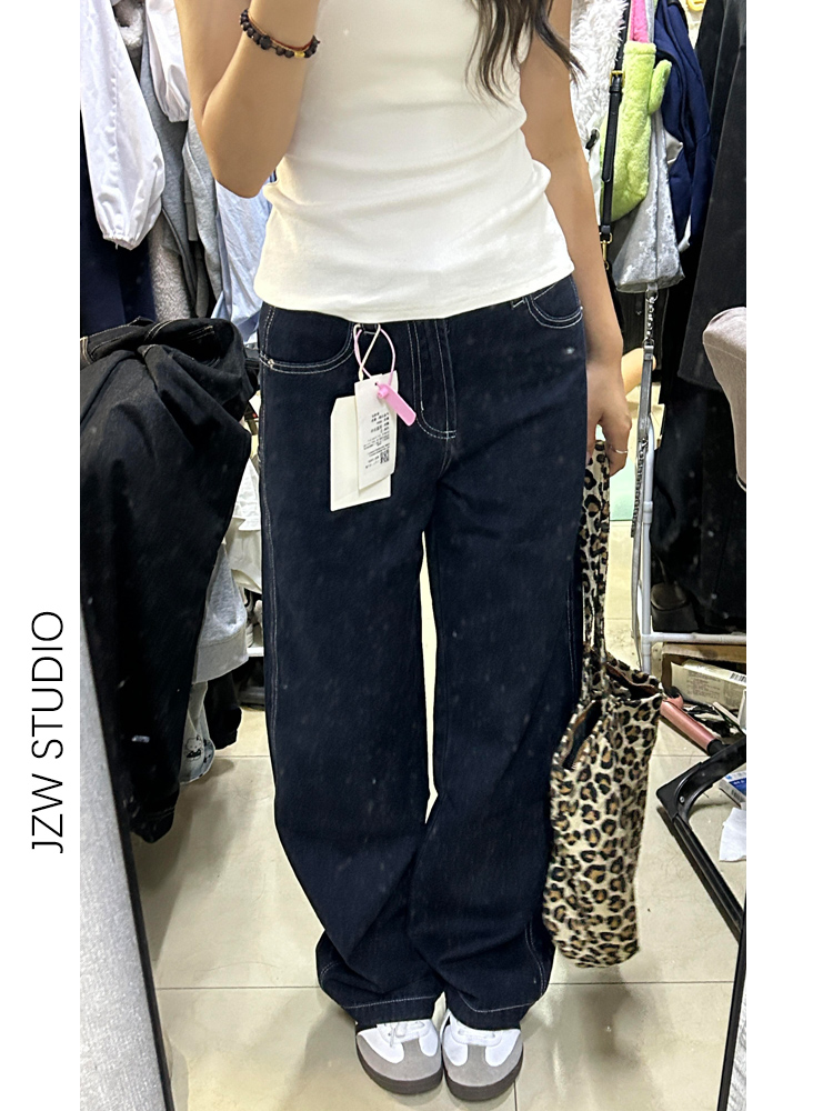 热卖美式深蓝高腰阔腿牛仔裤女秋季宽松显瘦垂感小个子加长拖地直筒裤