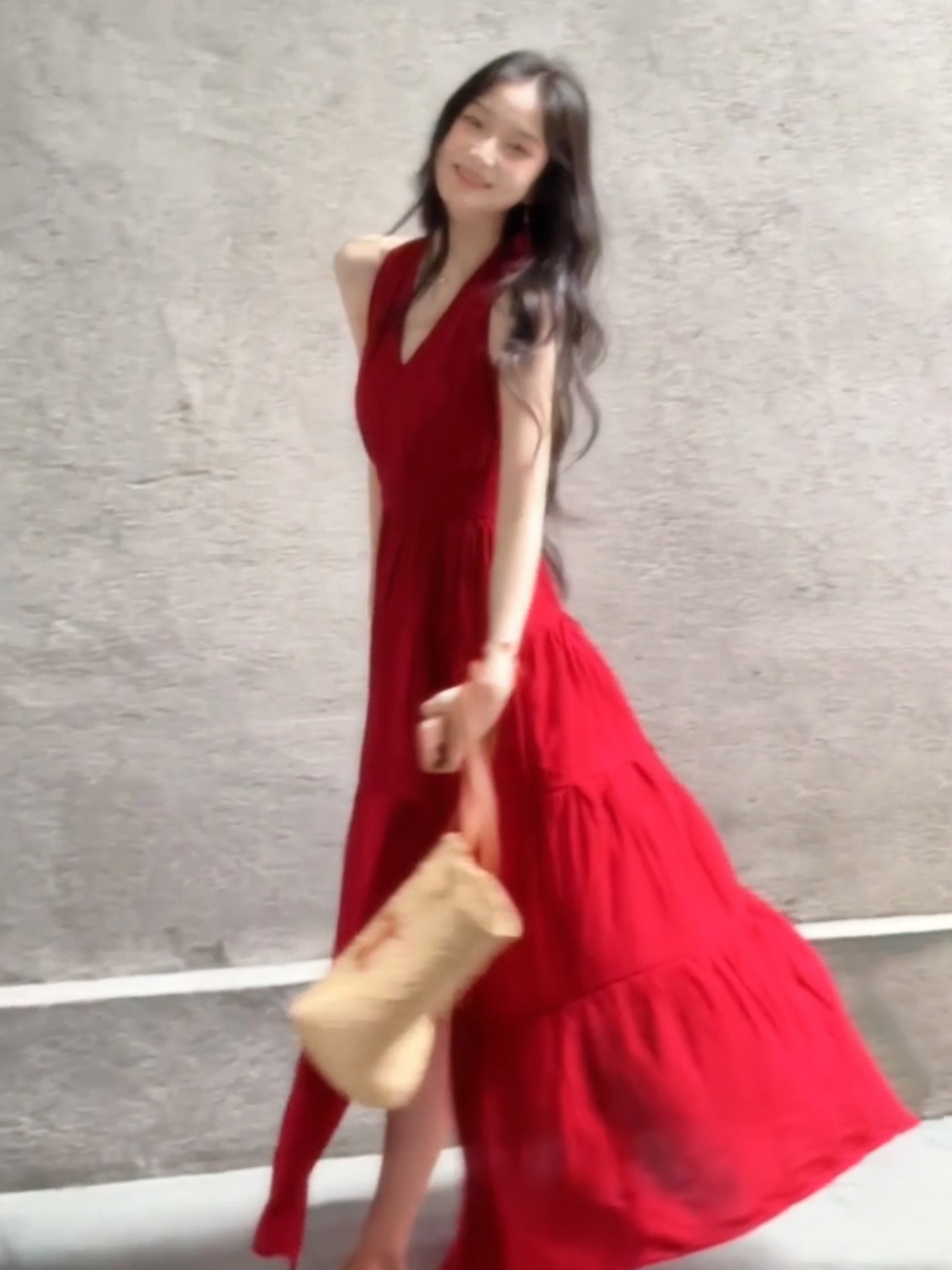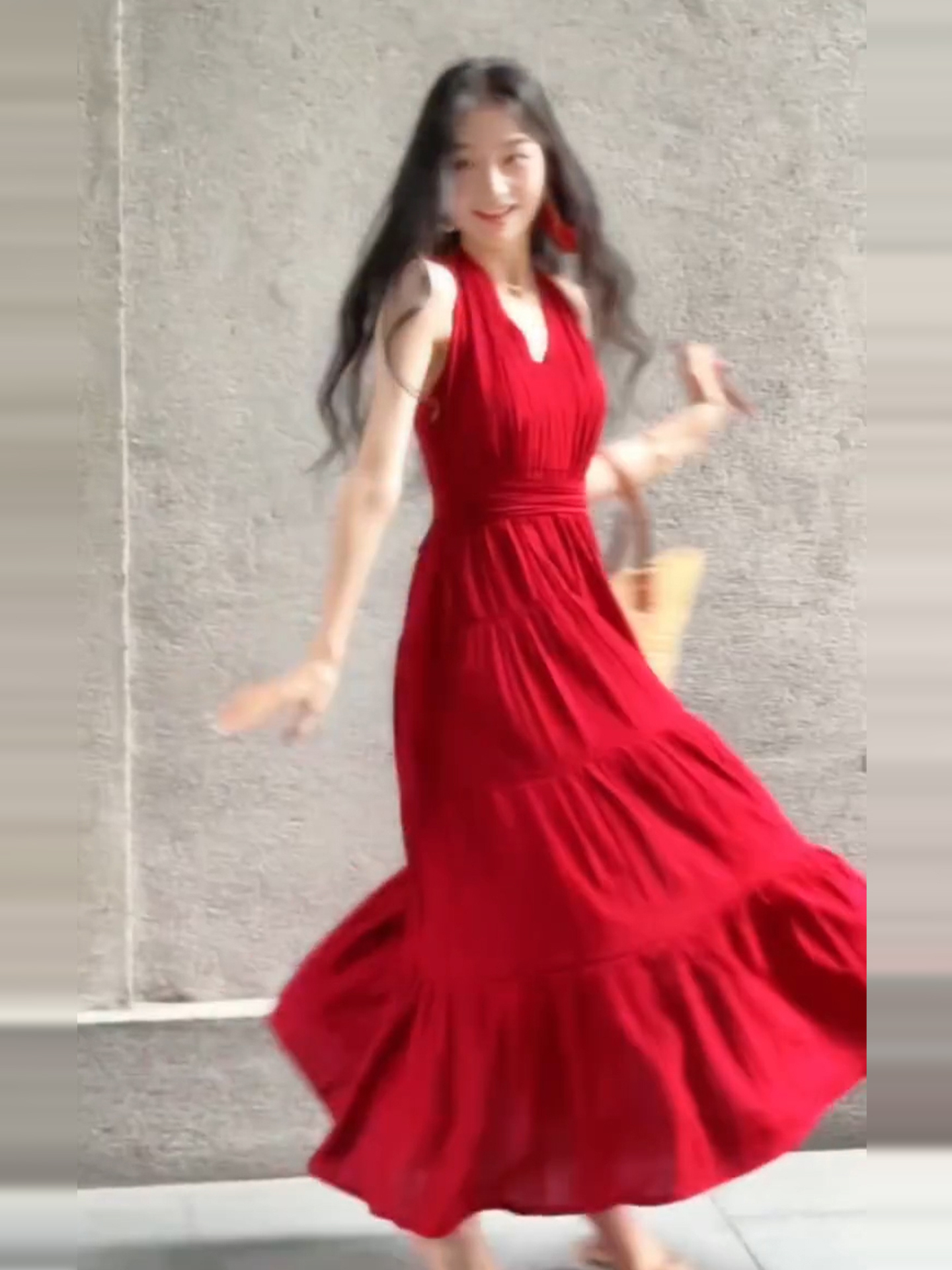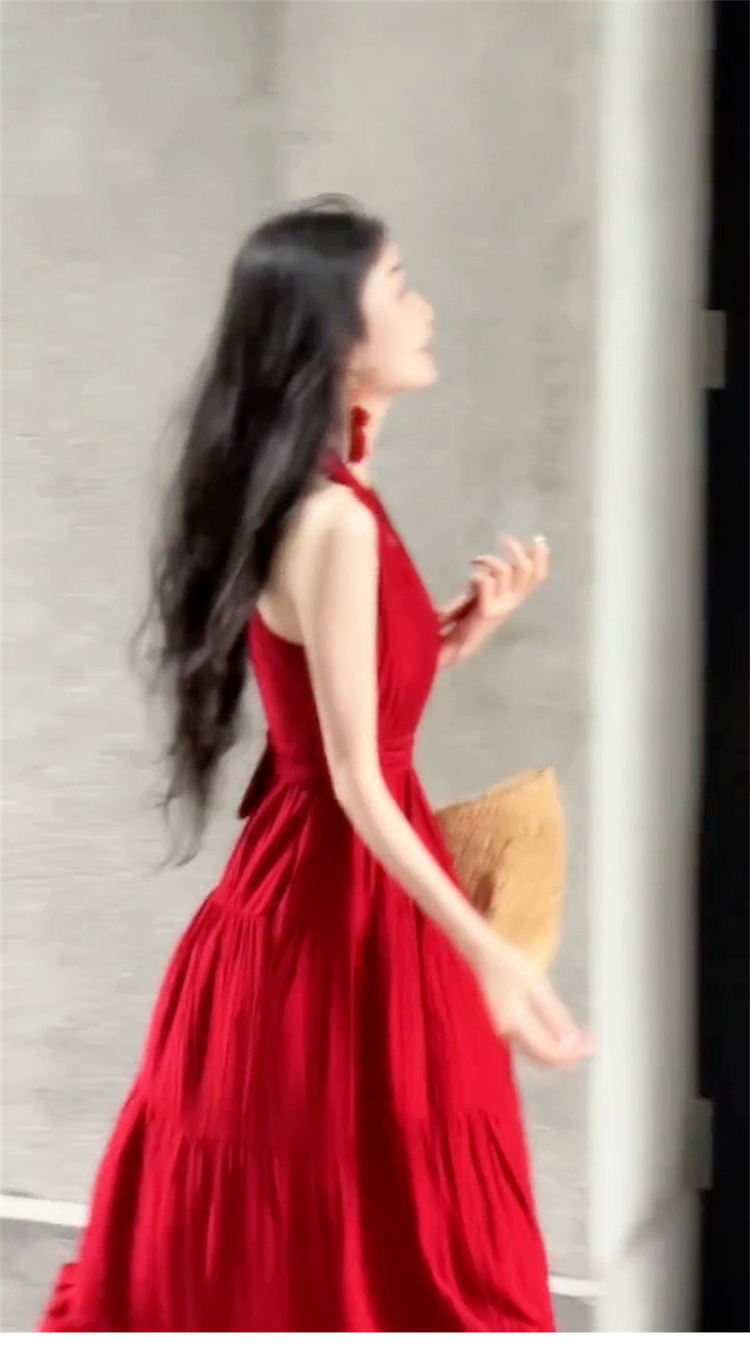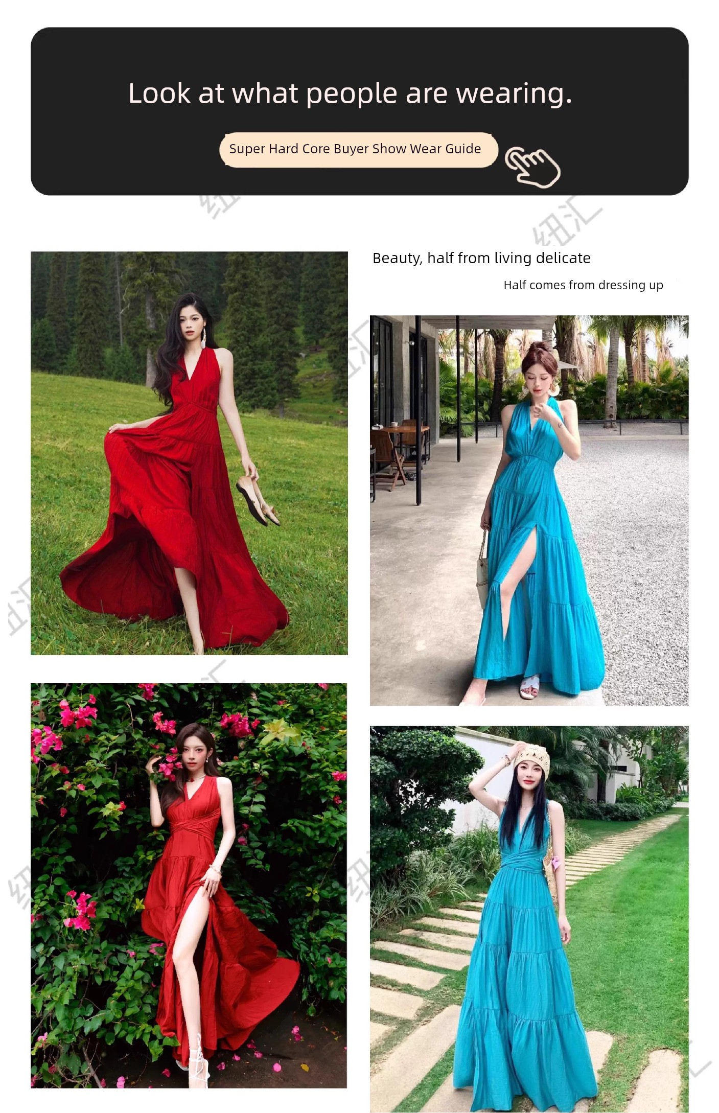 热卖今年流行红色V领挂脖连衣裙子女夏季海边度假风露背收腰沙滩长裙