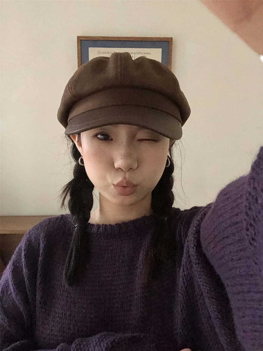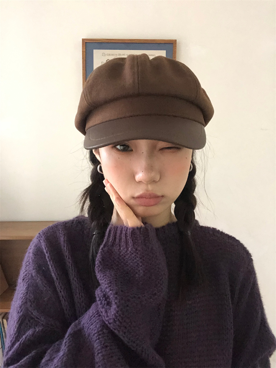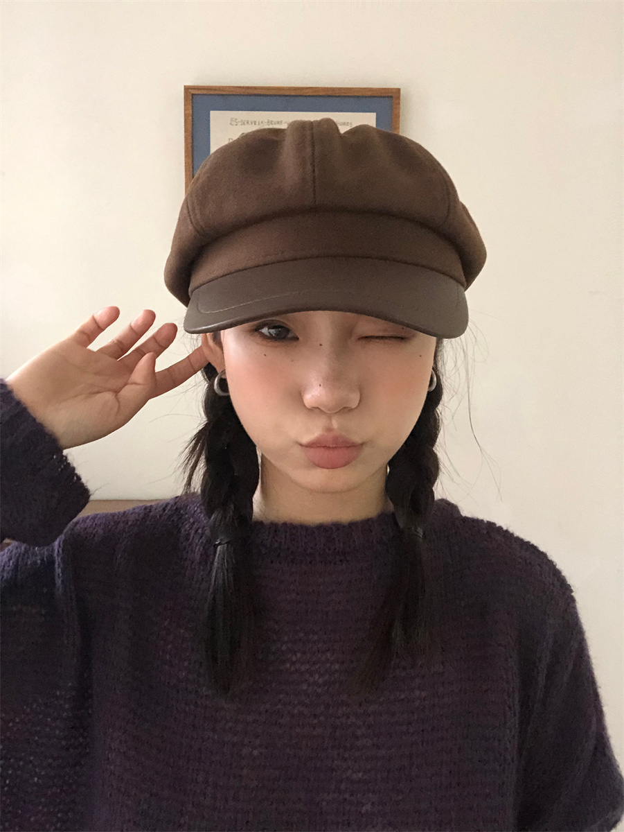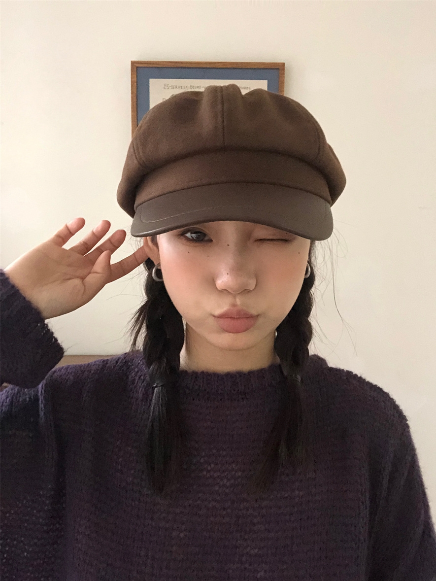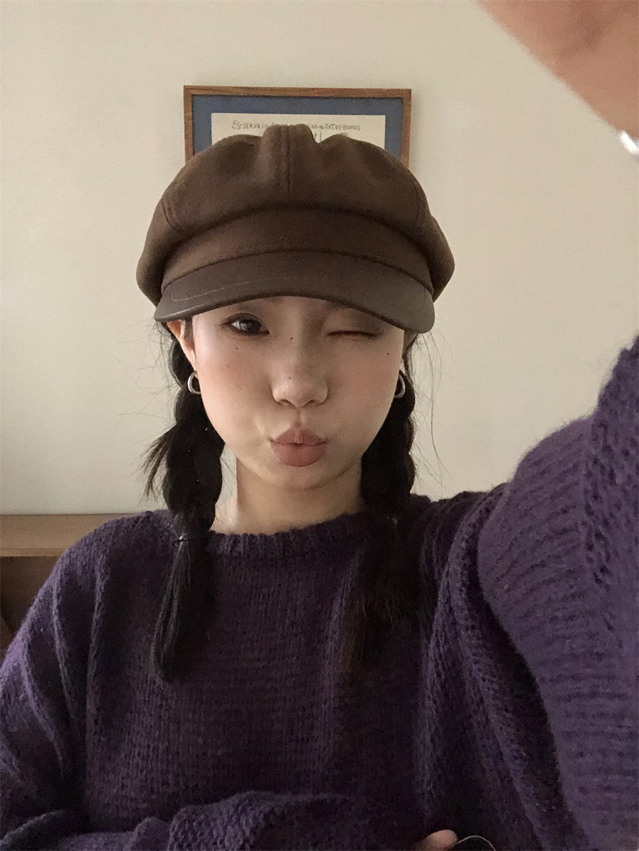 热卖秋冬复古毛呢显脸小咖啡色八角帽