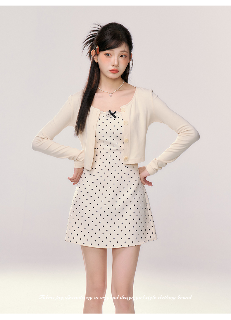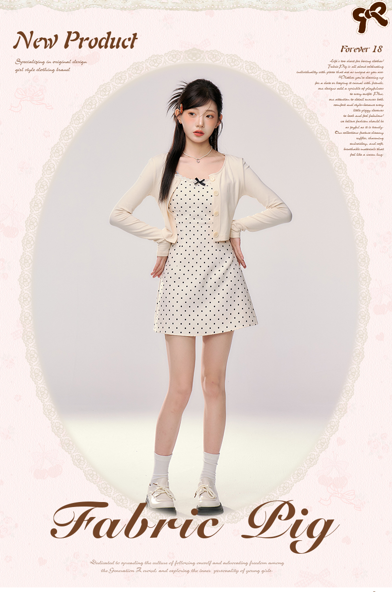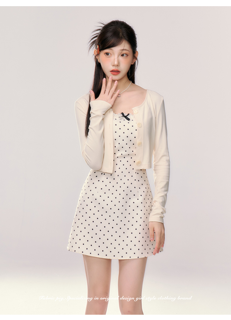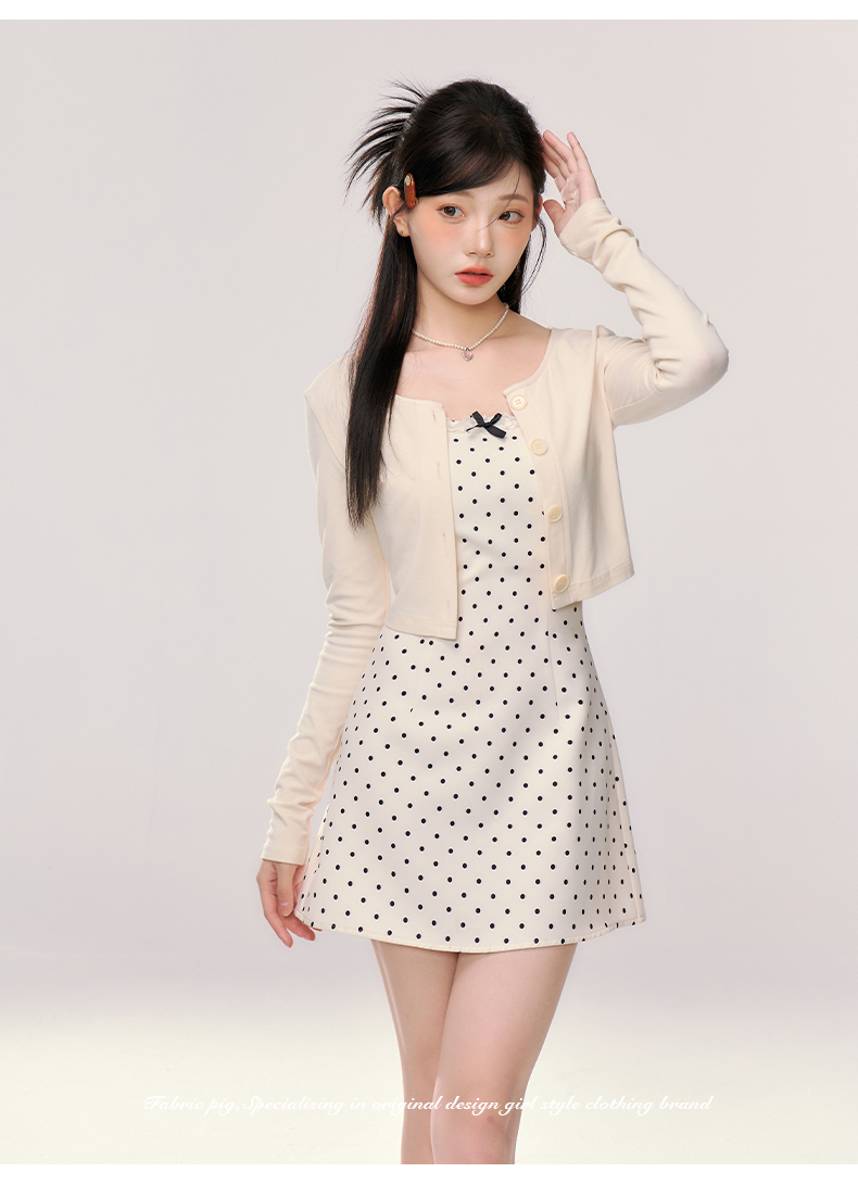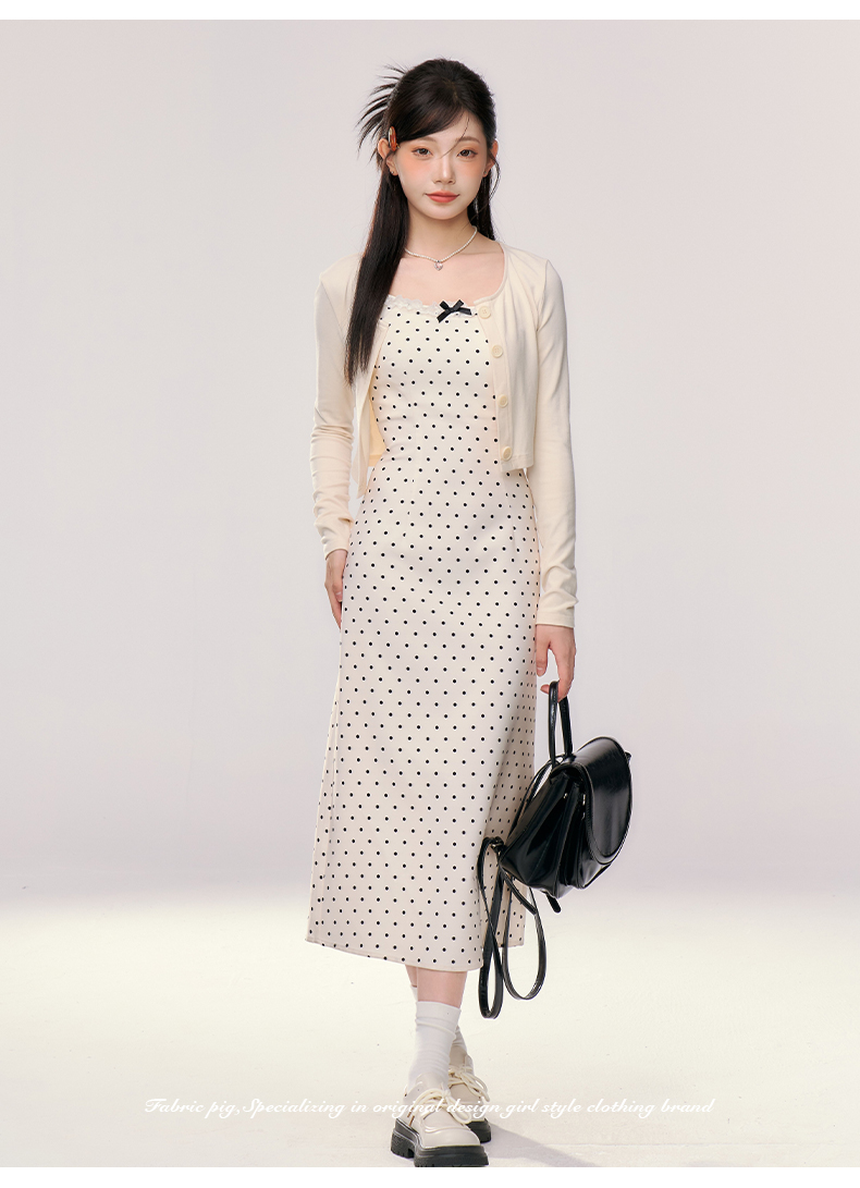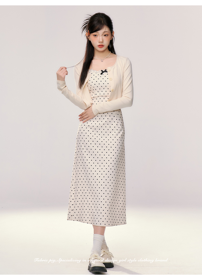 热卖织物猪 波波奶茶 波点吊带连衣裙套装女早秋流行穿搭开衫两件套