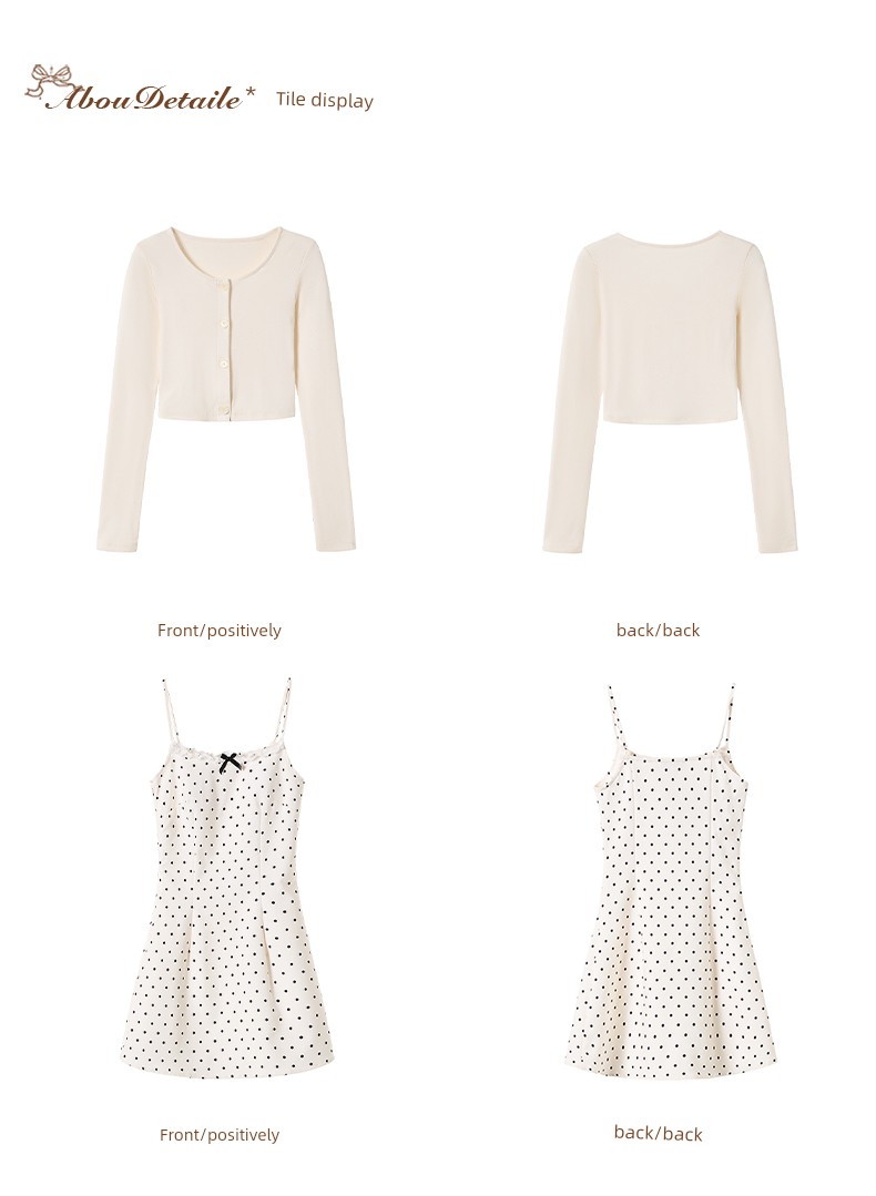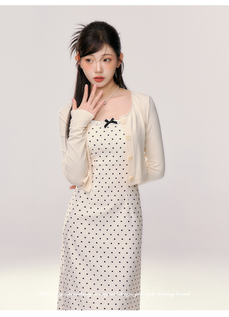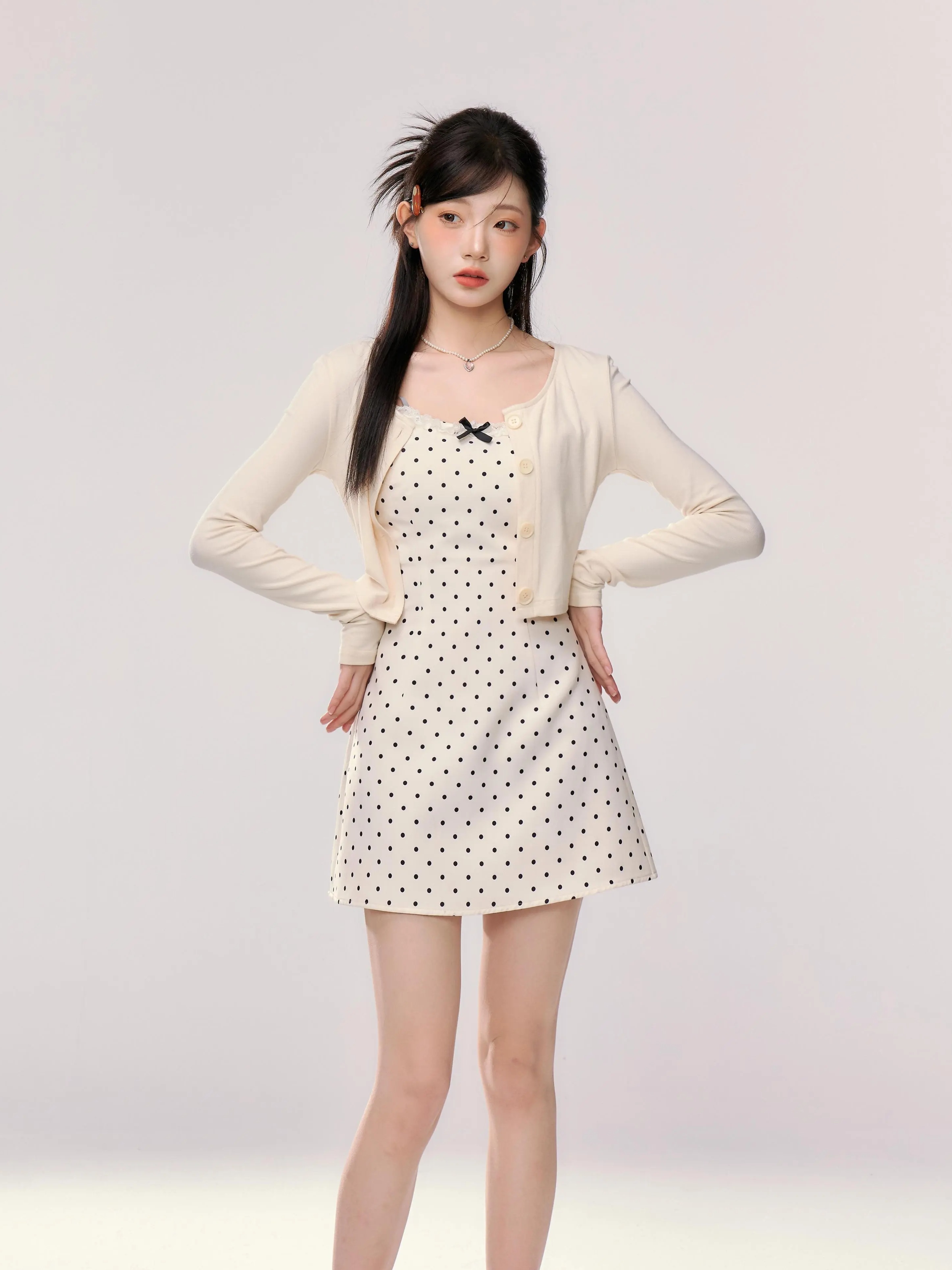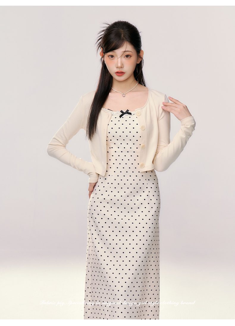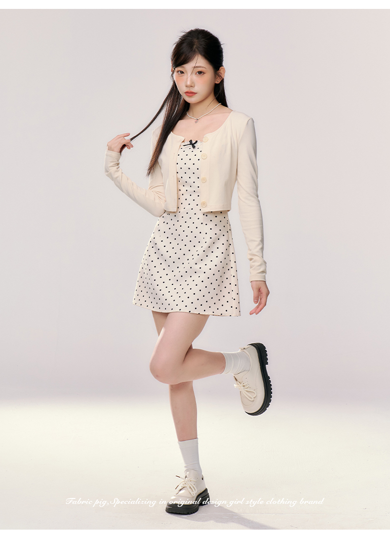 热卖织物猪 波波奶茶 波点吊带连衣裙套装女早秋流行穿搭开衫两件套