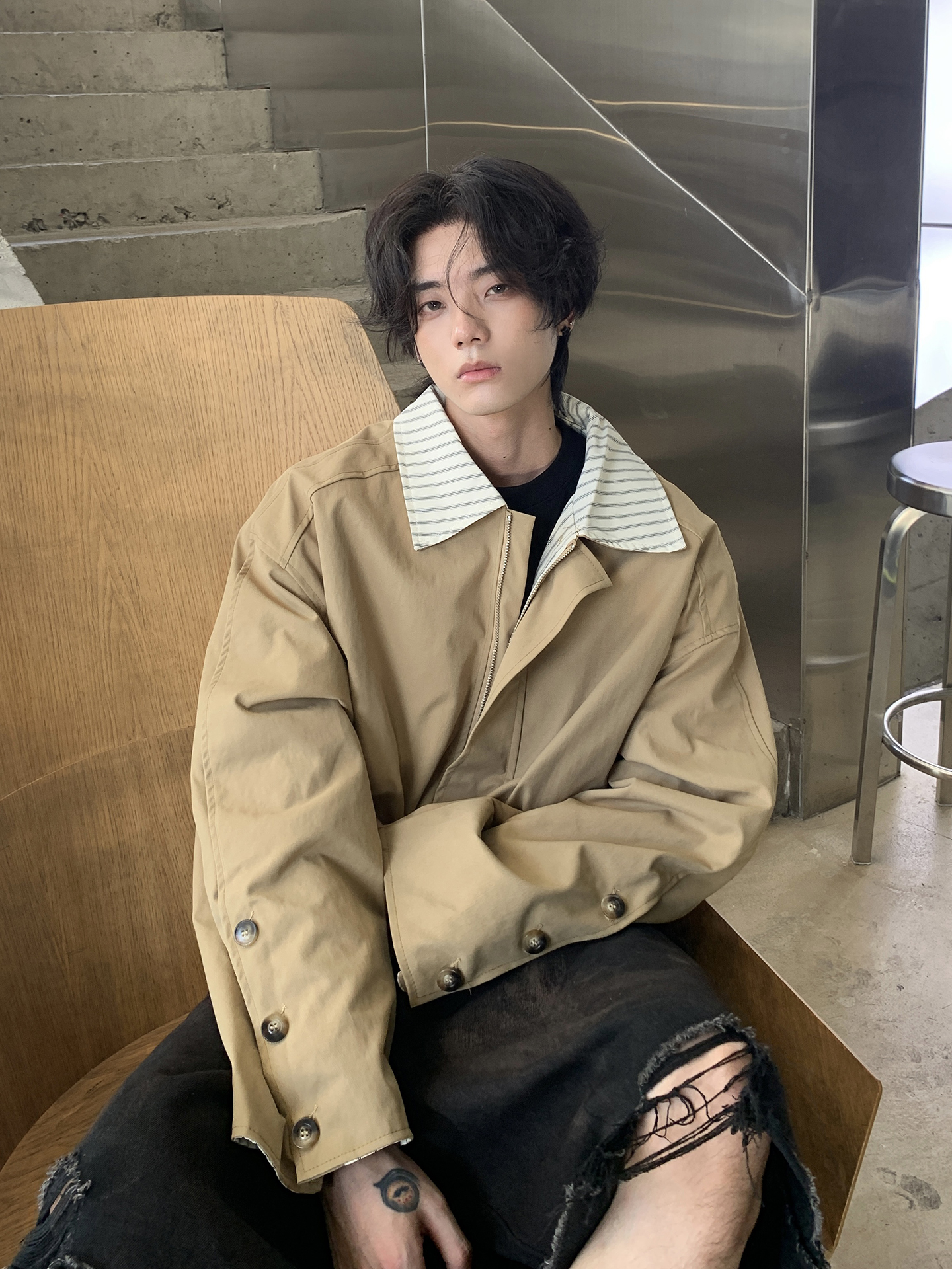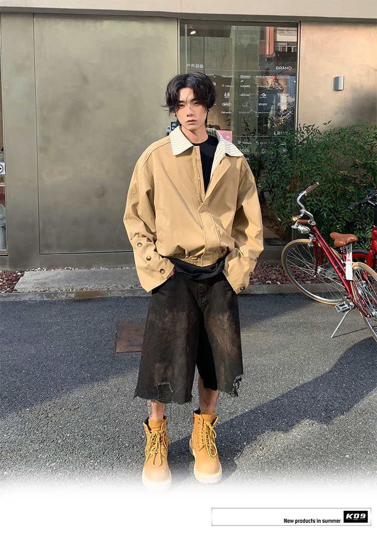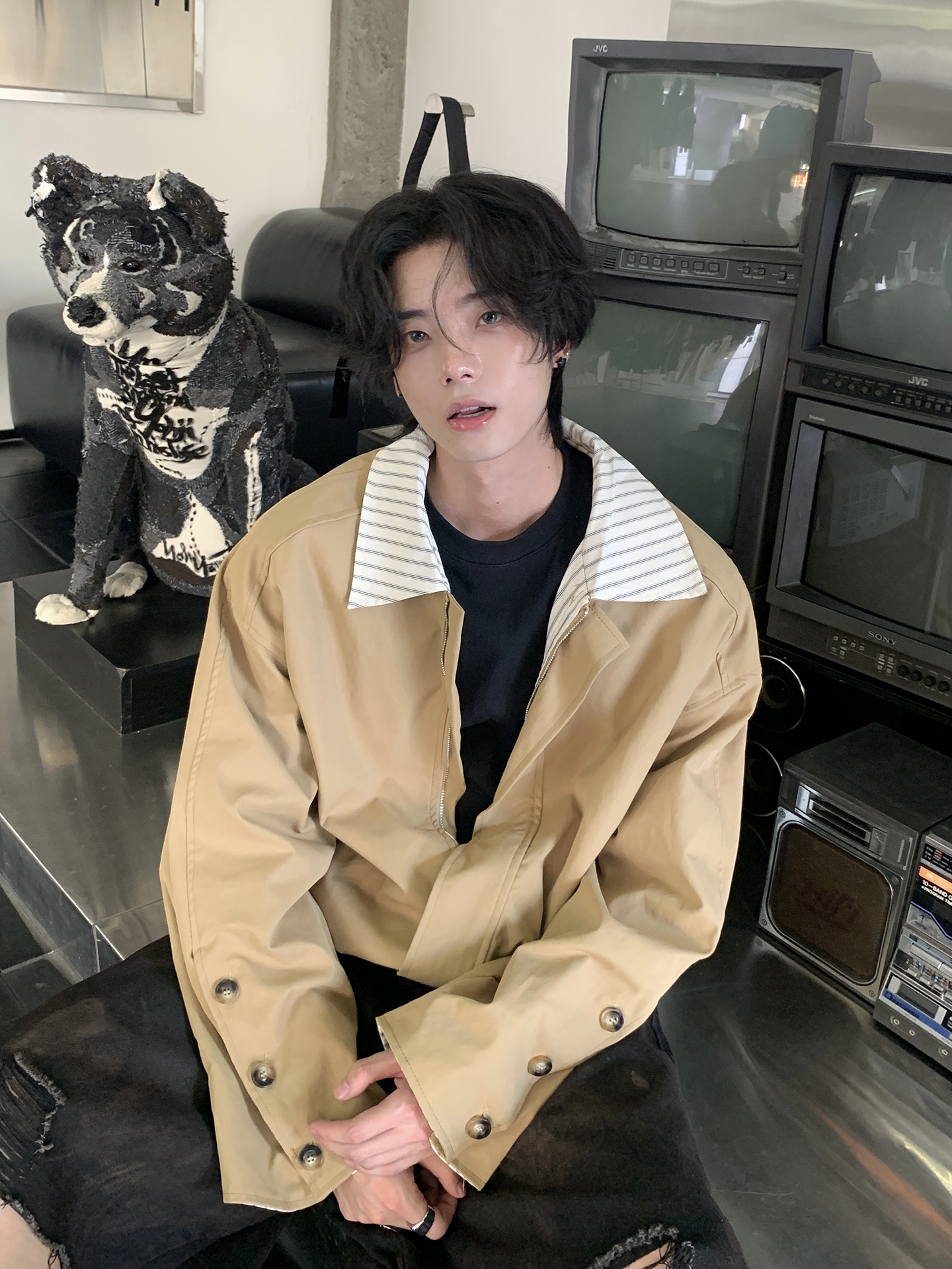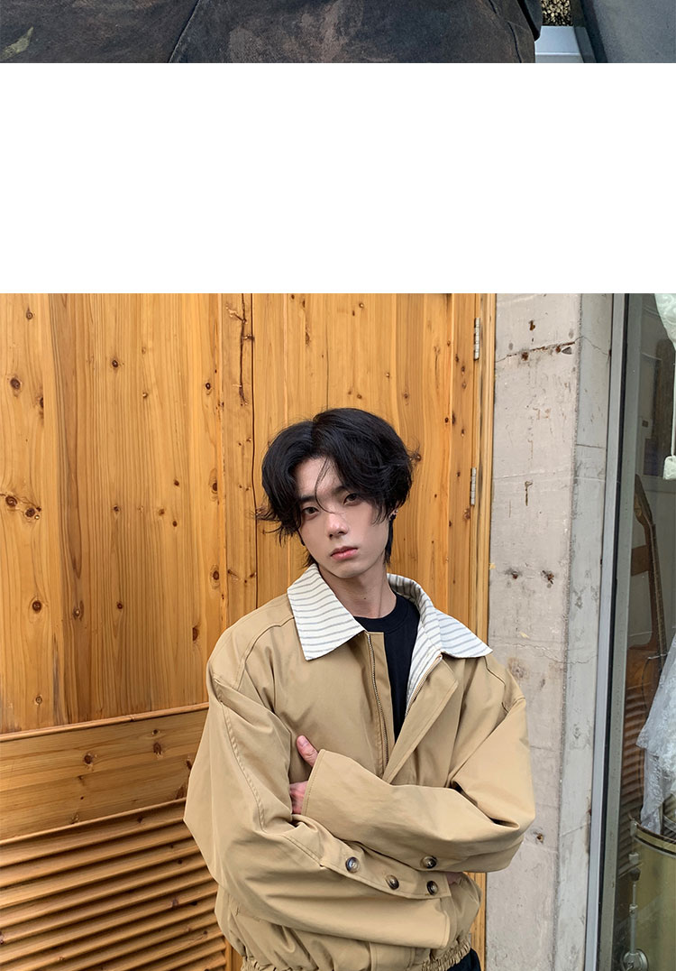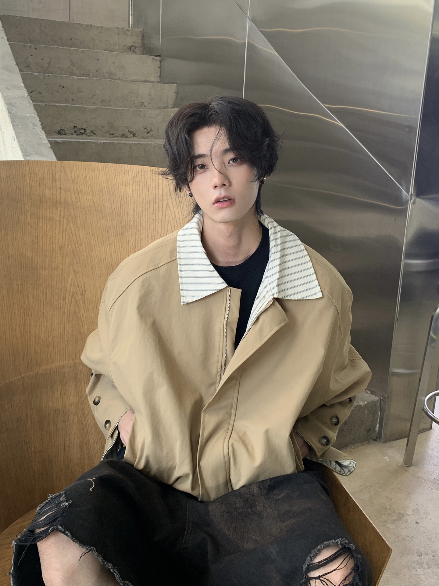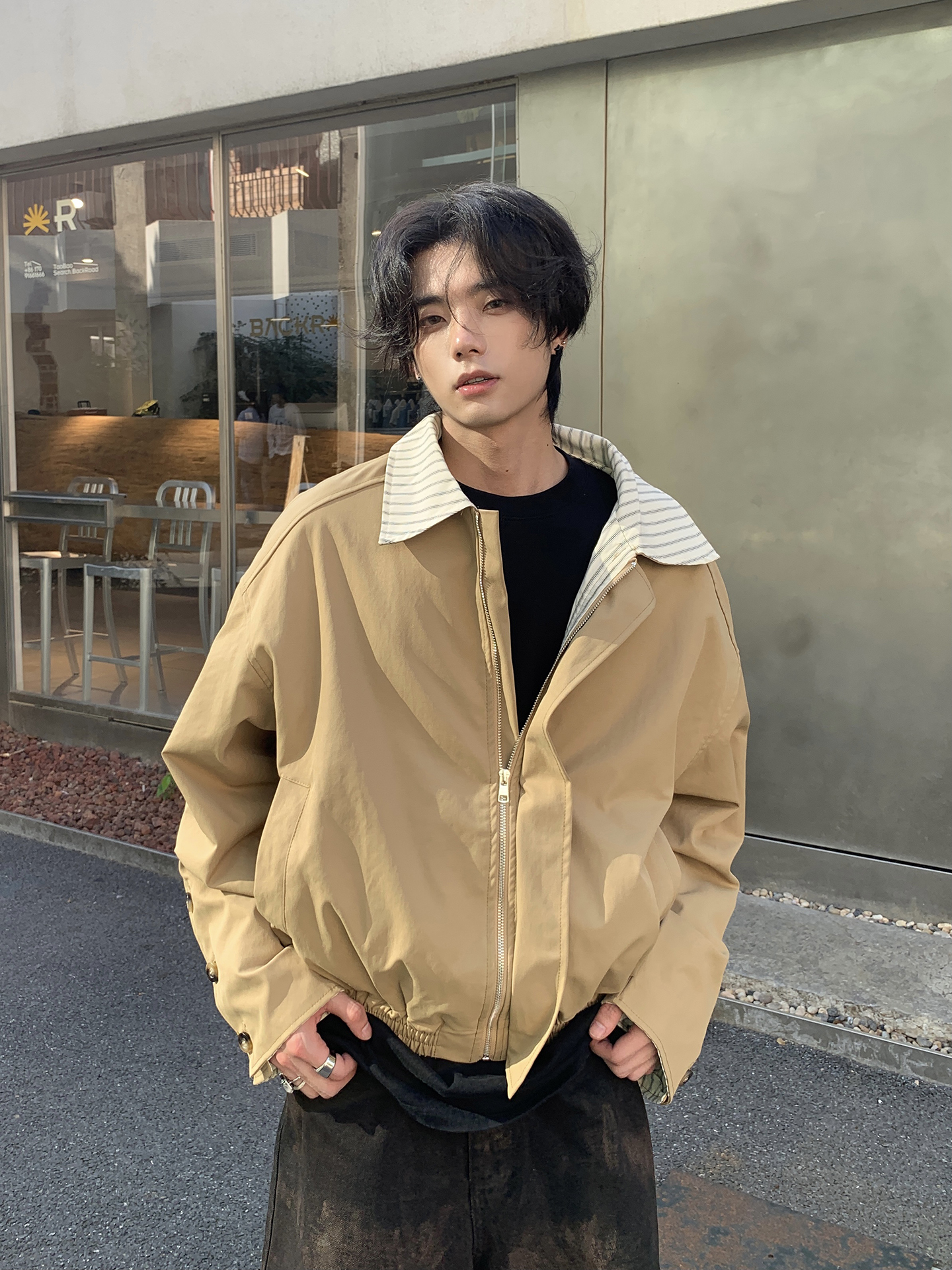 热卖K09sauce条纹假两件外套男春秋美式复古廓形潮流高级感飞行员夹克