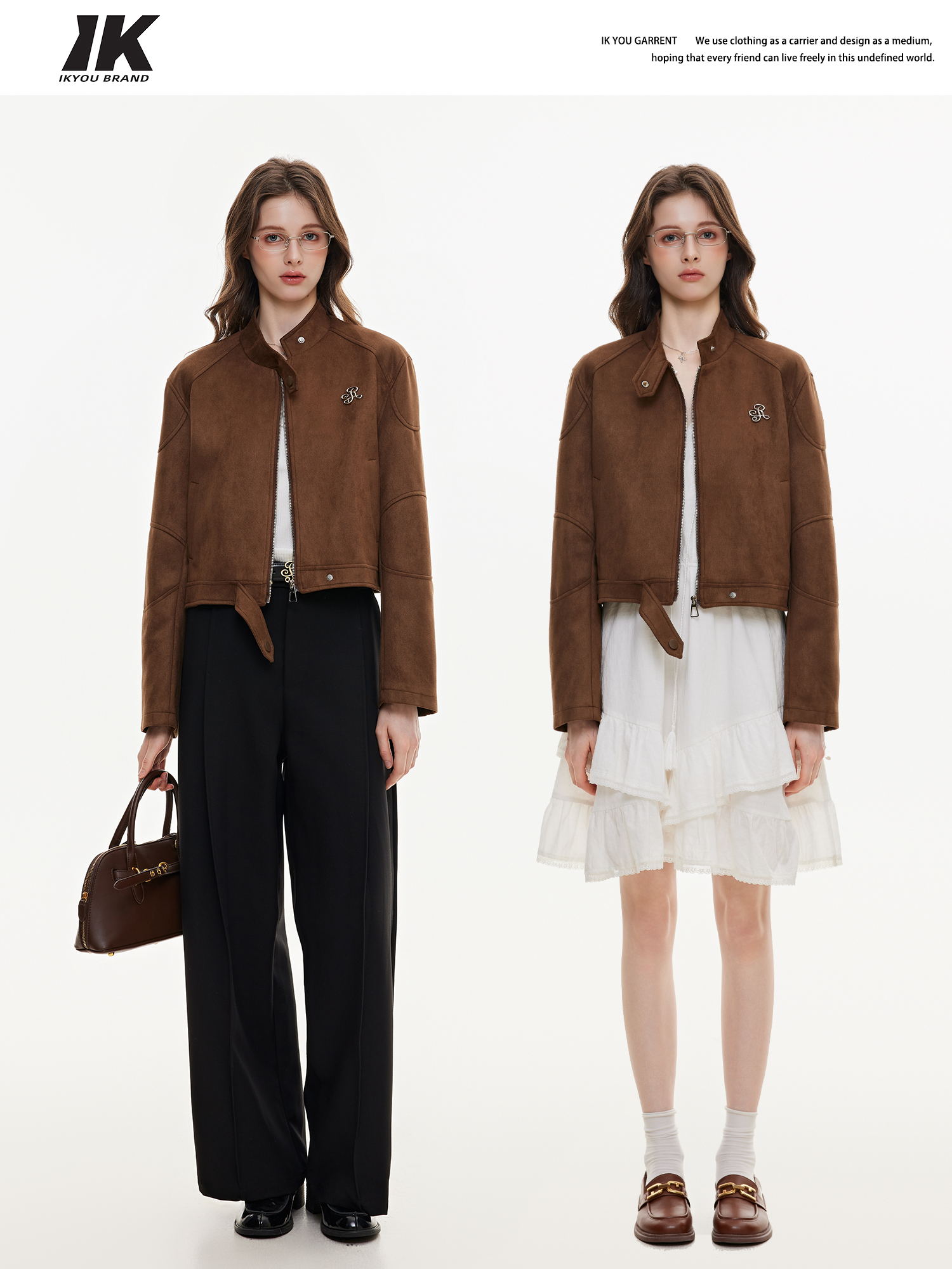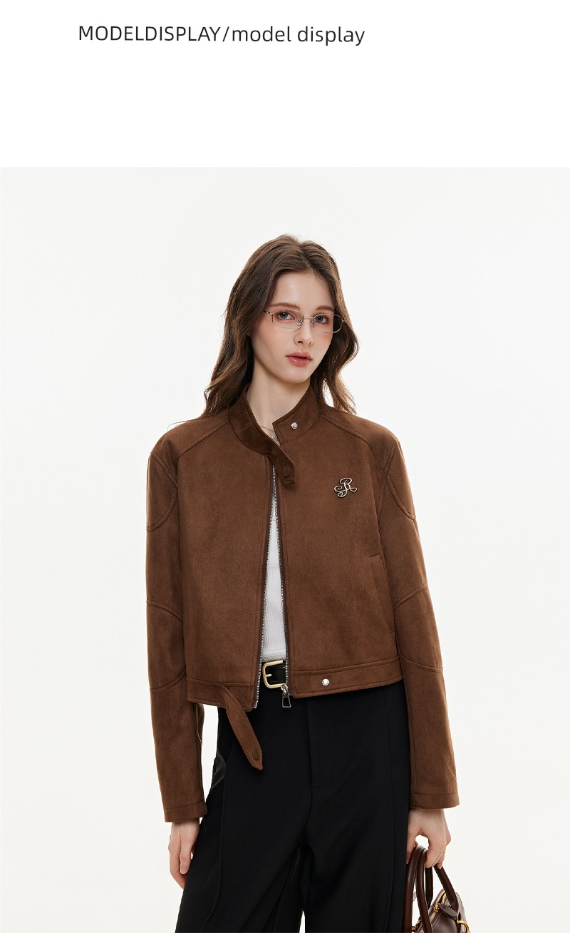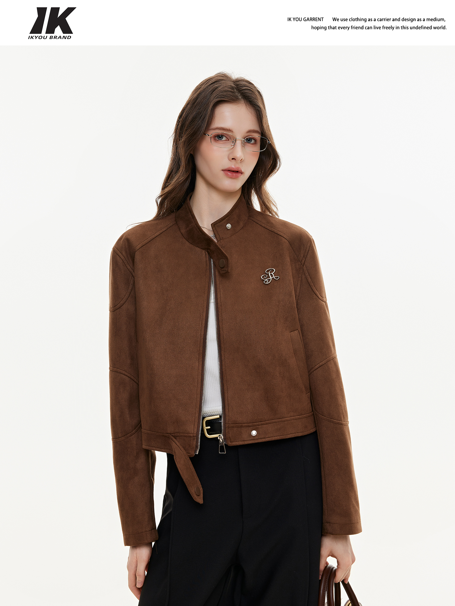热卖ikyou原创金属标复古麂皮绒外套女春秋新款短款飞行服夹克上衣服