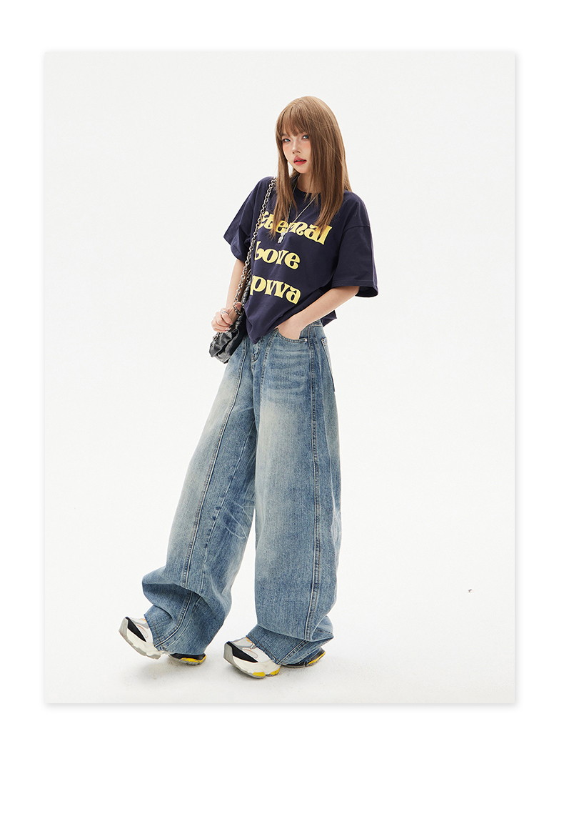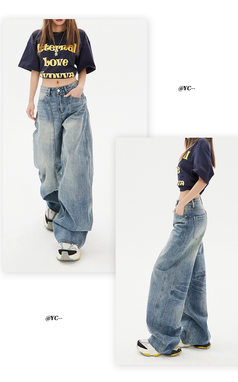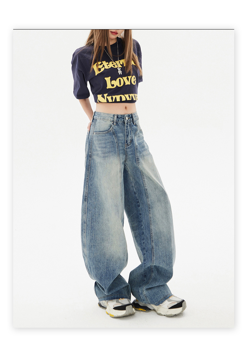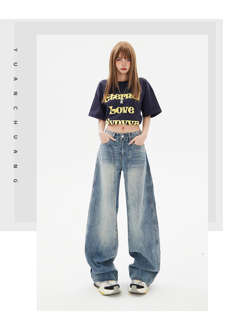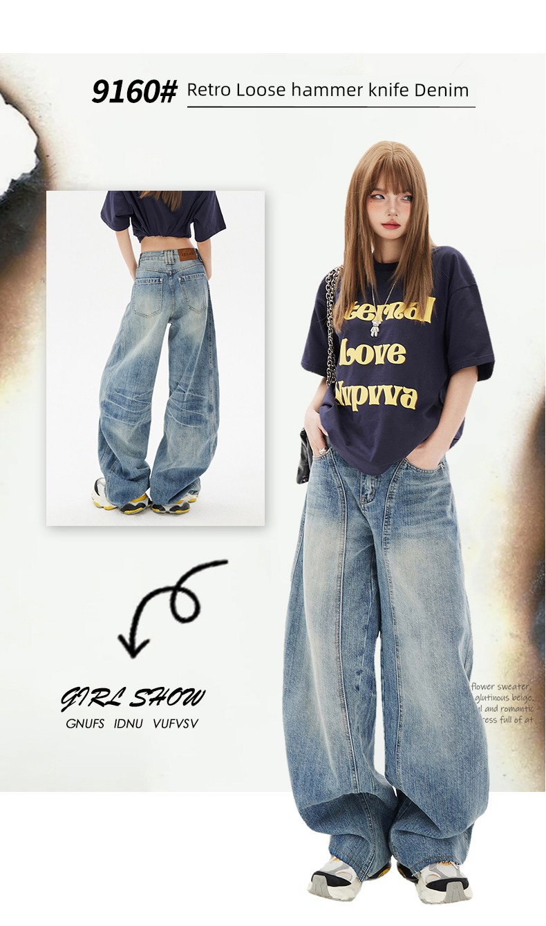 热卖复古阔腿牛仔裤女 春秋新款高腰美式辣妹垂感镰刀毛边宽松弯刀裤