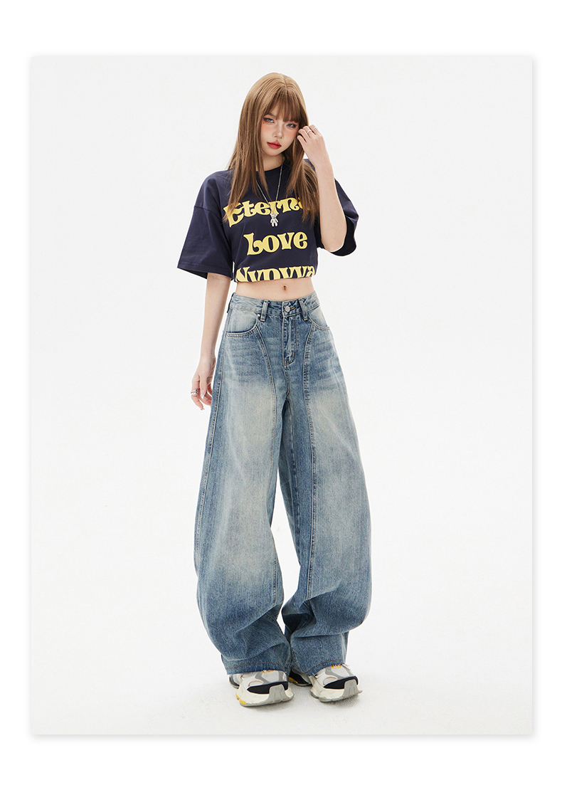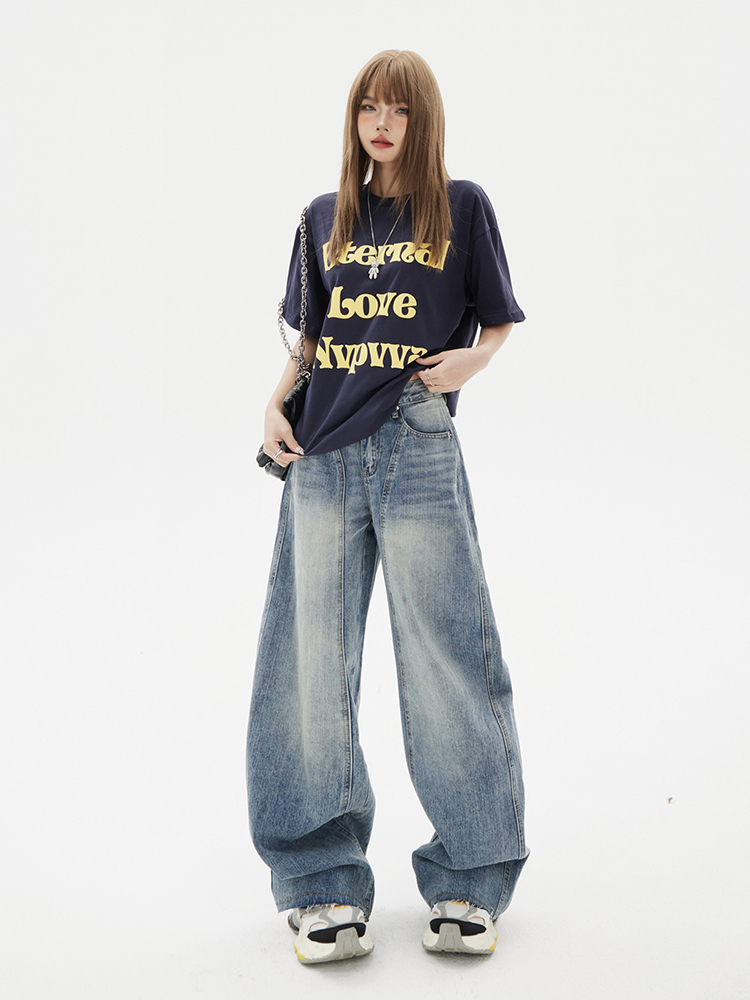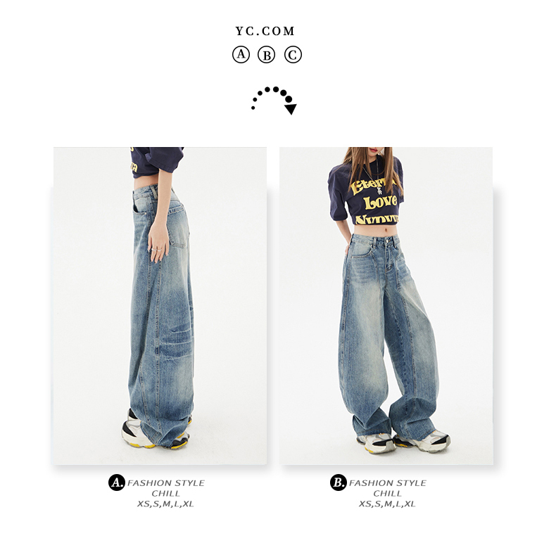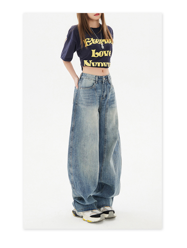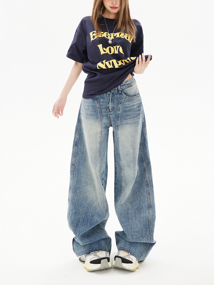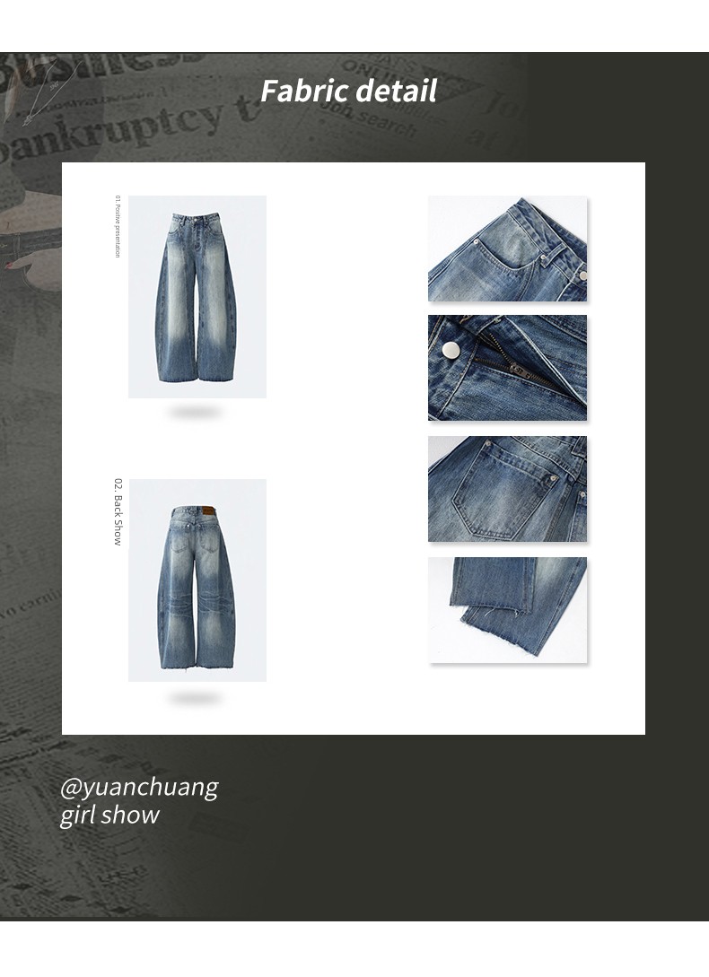 热卖复古阔腿牛仔裤女 春秋新款高腰美式辣妹垂感镰刀毛边宽松弯刀裤