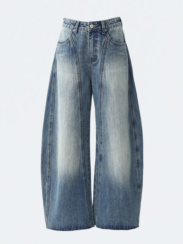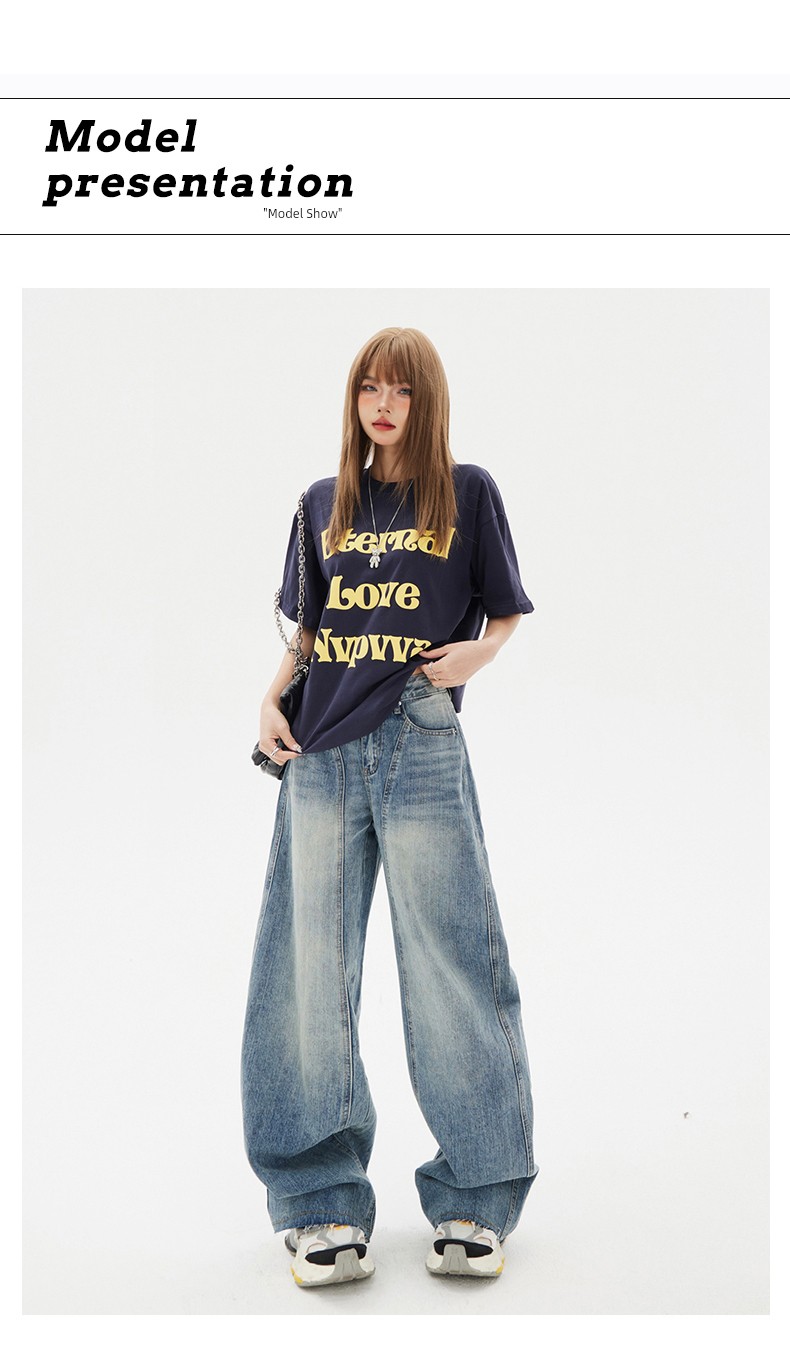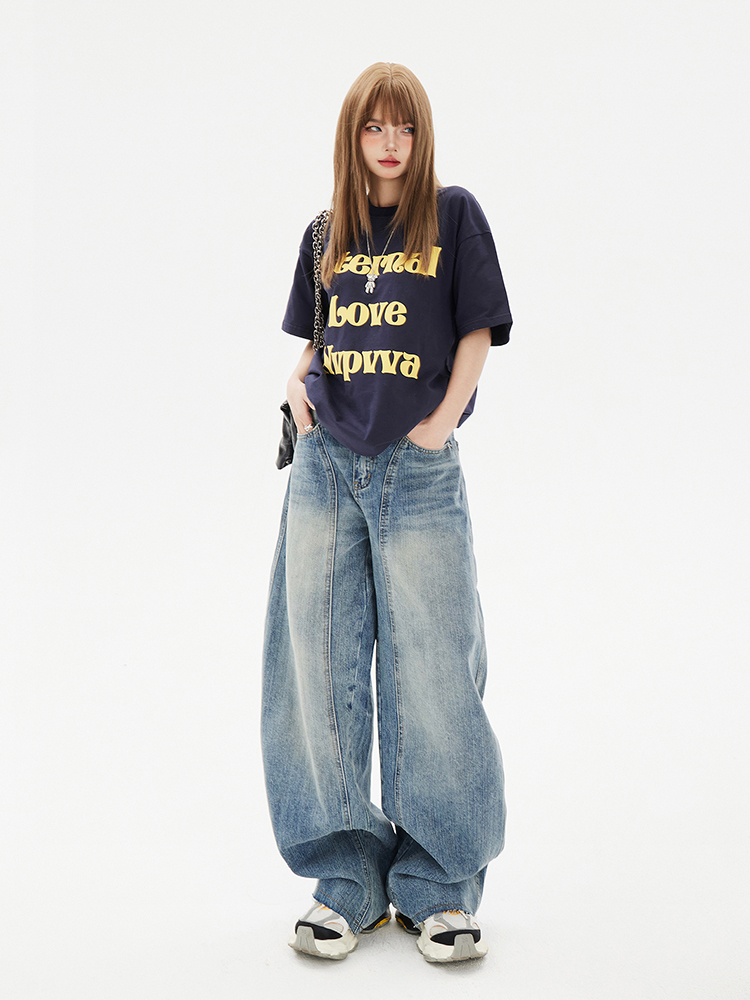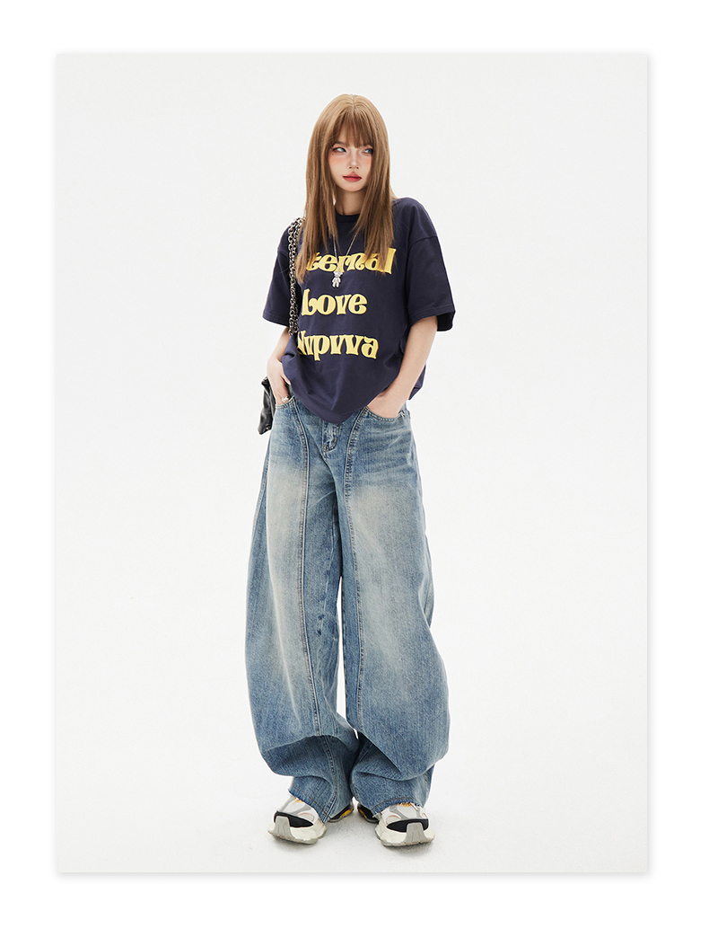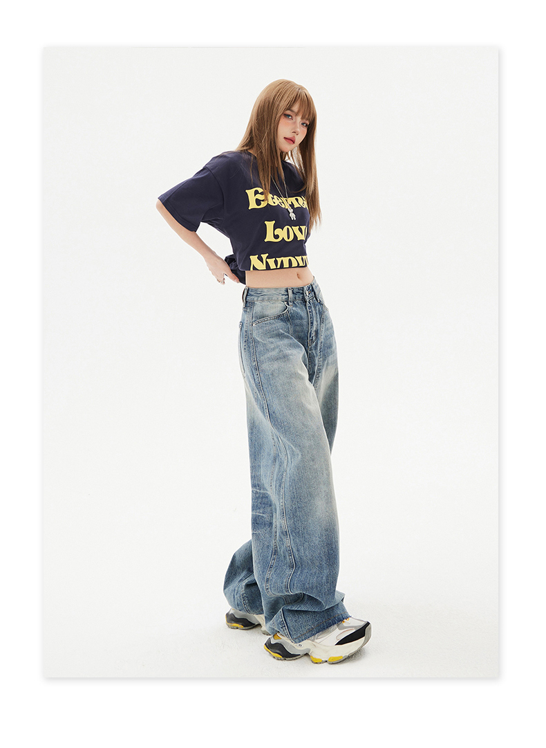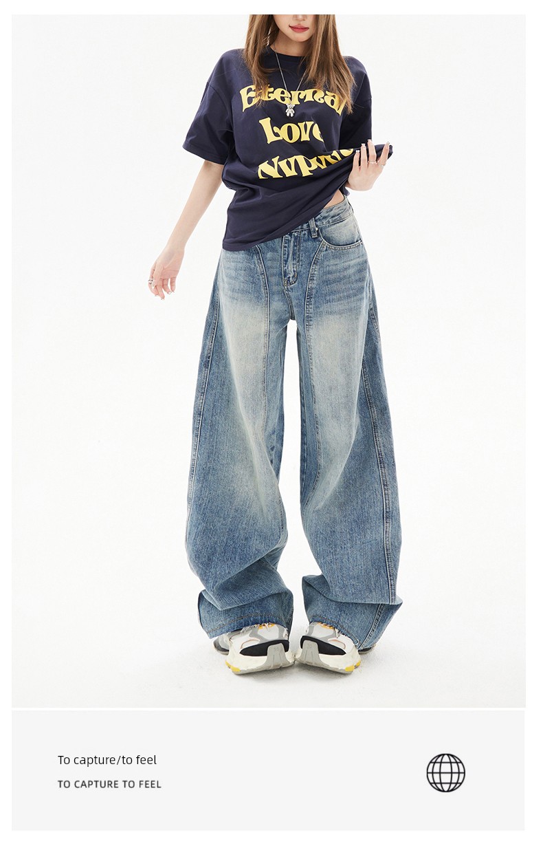 热卖复古阔腿牛仔裤女 春秋新款高腰美式辣妹垂感镰刀毛边宽松弯刀裤