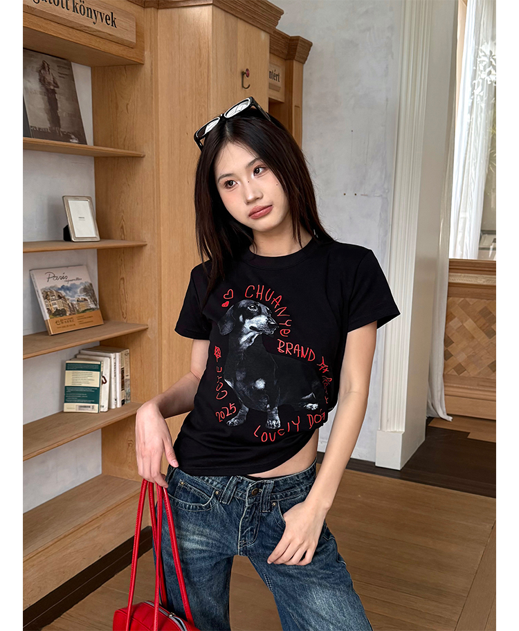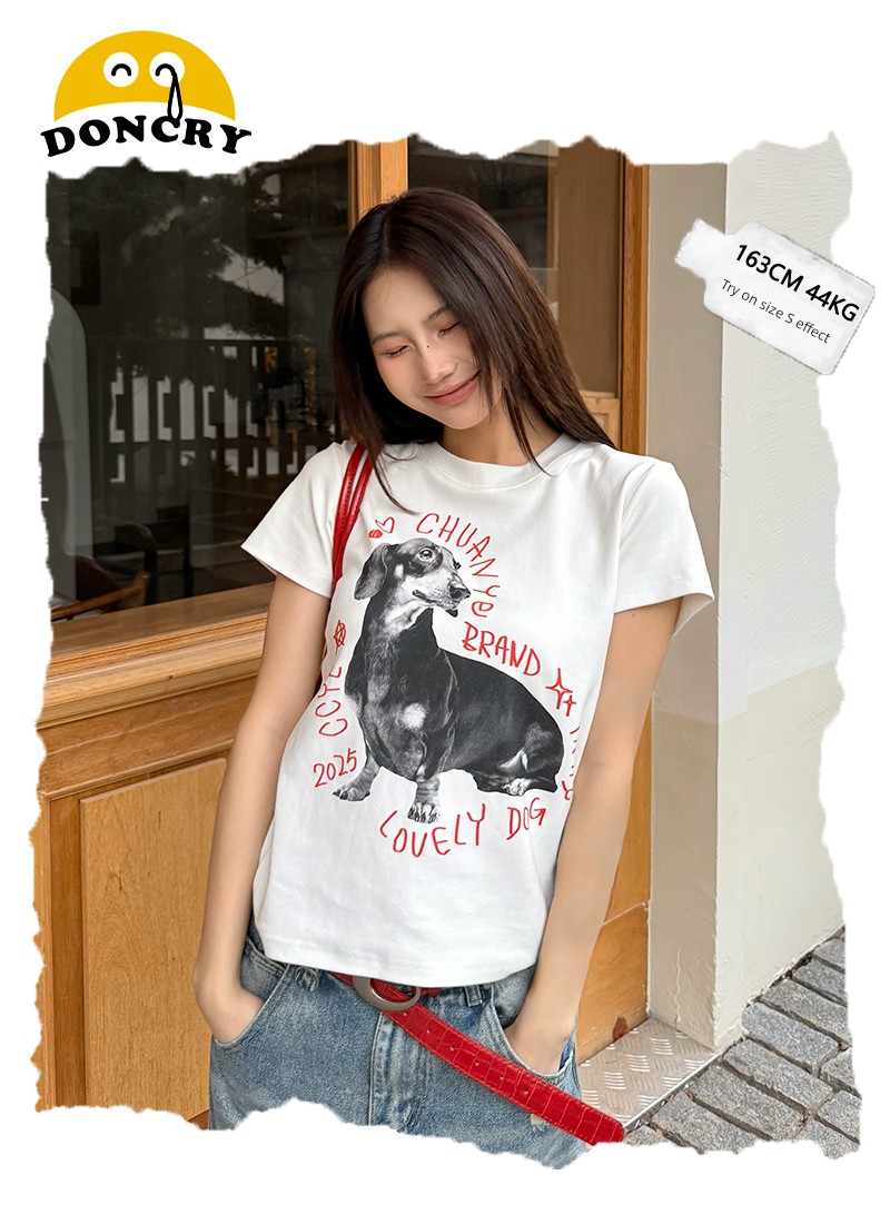 热卖Don Cry美式腊肠狗印花正肩短袖t恤女夏季新款圆领微宽松休闲上衣