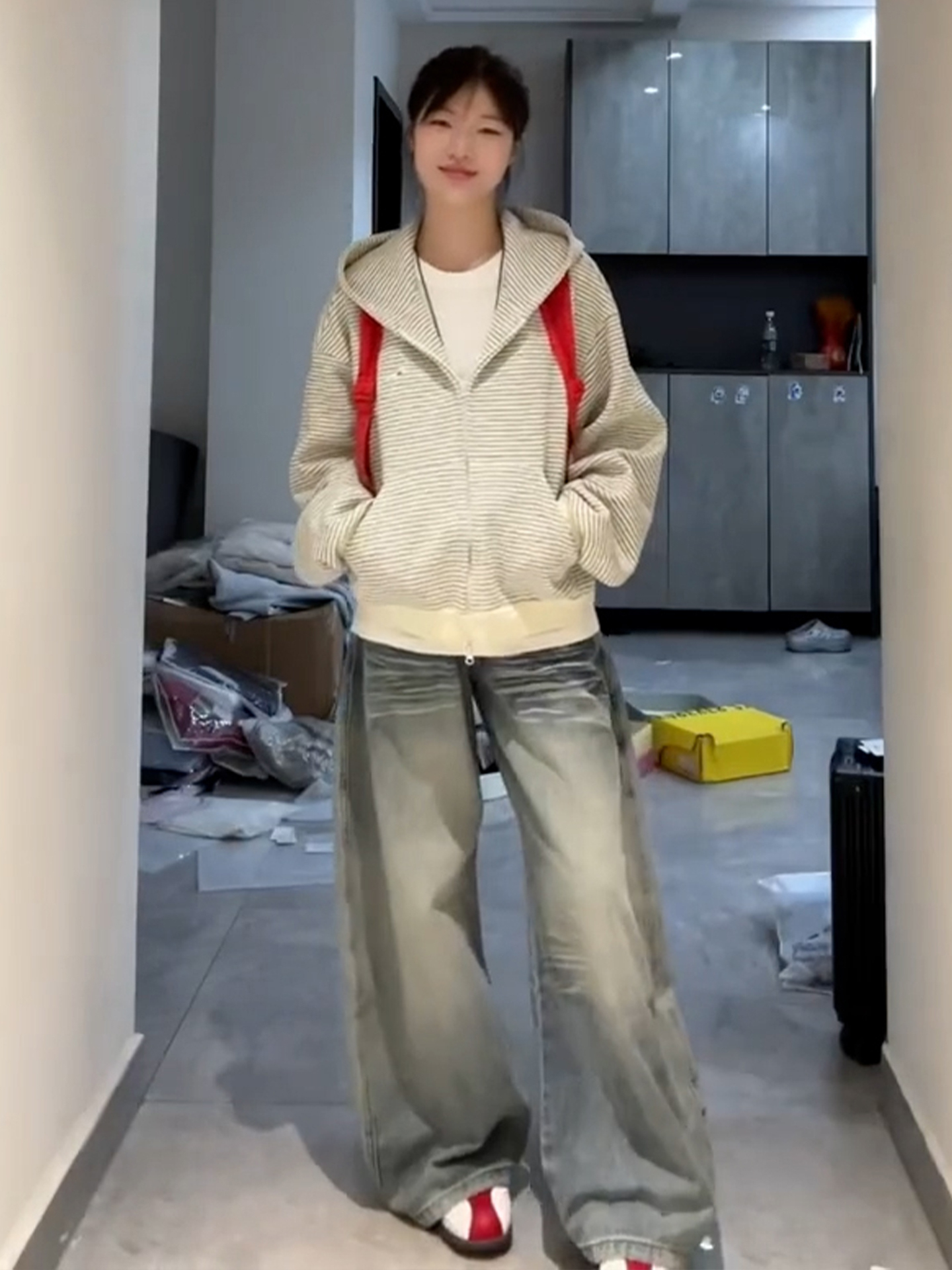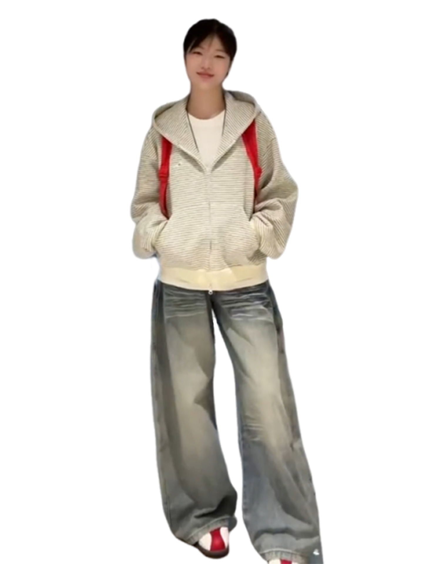 热卖韩系灰色条纹连帽卫衣外套女春秋季2025新爆款小个子开衫短款上衣