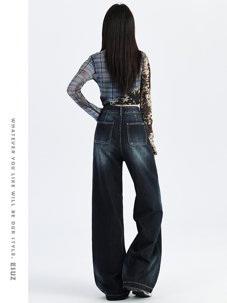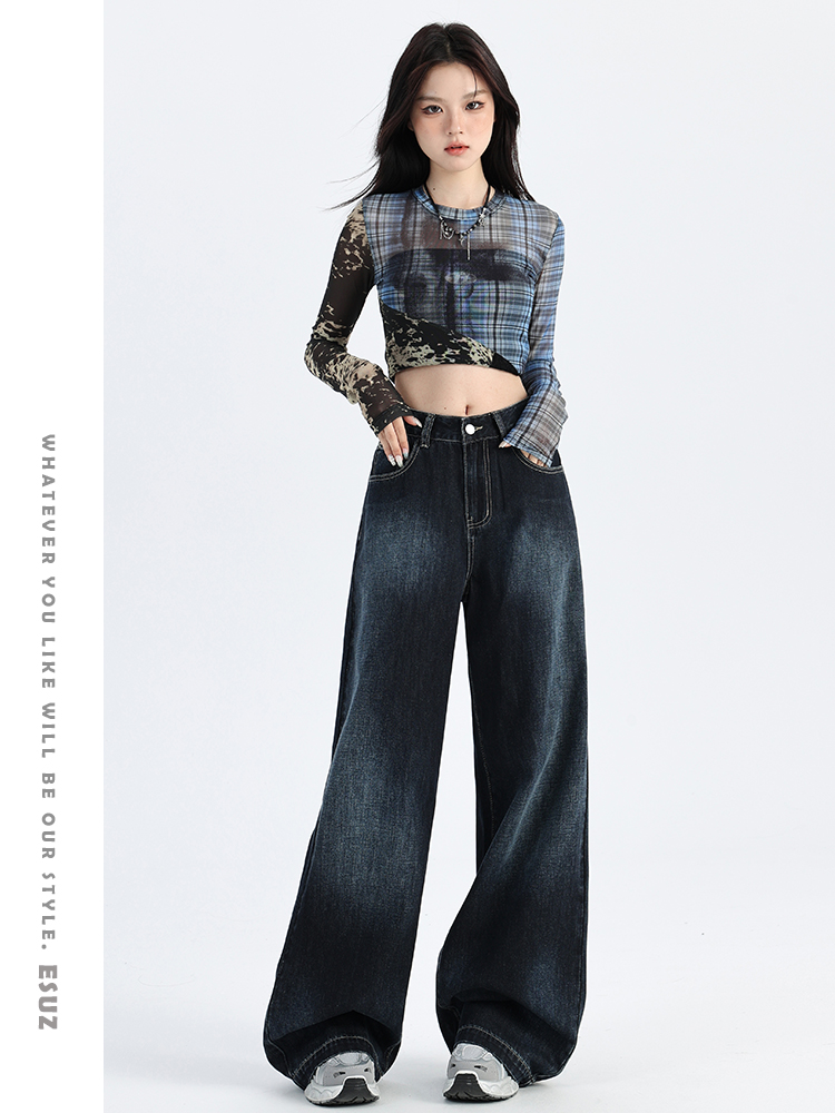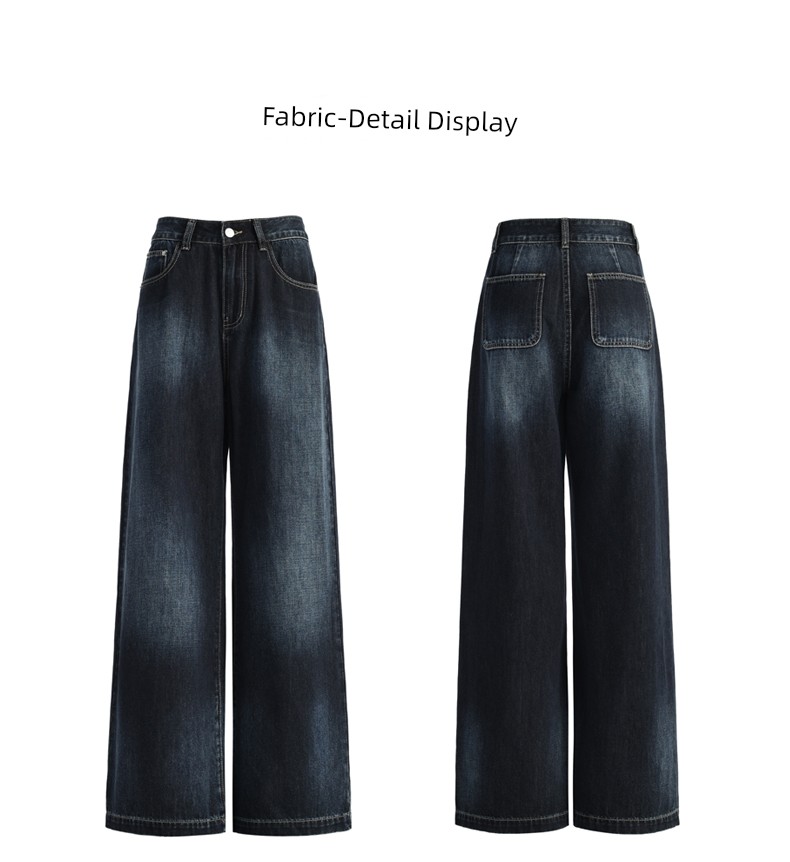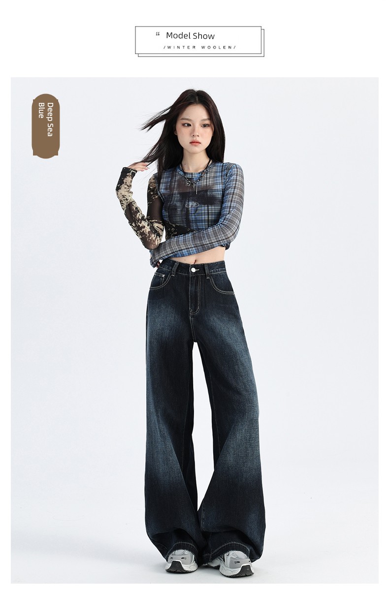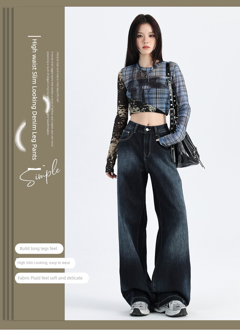 热卖深蓝色渐变阔腿牛仔裤女秋季新款高腰宽松美式松弛垂感直筒拖地裤