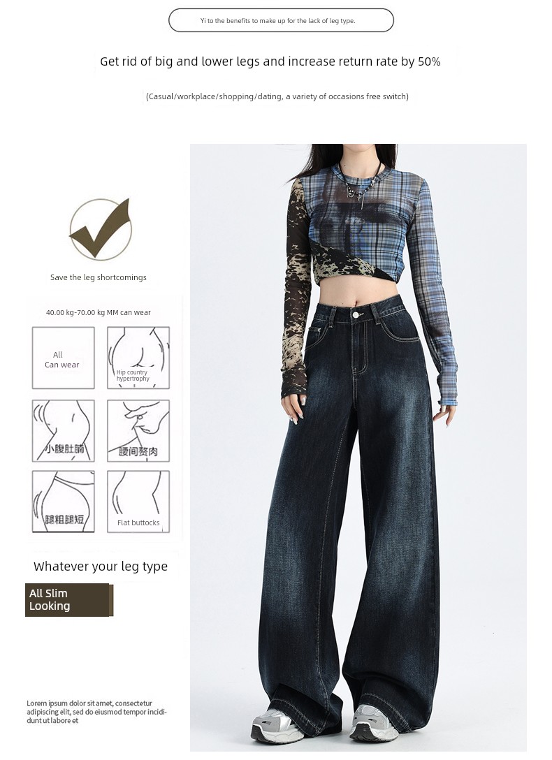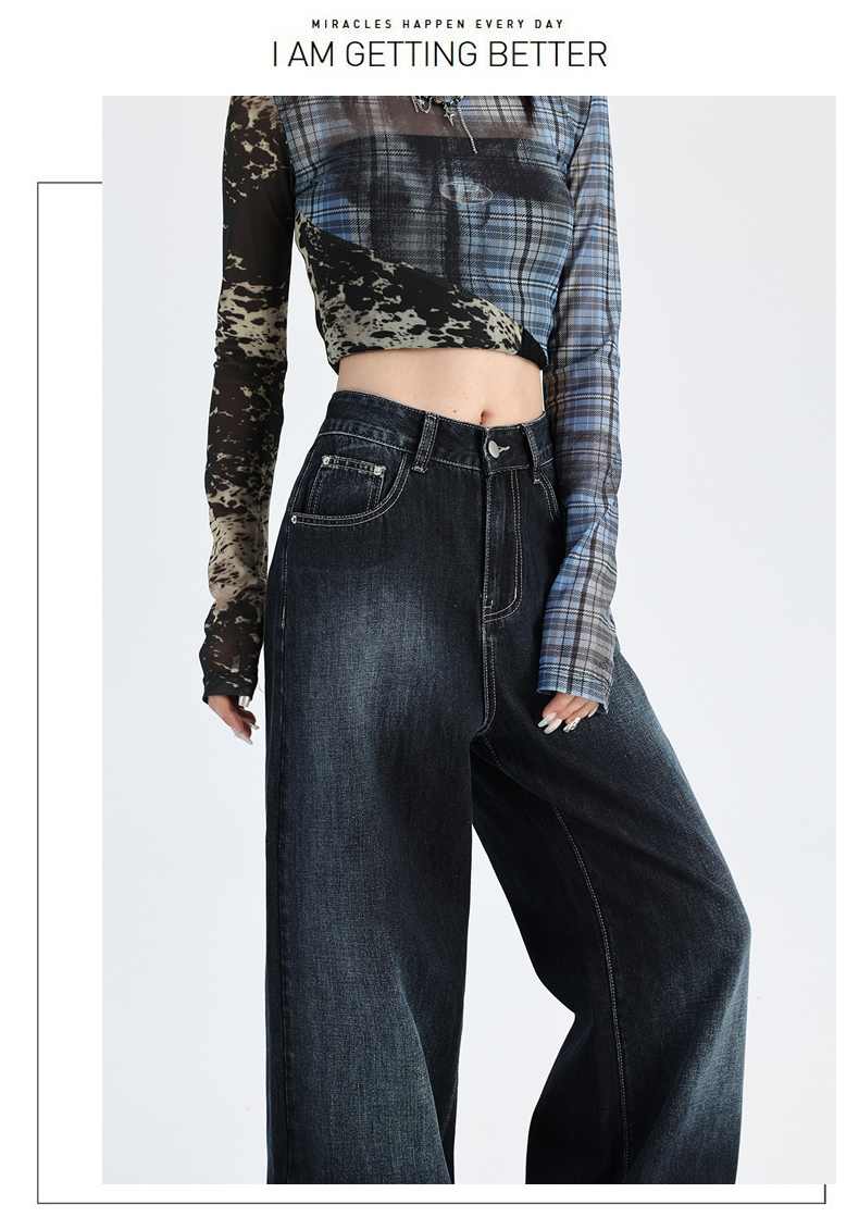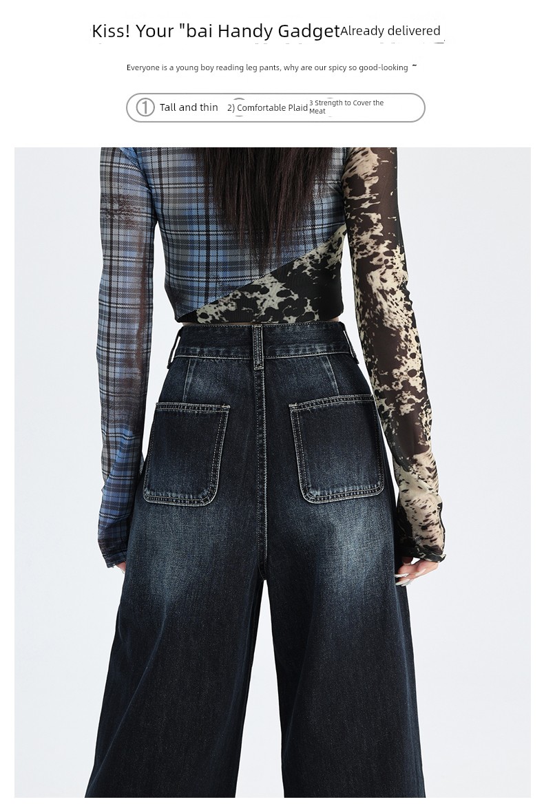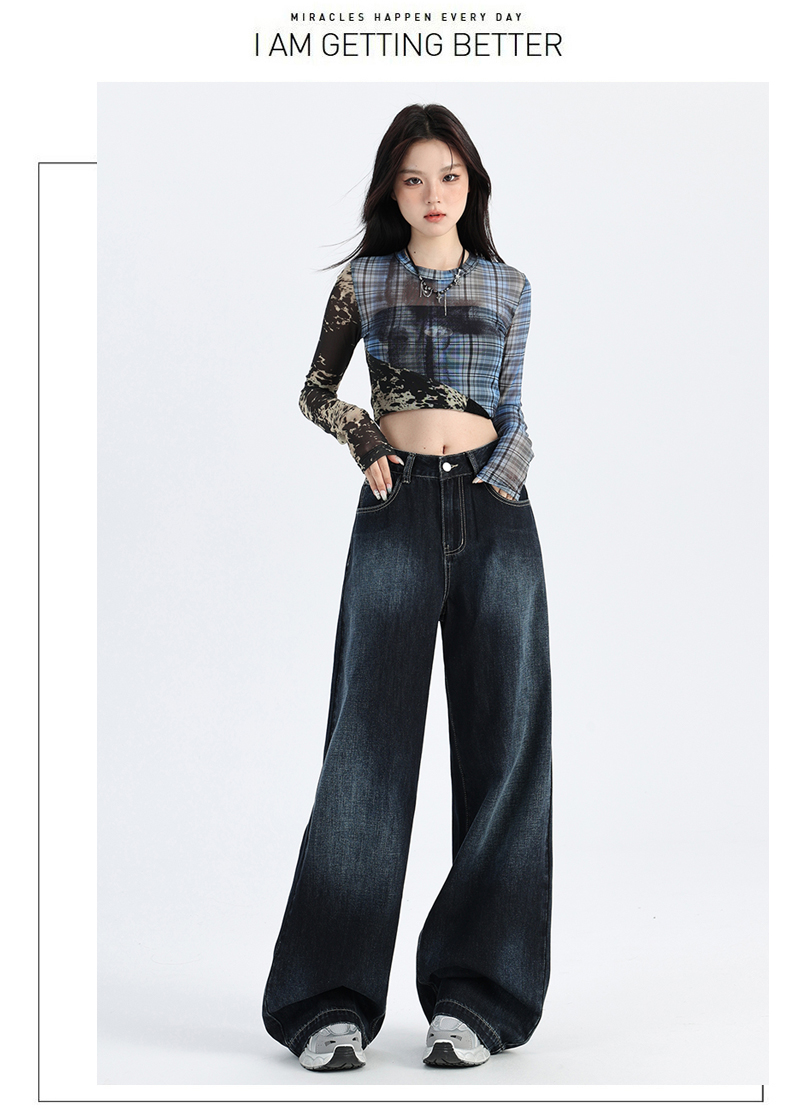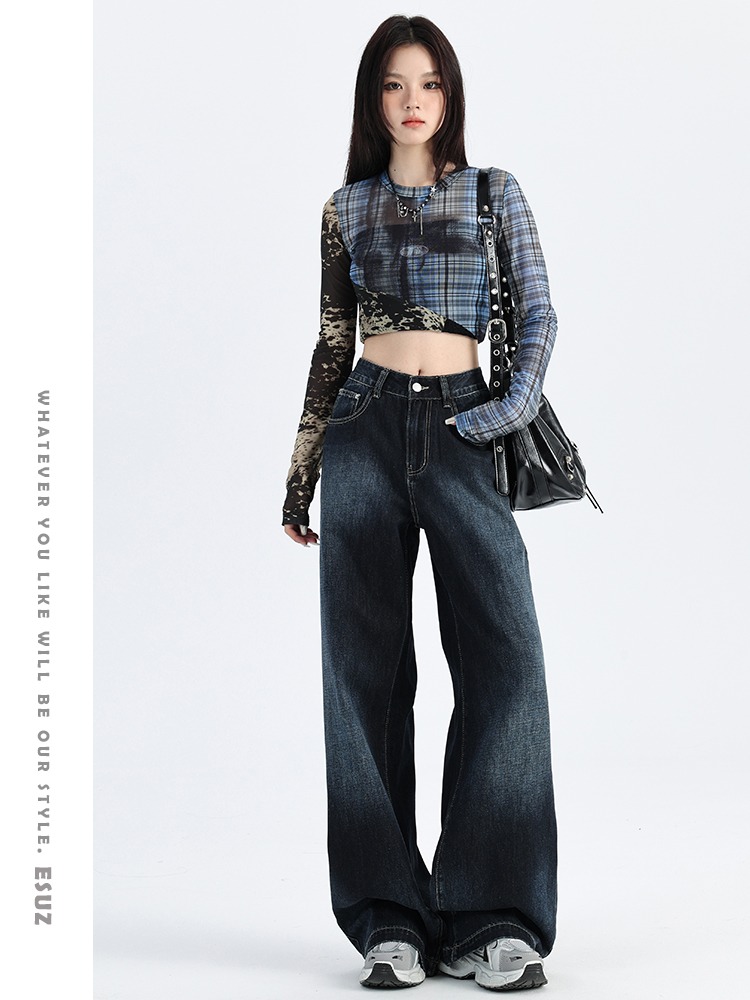 热卖深蓝色渐变阔腿牛仔裤女秋季新款高腰宽松美式松弛垂感直筒拖地裤