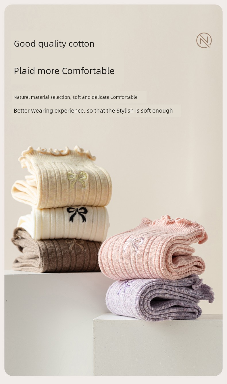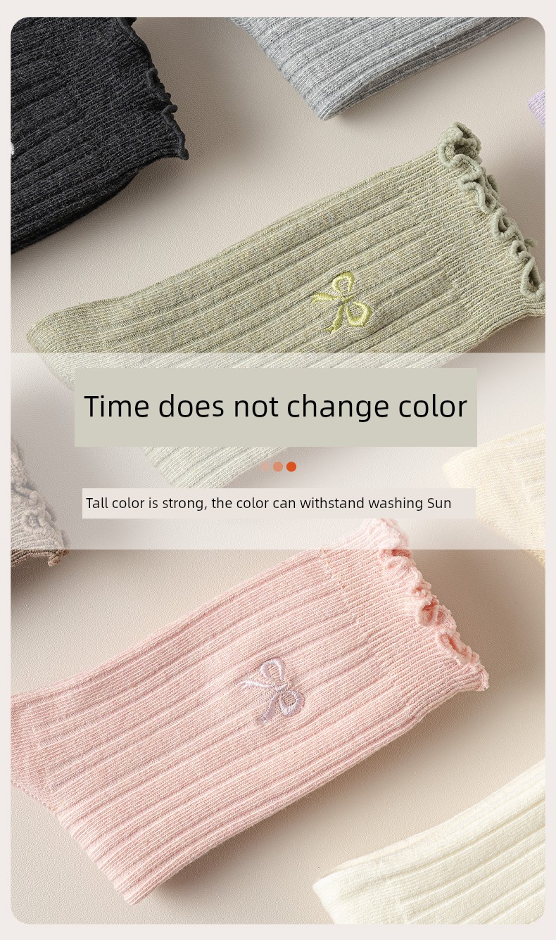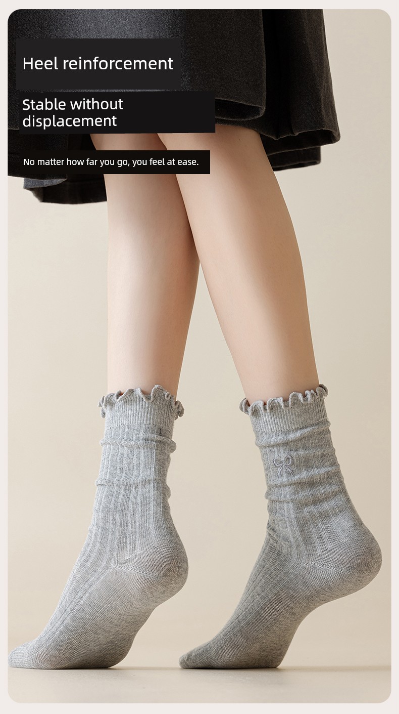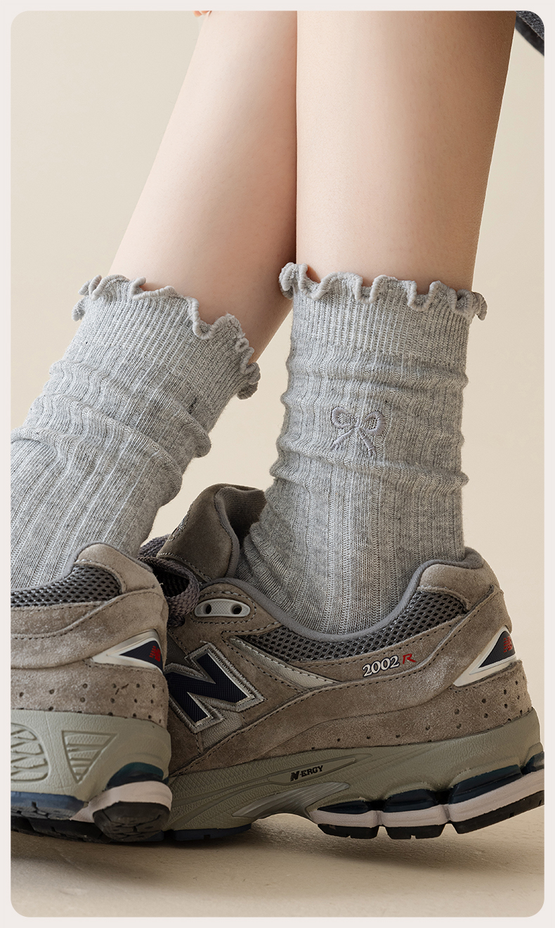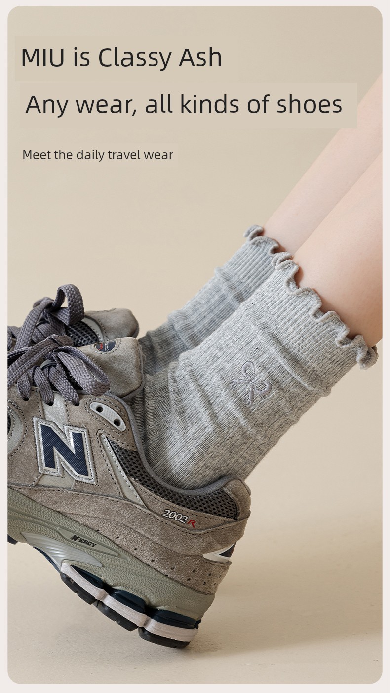 热卖灰色蝴蝶结袜子女秋季薄款中筒袜纯棉袜2025新款miu系花边堆堆袜