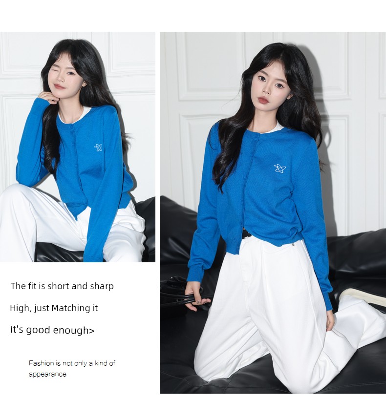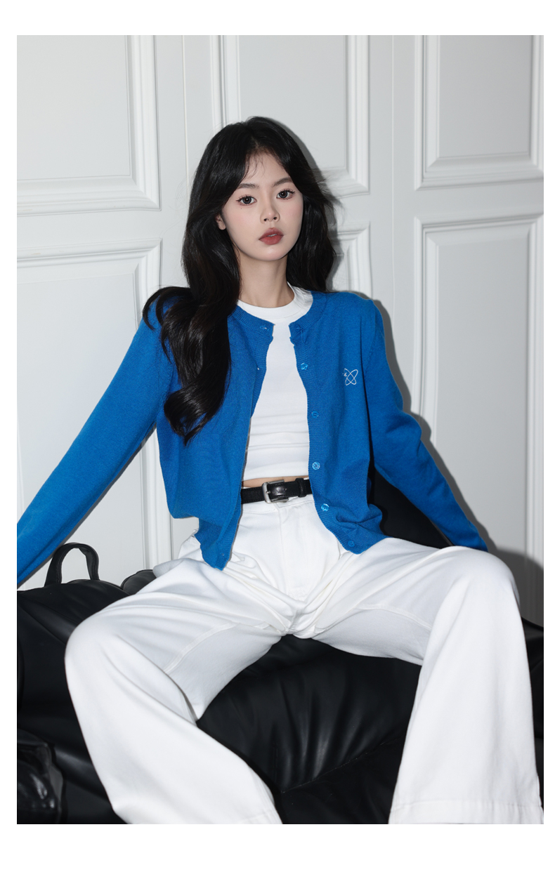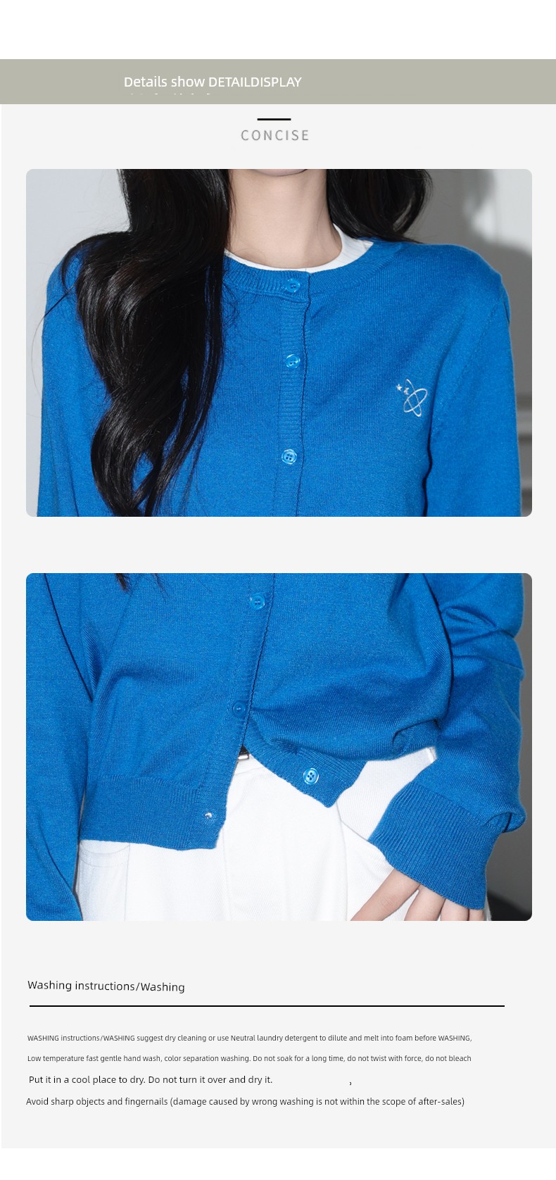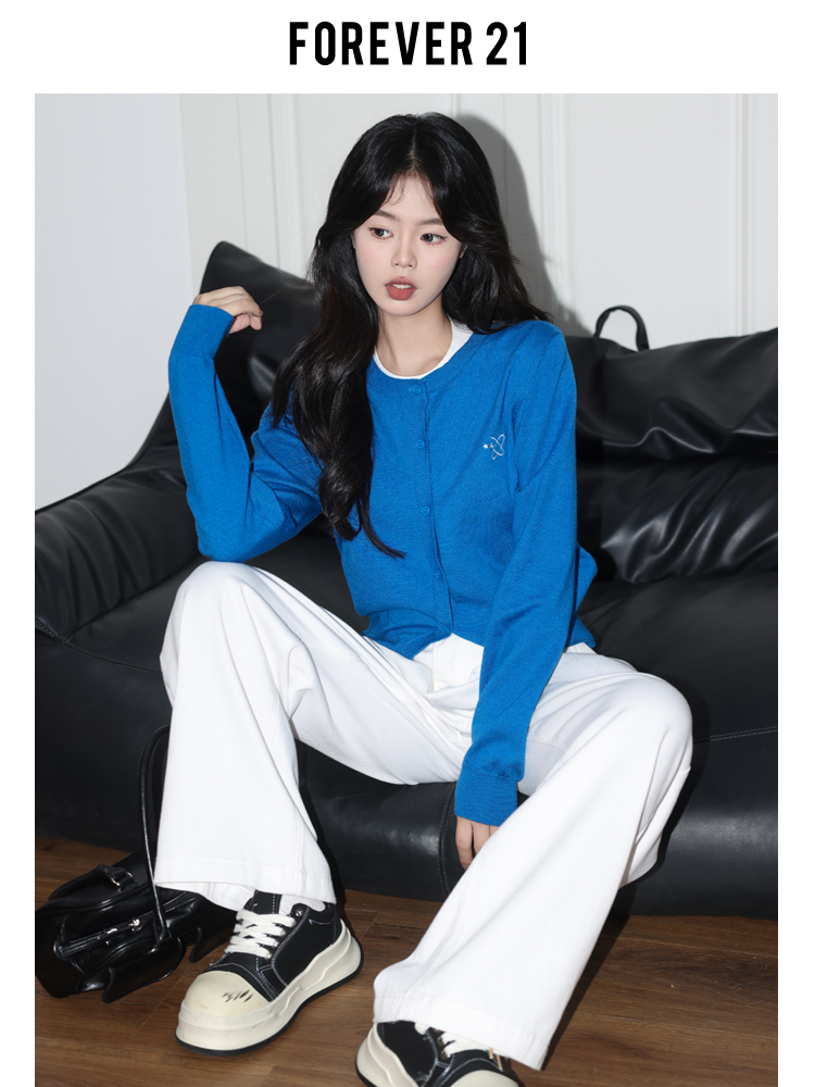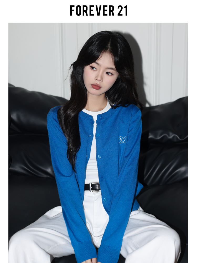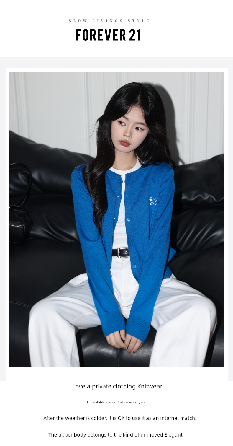 热卖Forever21克莱因蓝别致刺绣针织开衫女ins宽松上衣慵懒松弛感毛衣