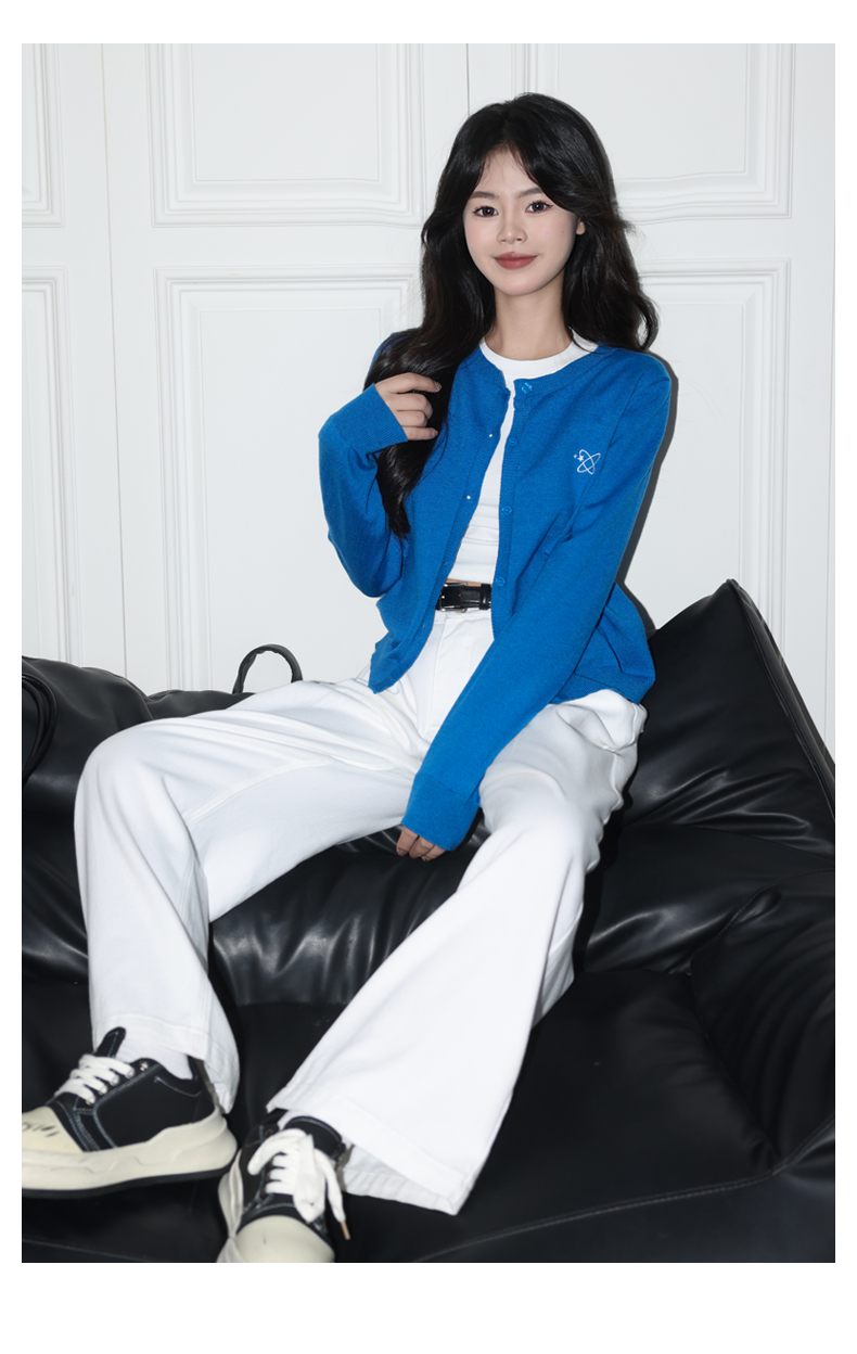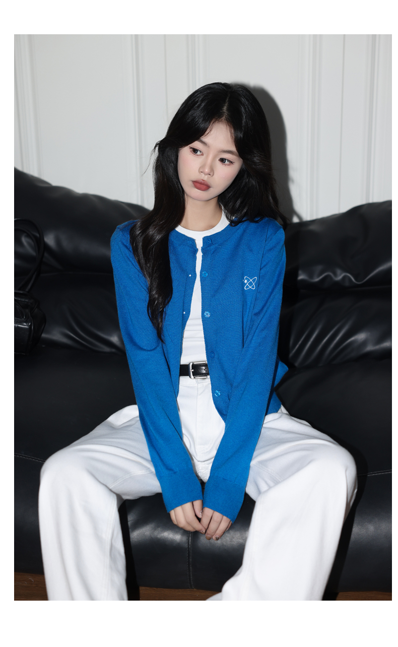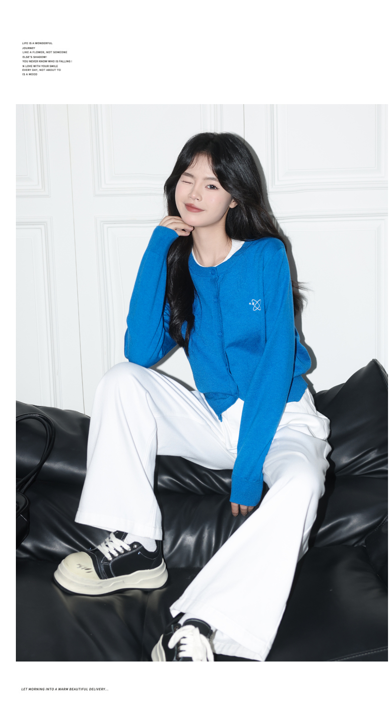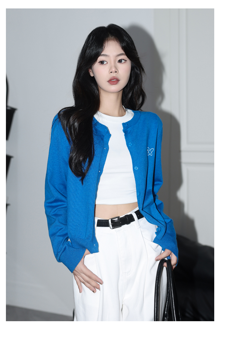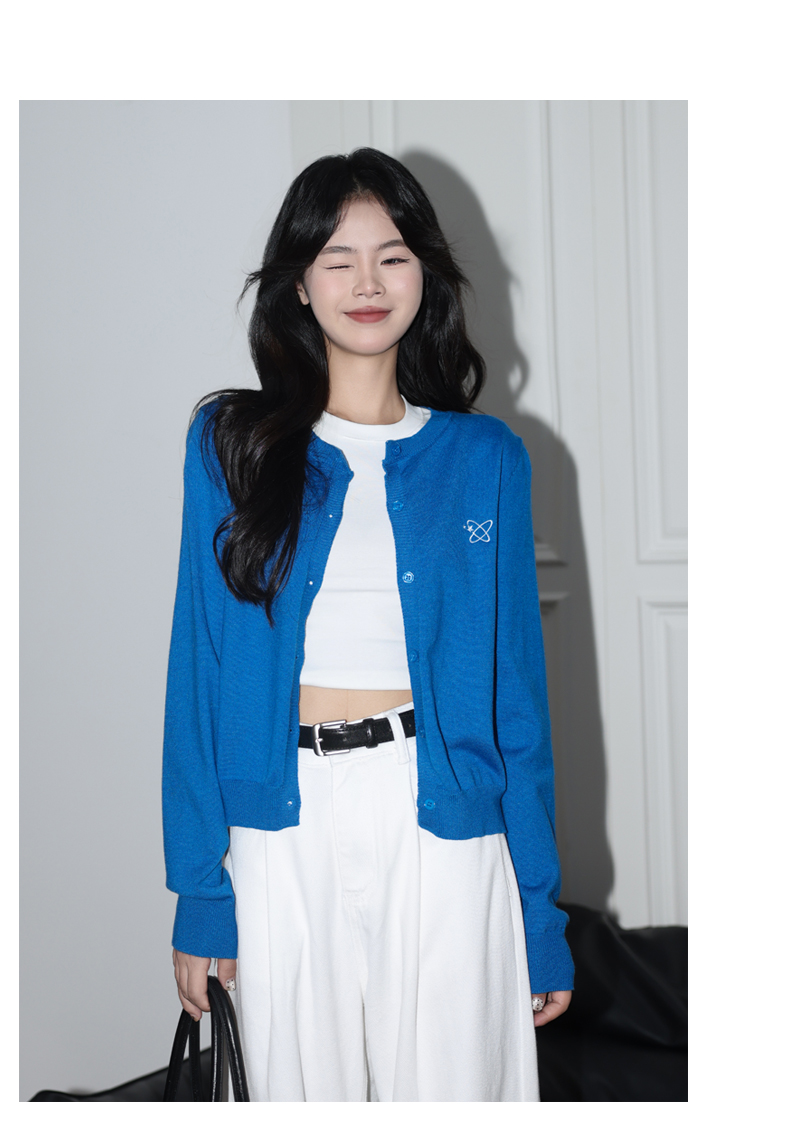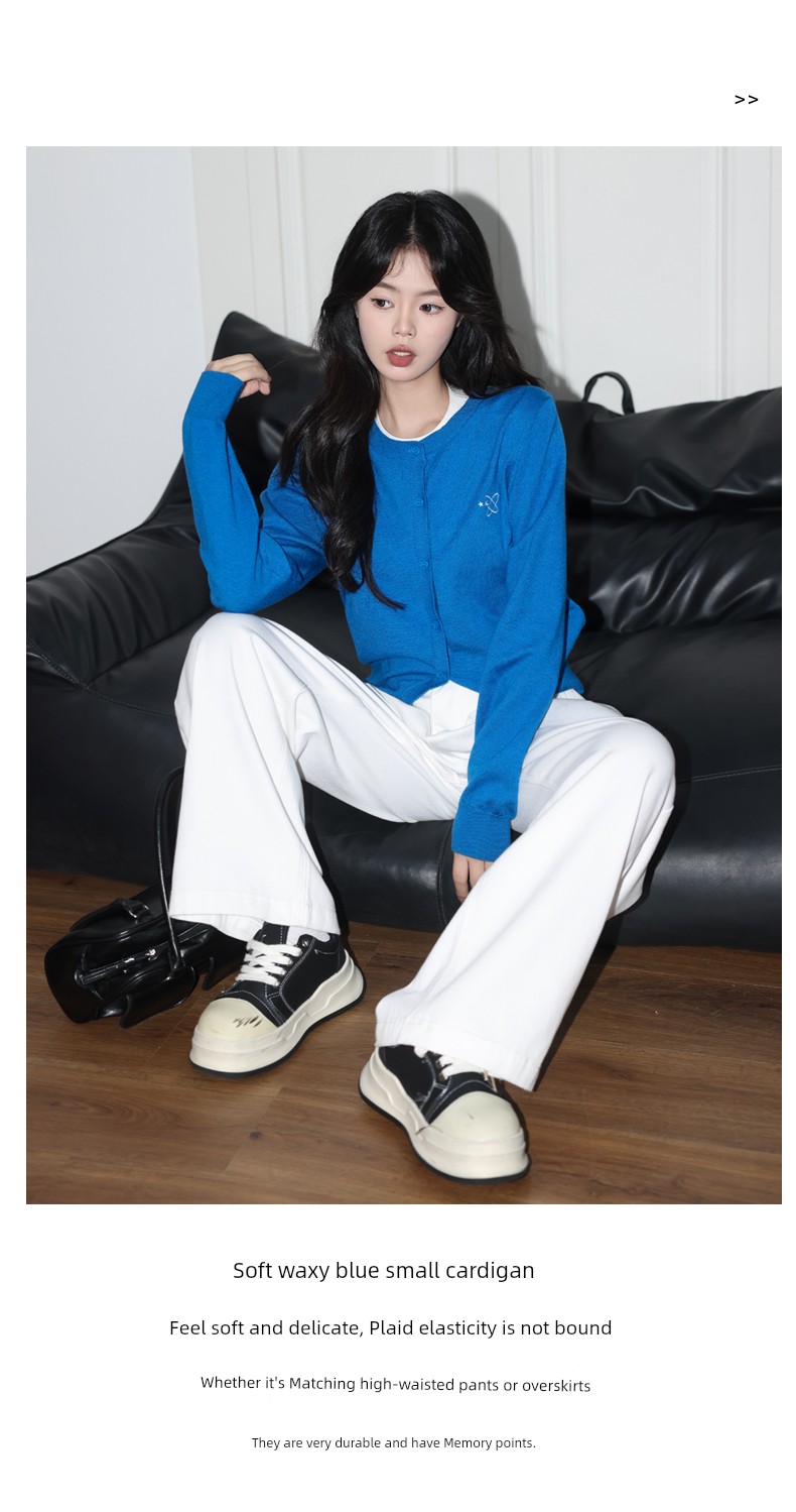 热卖Forever21克莱因蓝别致刺绣针织开衫女ins宽松上衣慵懒松弛感毛衣