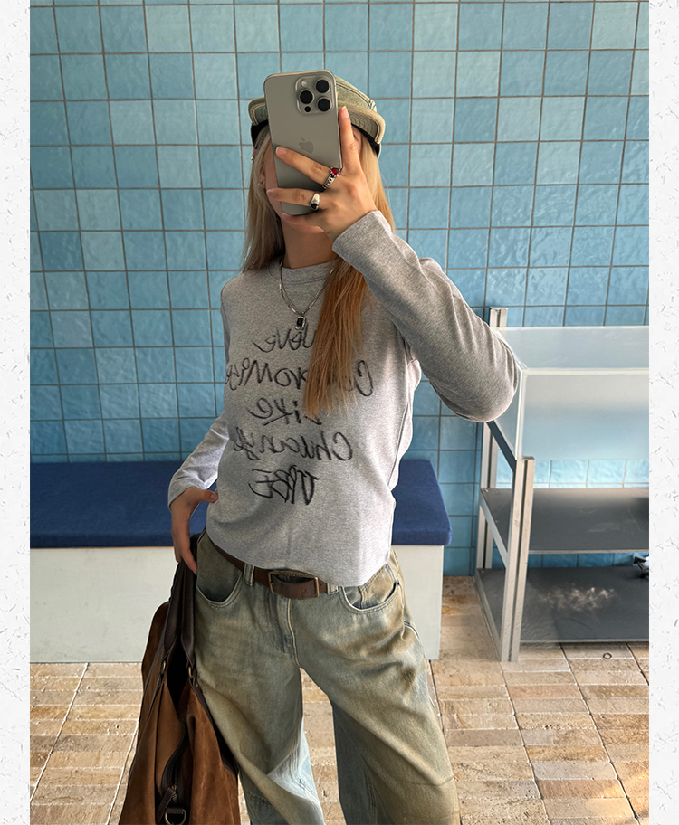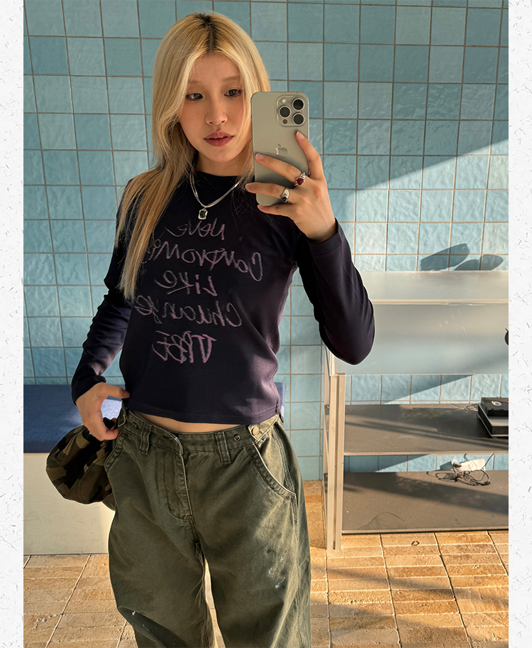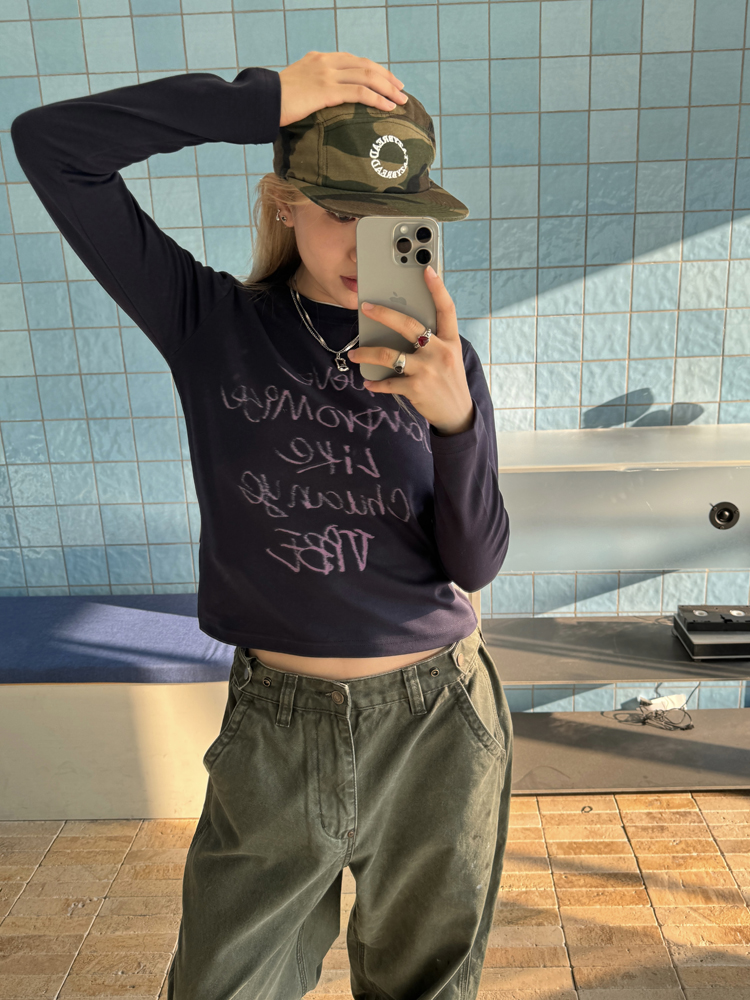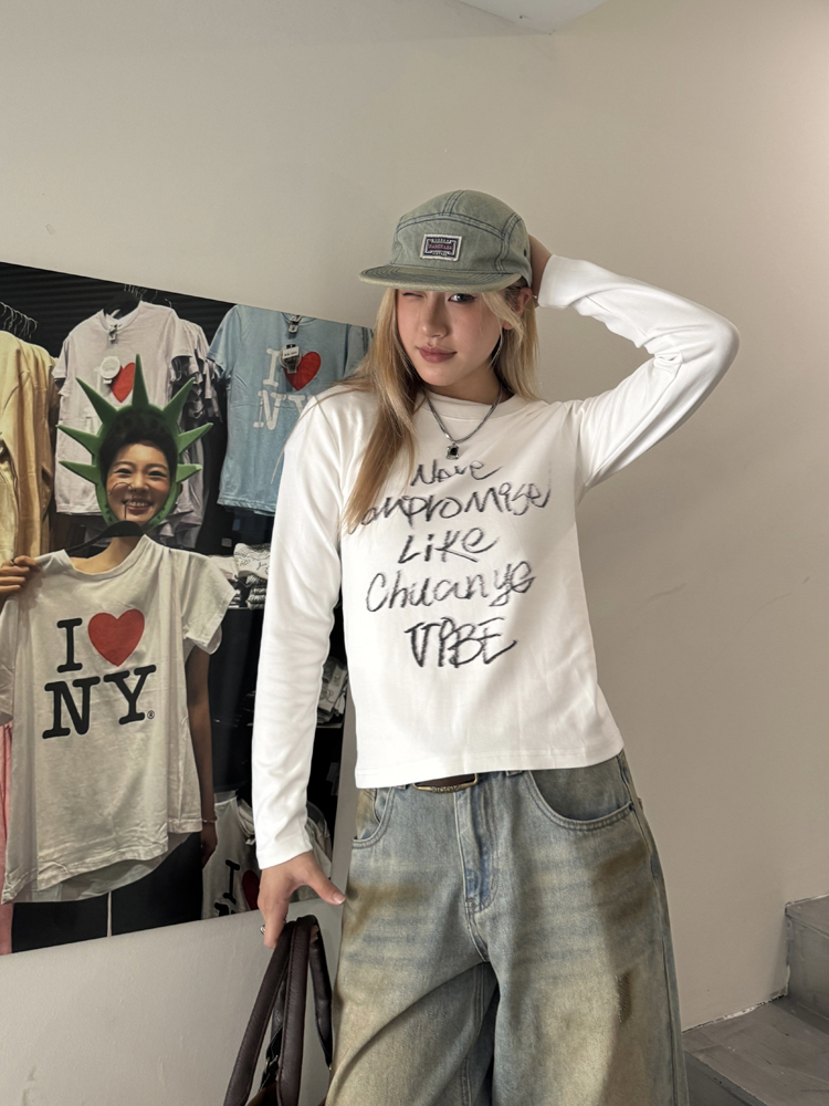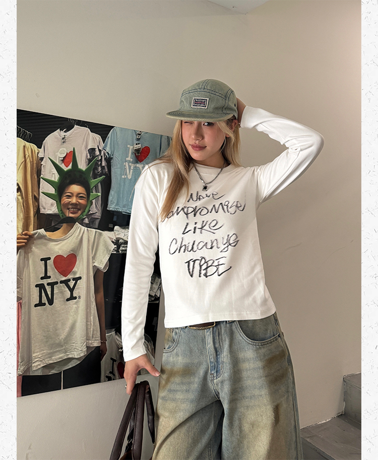 热卖正肩修身辣妹印花显瘦长袖T恤