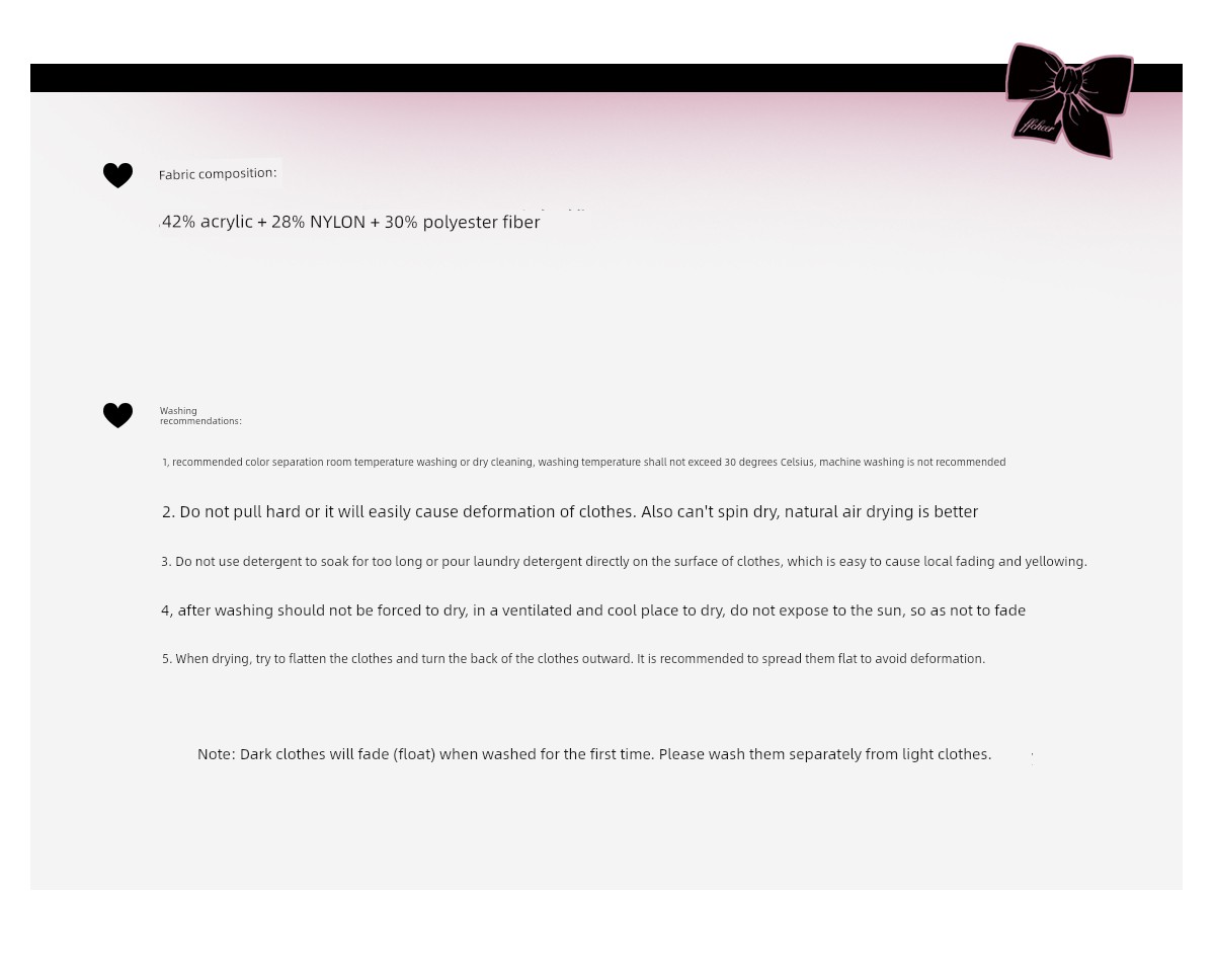 材质成分: 聚丙烯腈纤维(腈纶)42% 聚酯纤维30% 聚酰胺纤维(锦纶)28%
