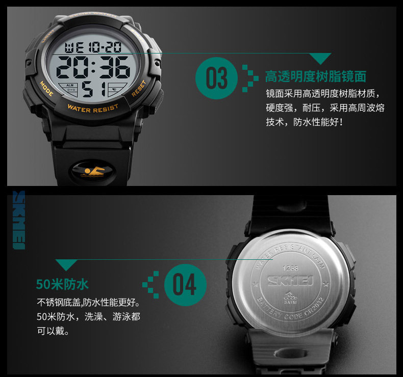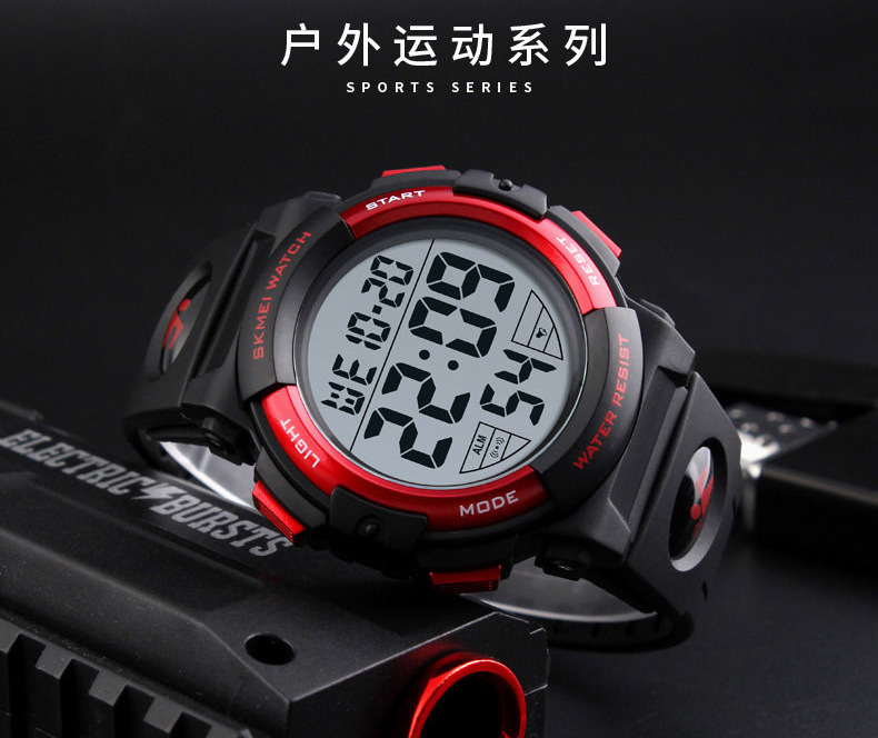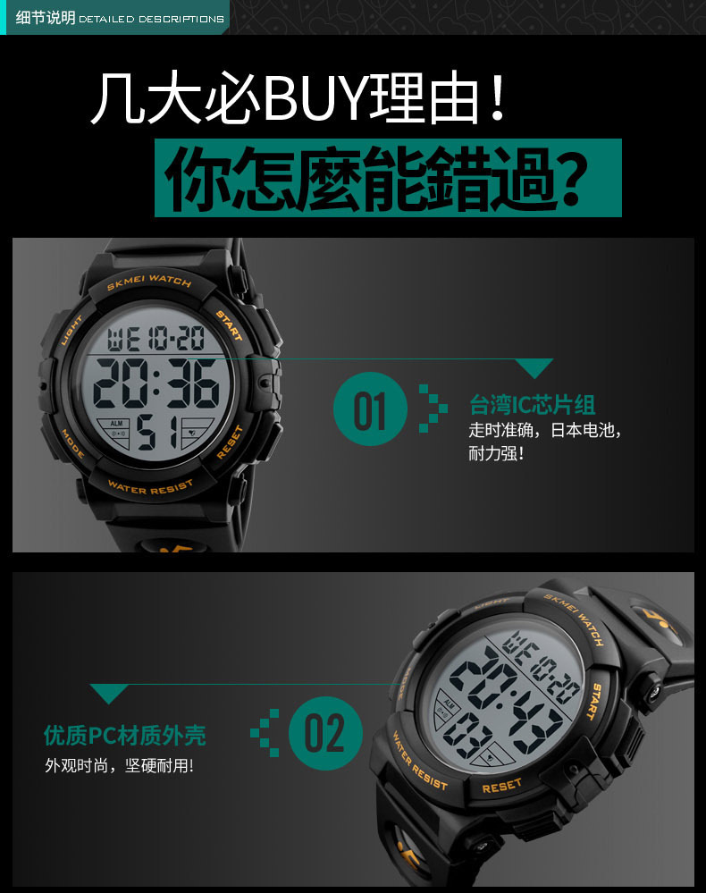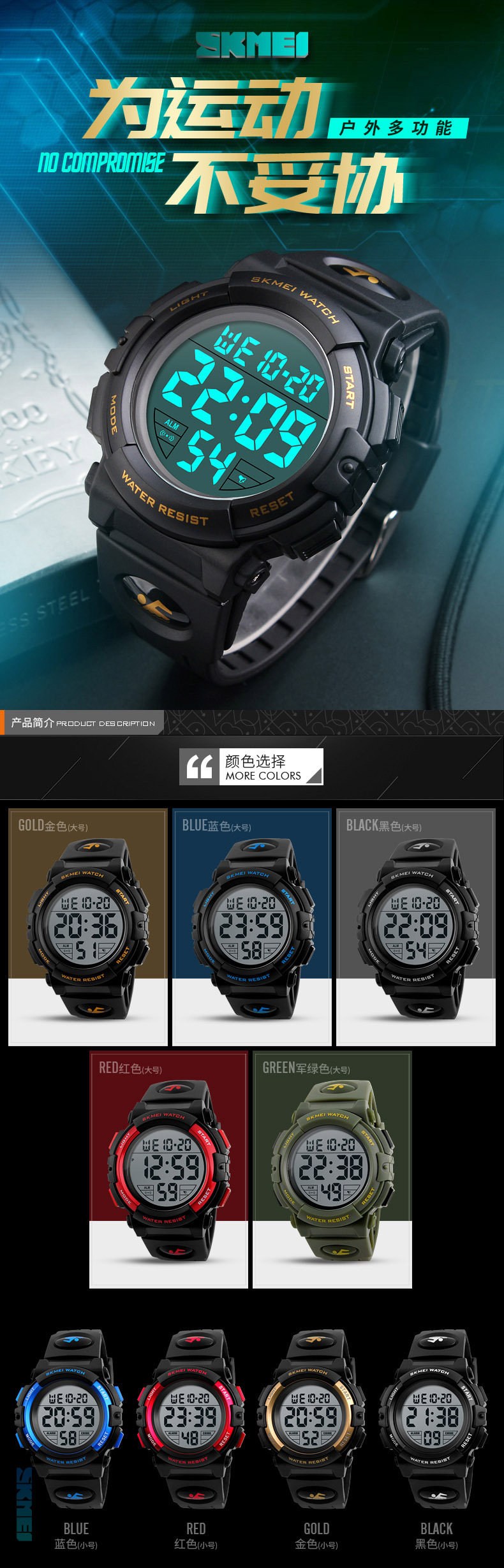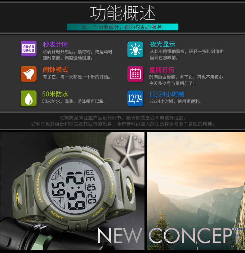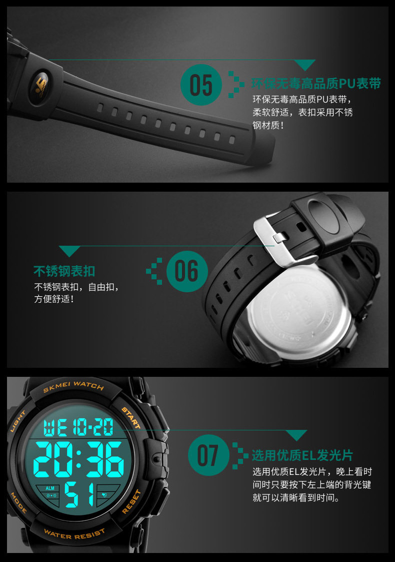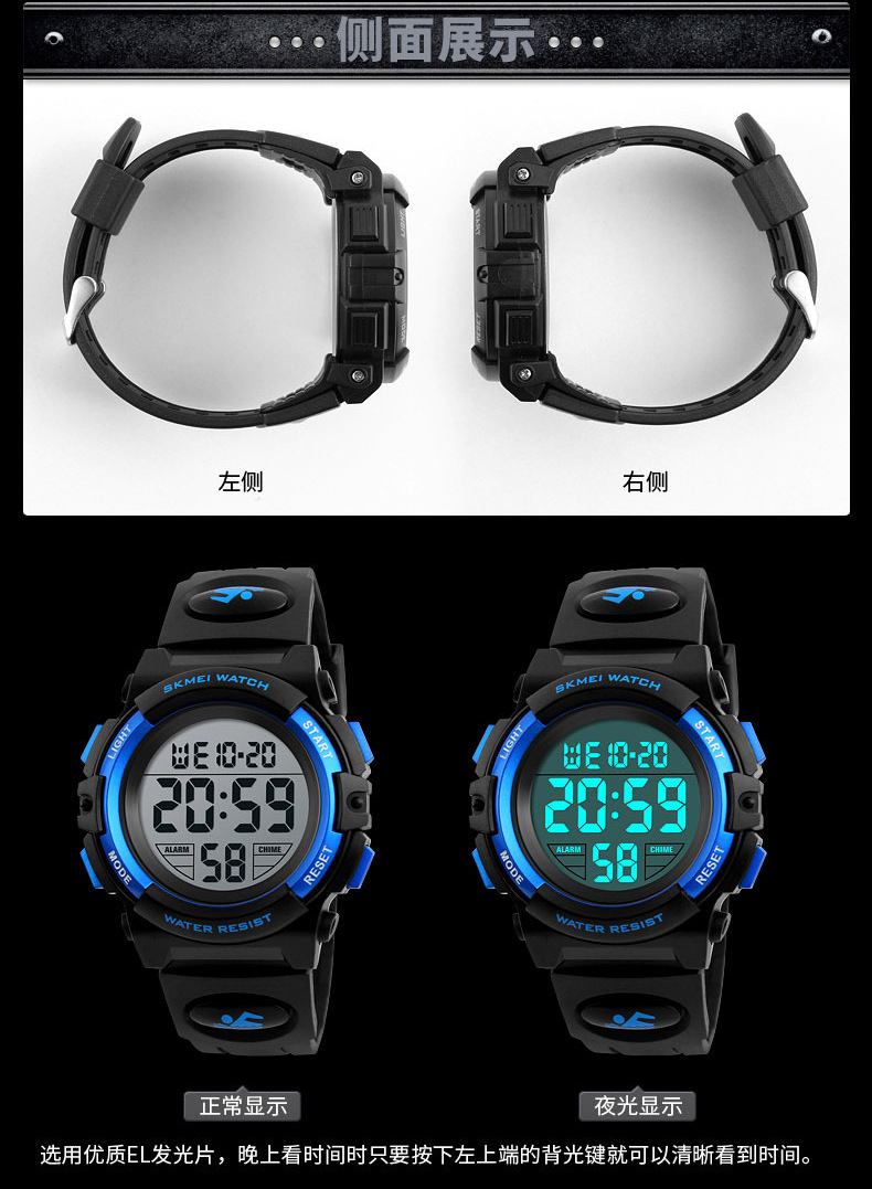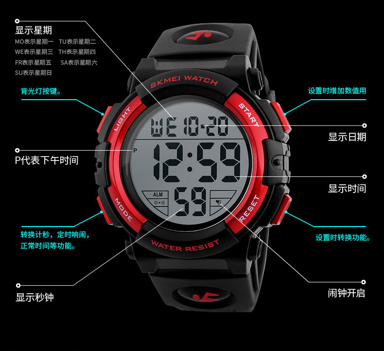 功能:显示时间、秒表计时、夜光、显示日期、定时响闹、显示星期、12/24小时制。