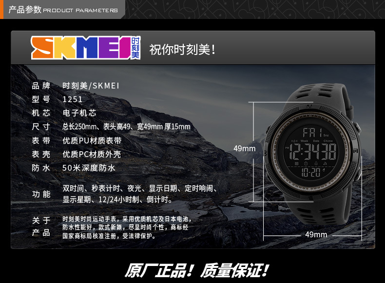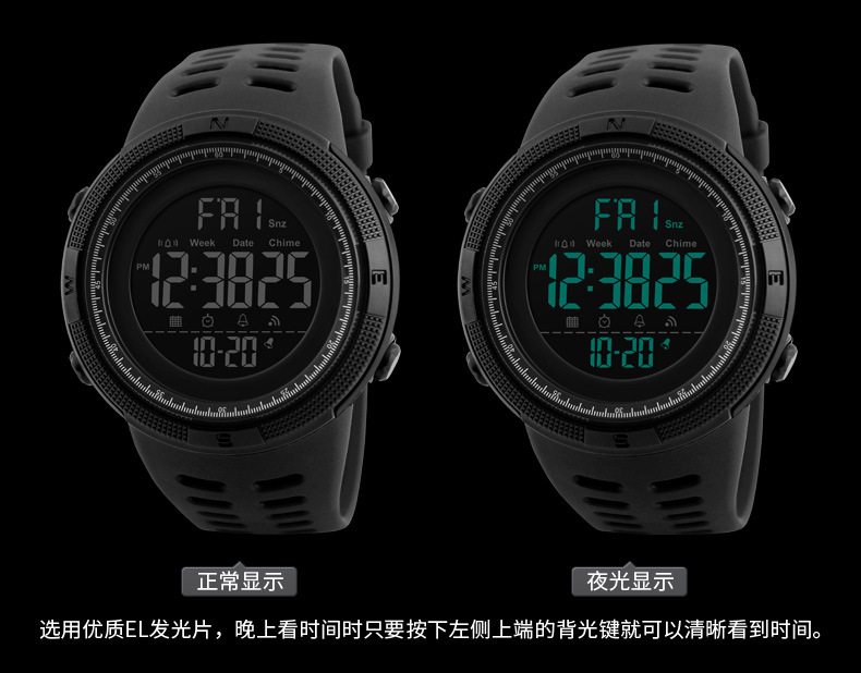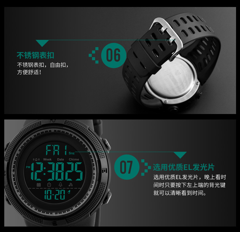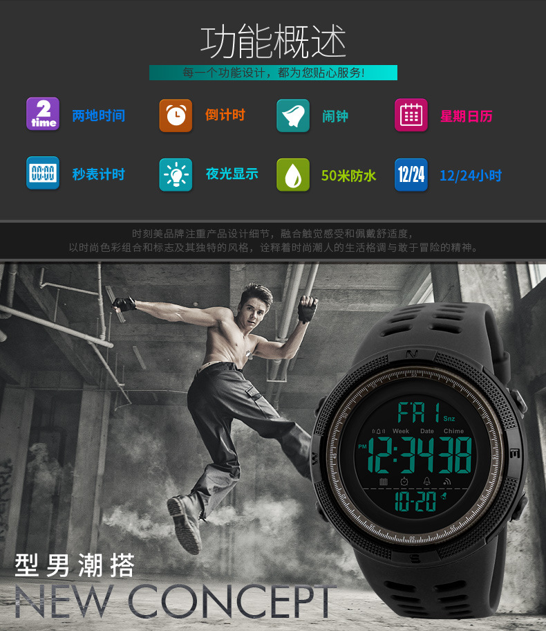 功能:双时间、秒表计时、夜光、显示日期、定时响闹、显示星期、12/24小时制、倒计时。