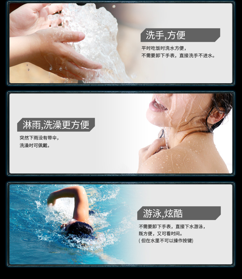 每款手表都支持30-50米(具体参数以页面标注为准)不同防水等级!满足日常用水场景!但不支持热水洗澡!